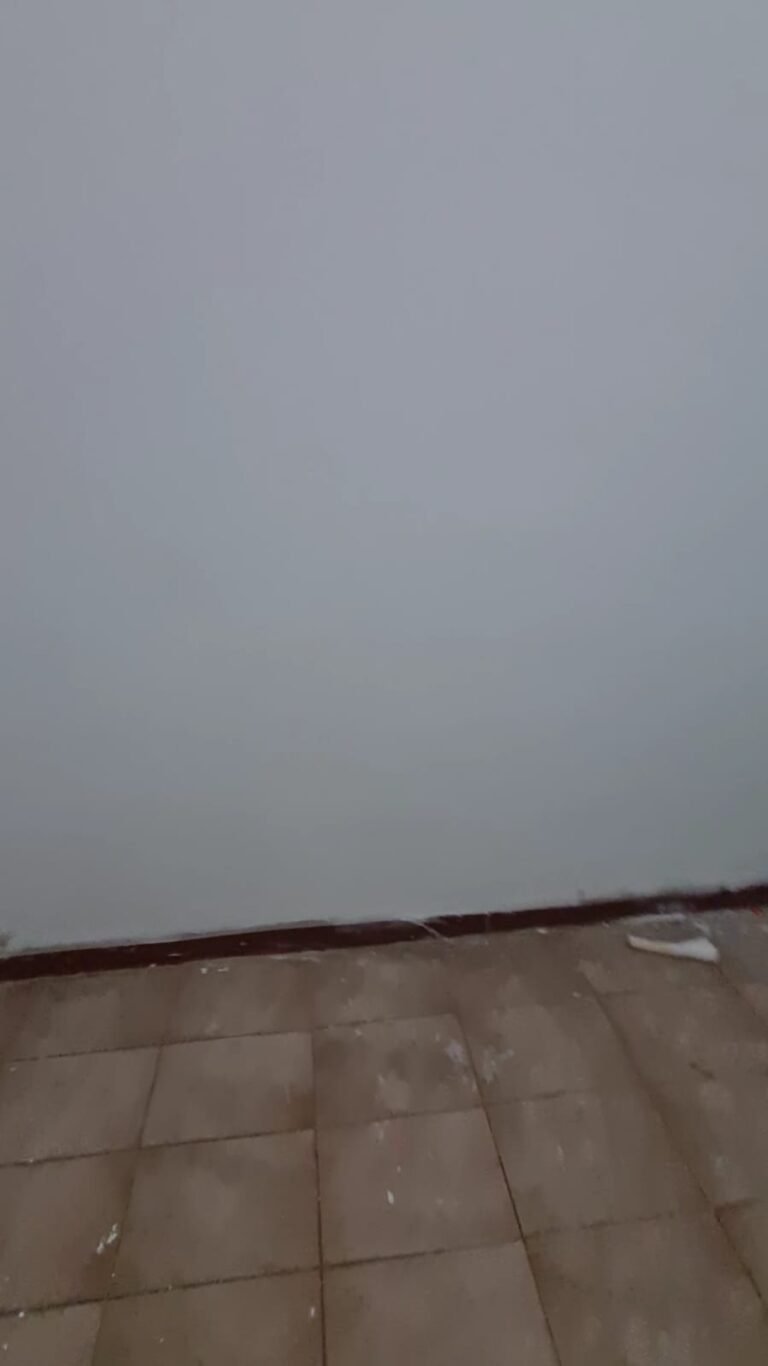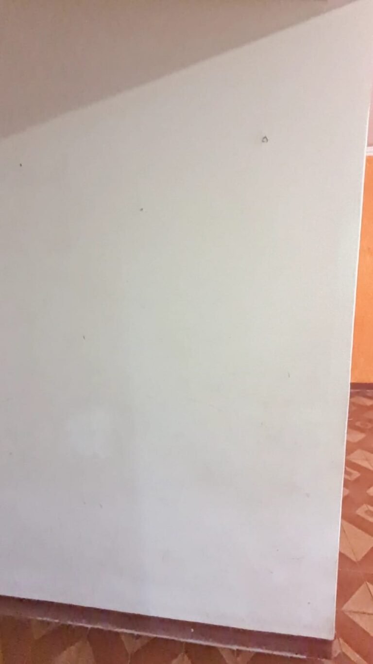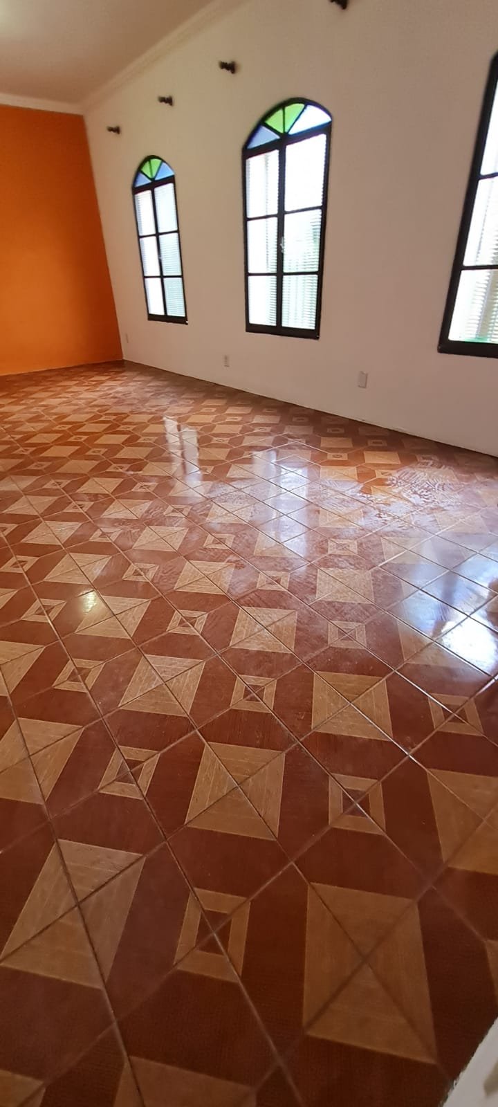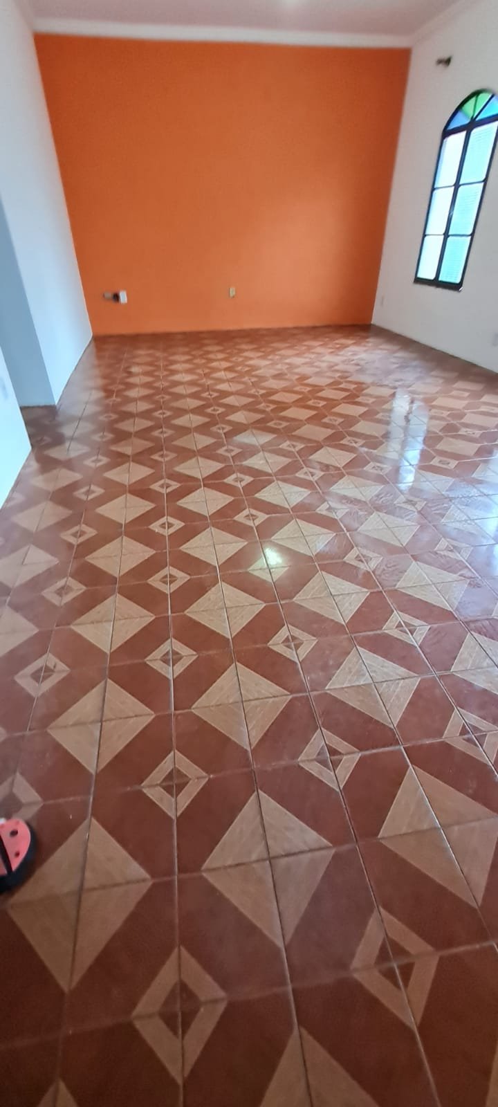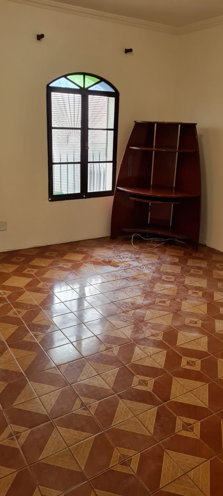Sala:- Paredes sujas sem pintura, buracos tampados de massa corrida branca, teto sujo, piso com manchas brancas, porta da sala enroscando para fechar, faltando 01 fechamento do varão cortina, rack quebrado.