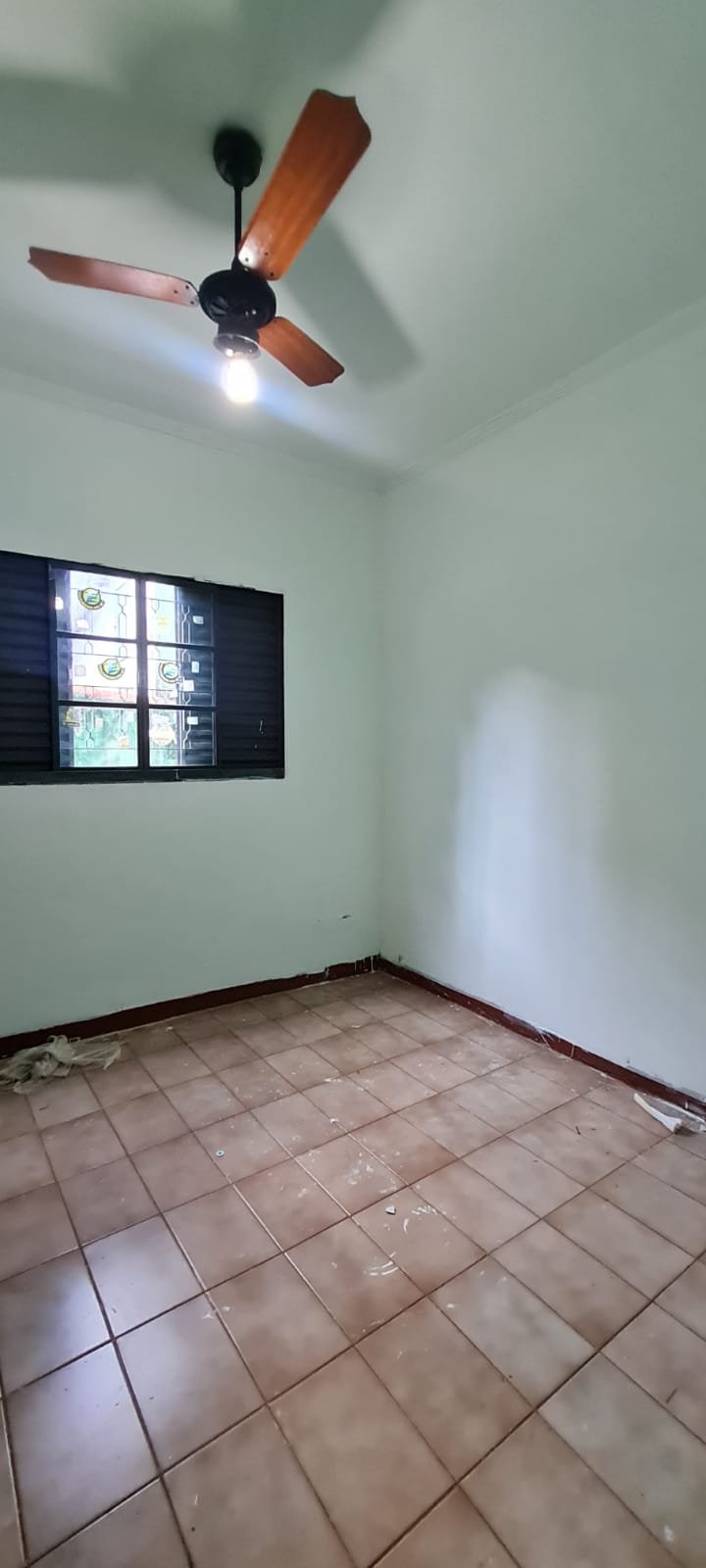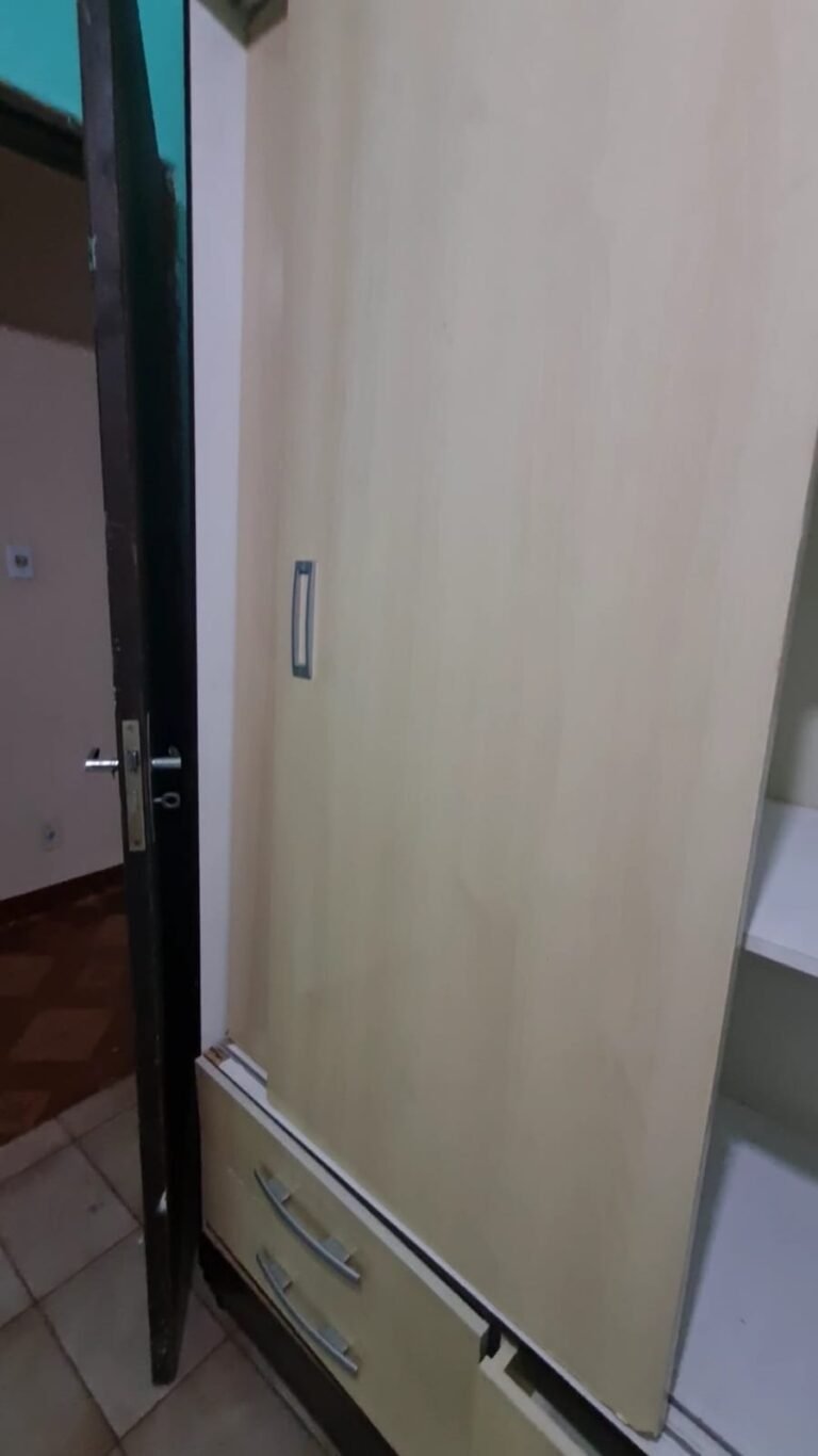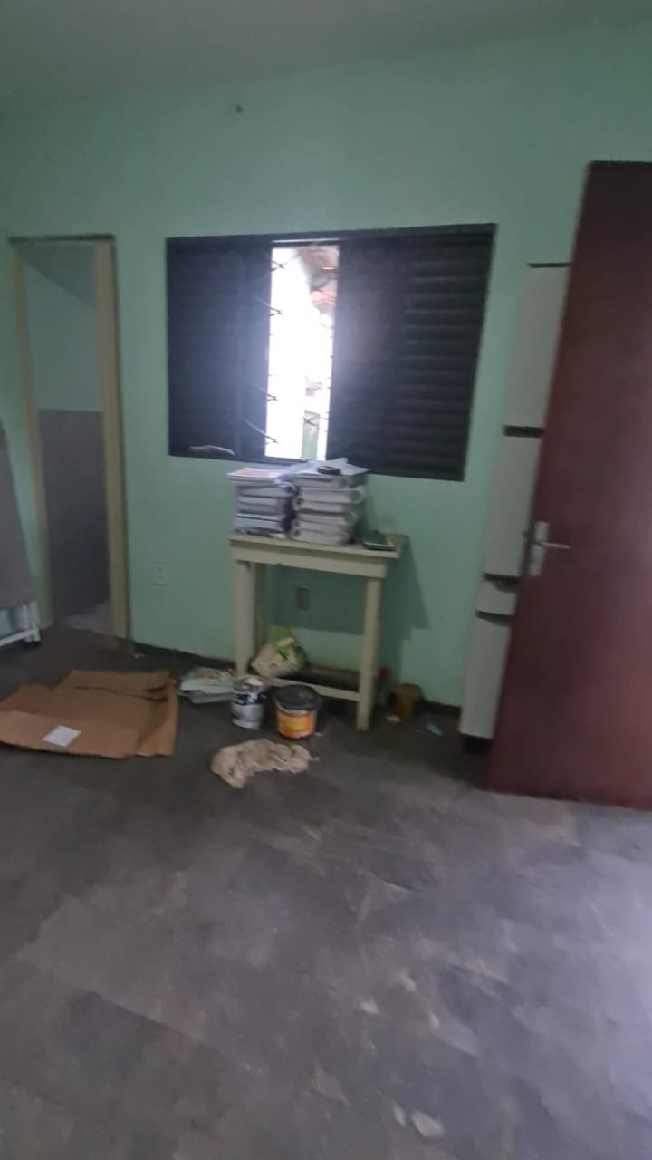 Um Quarto:- Paredes verde suja faltando pintura, parede clara com manchas rolo e descascando, piso com sujeira de tinta, rodapés com sujeira de tinta, armário com as 03 portas quebradas, 03 gavetas quebradas, faltando puxador e a tampa da gaveta, cadeado da janela sem a chave.
