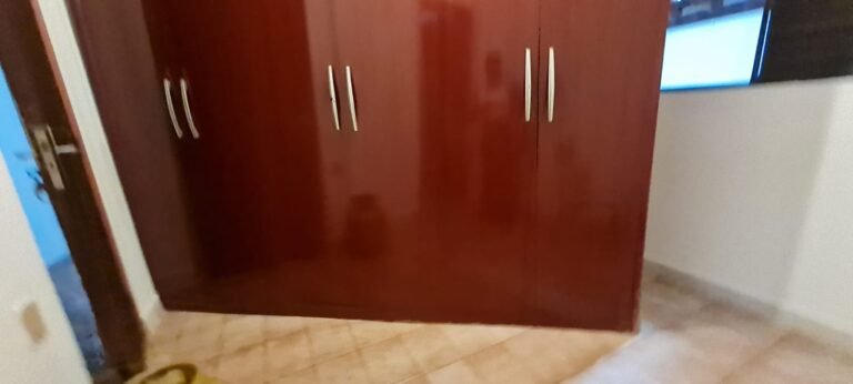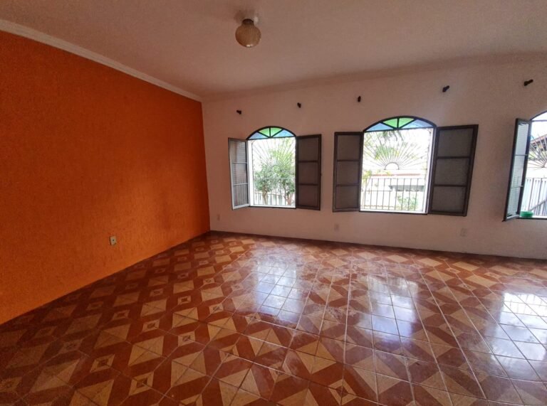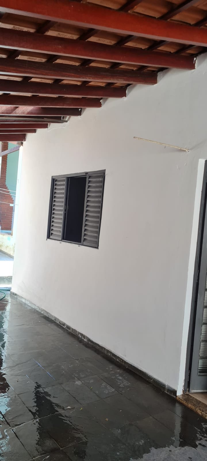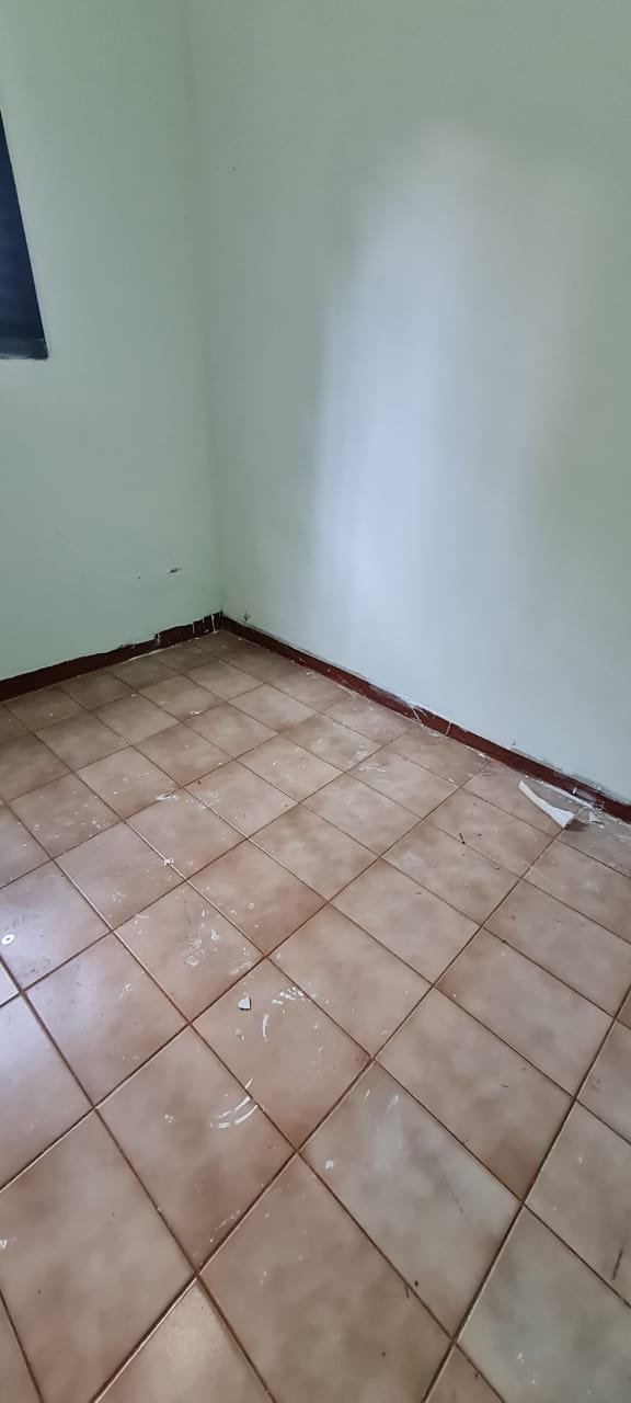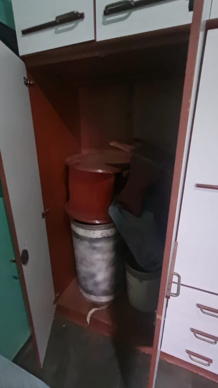 Um Quarto:- Paredes verde suja faltando pintura, parede clara com manchas rolo e descascando, piso com sujeira de tinta, rodapés com sujeira de tinta, armário com as 03 portas quebradas, 03 gavetas quebradas, faltando puxador e a tampa da gaveta, cadeado da janela sem a chave.