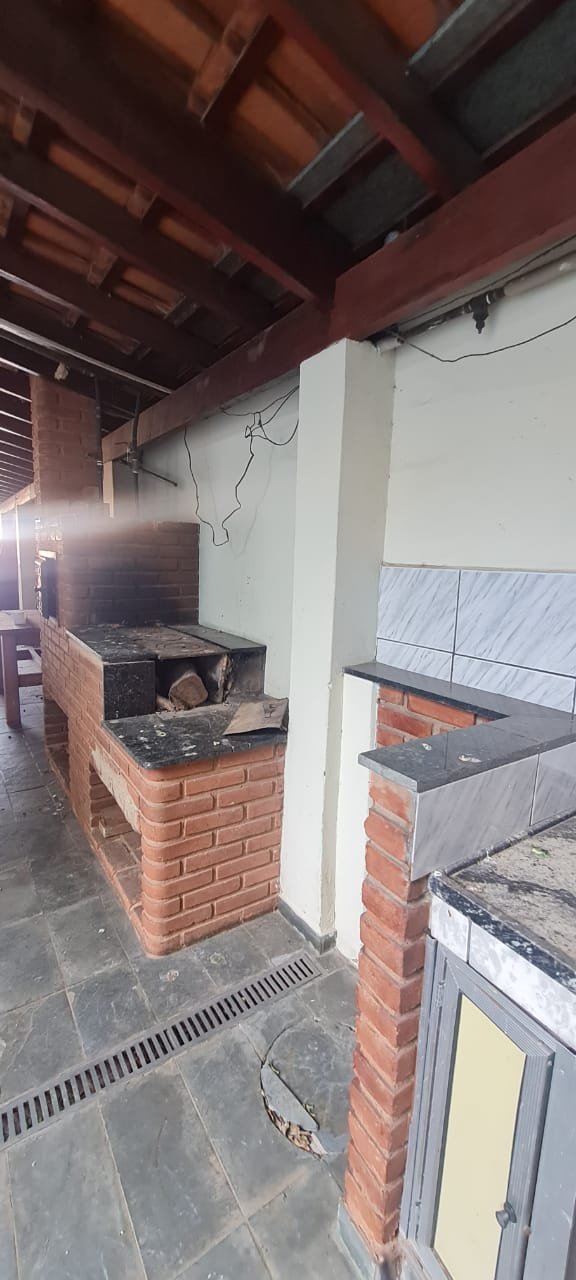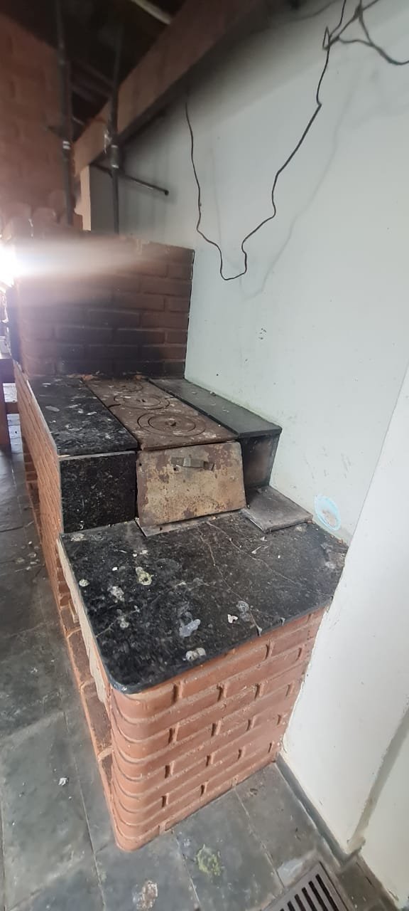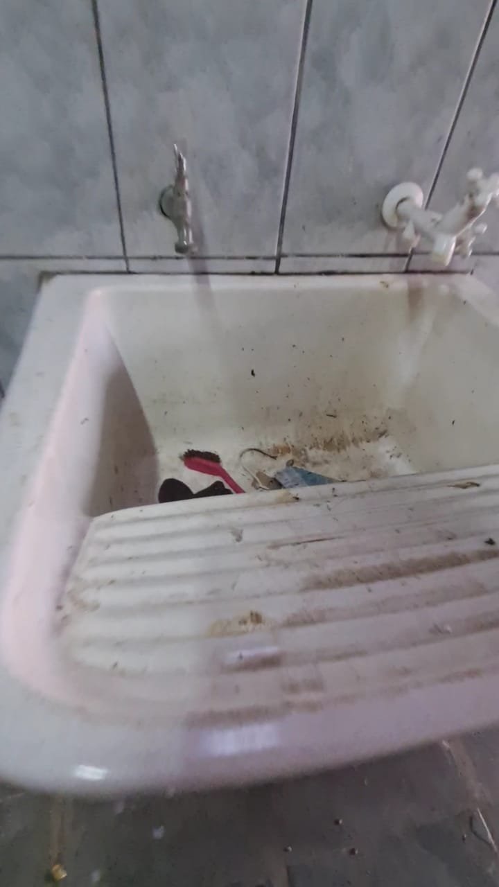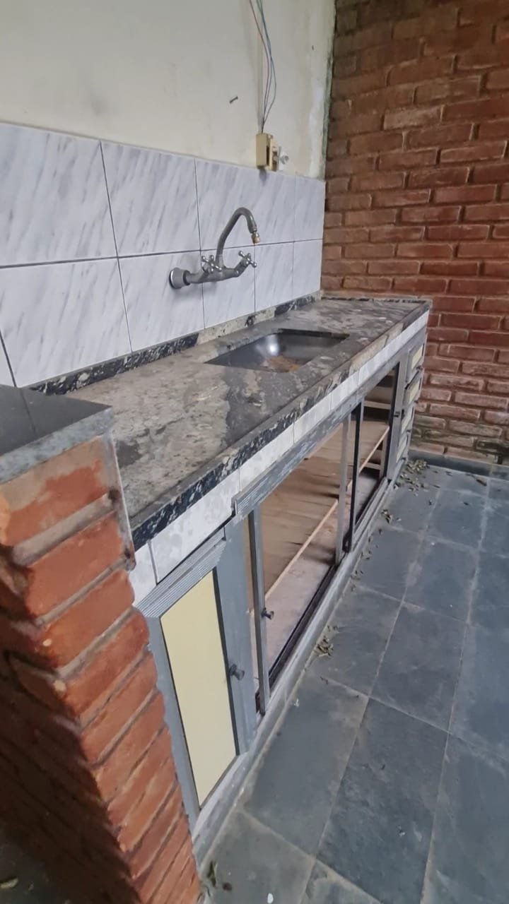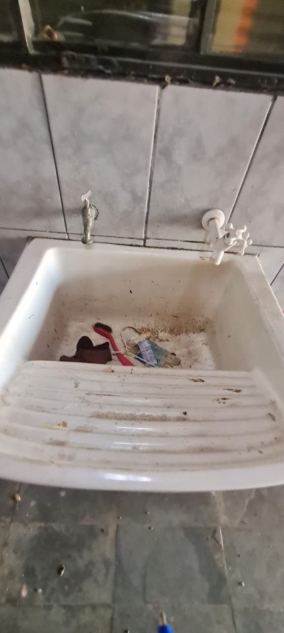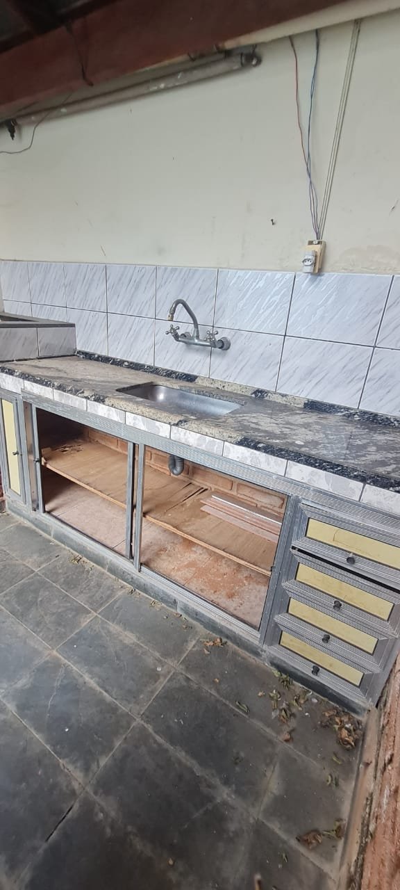 Área de Lazer:- Paredes sujas faltando pintura, ambiente sujo, móvel branco para descarte quebrado, 02 suporte da lâmpada florescente sem a tampa, tanque cerâmico sujo e com uma trinca, gabinete da pia sem as 02 portas e com as gavetas enroscando, 01 acabamento forno a lenha granito trincado, chapa quebrada, faltando vasos de planta.