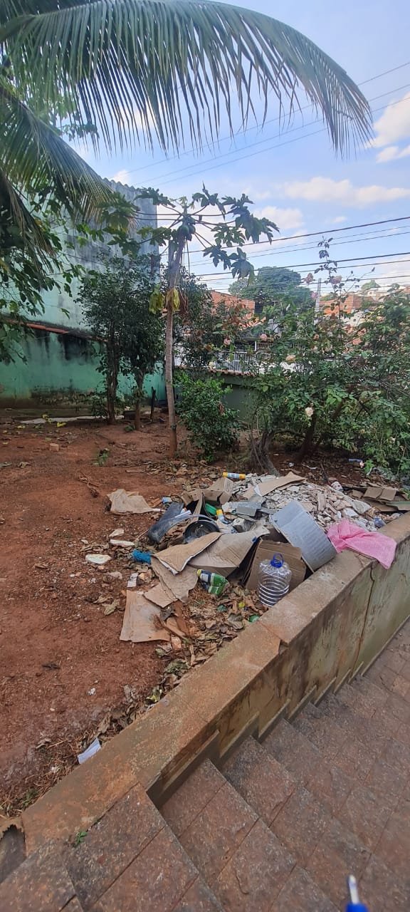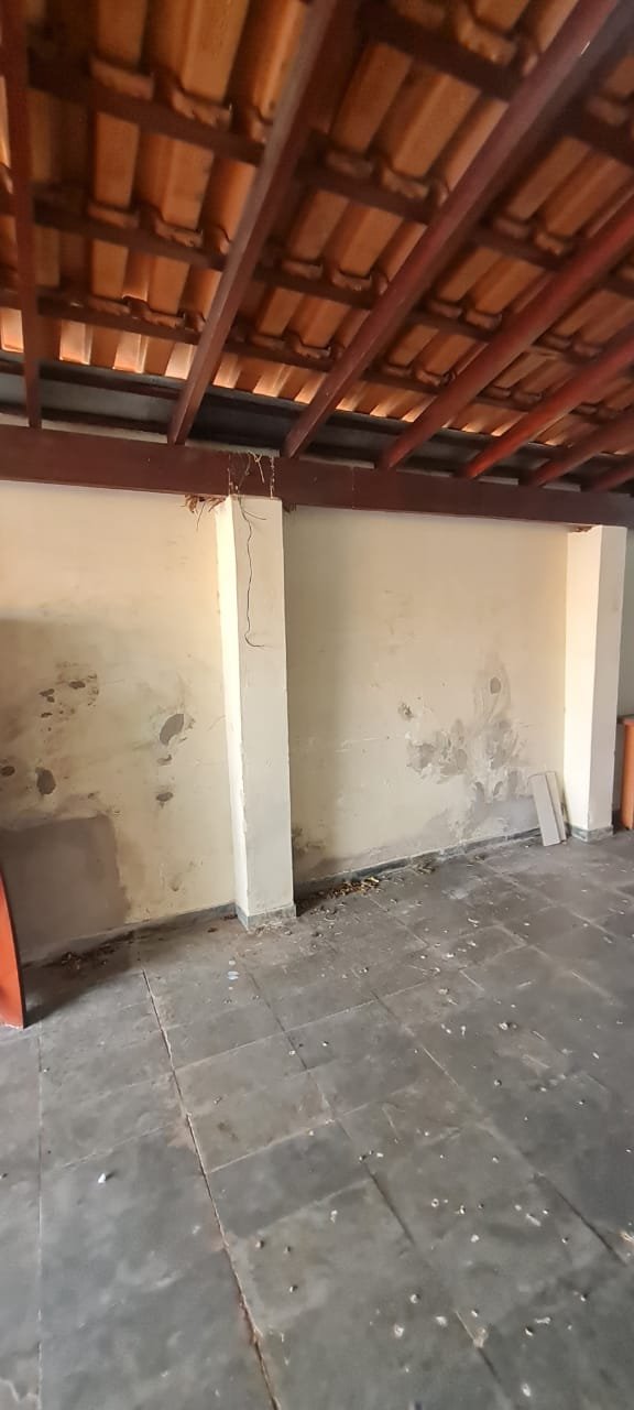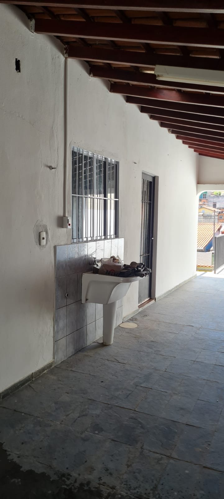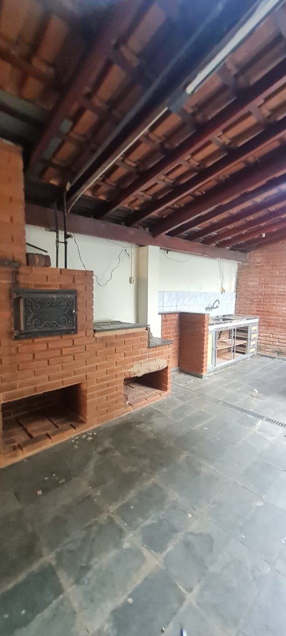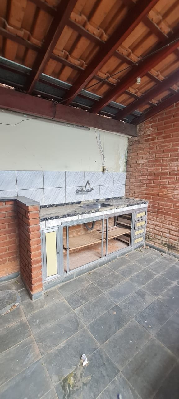 Área de Lazer:- Paredes sujas faltando pintura, ambiente sujo, móvel branco para descarte quebrado, 02 suporte da lâmpada florescente sem a tampa, tanque cerâmico sujo e com uma trinca, gabinete da pia sem as 02 portas e com as gavetas enroscando, 01 acabamento forno a lenha granito trincado, chapa quebrada, faltando vasos de planta.