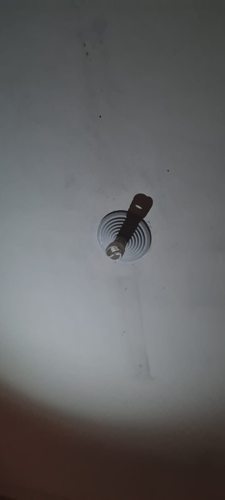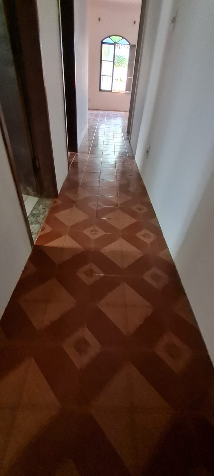 Corredor:- Paredes sujas sem pintura, faltando lâmpada, piso com manchas brancas.