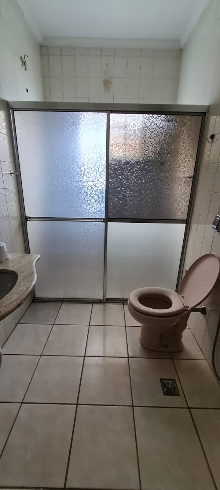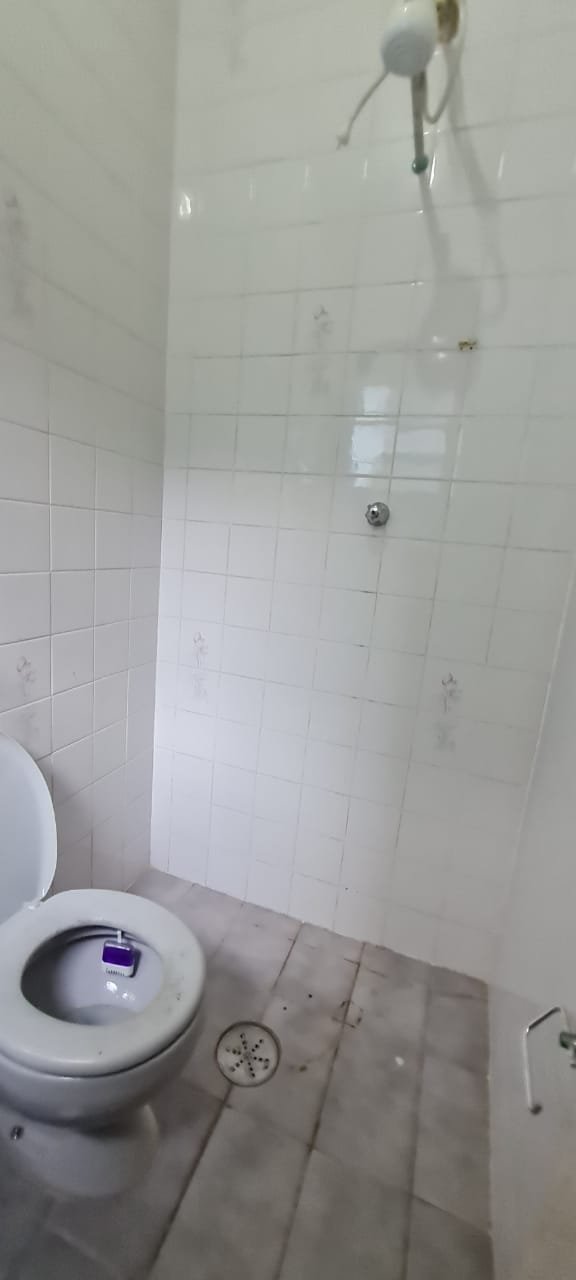WC Suíte:- Tampa do vaso sanitário mofado, teto sujo, chuveiro vasando no registro.