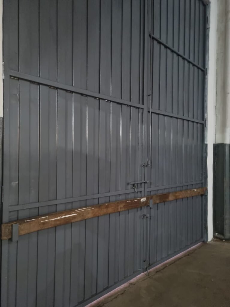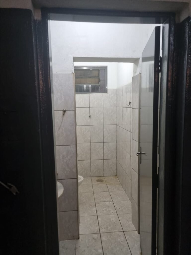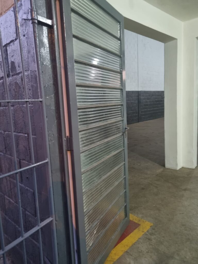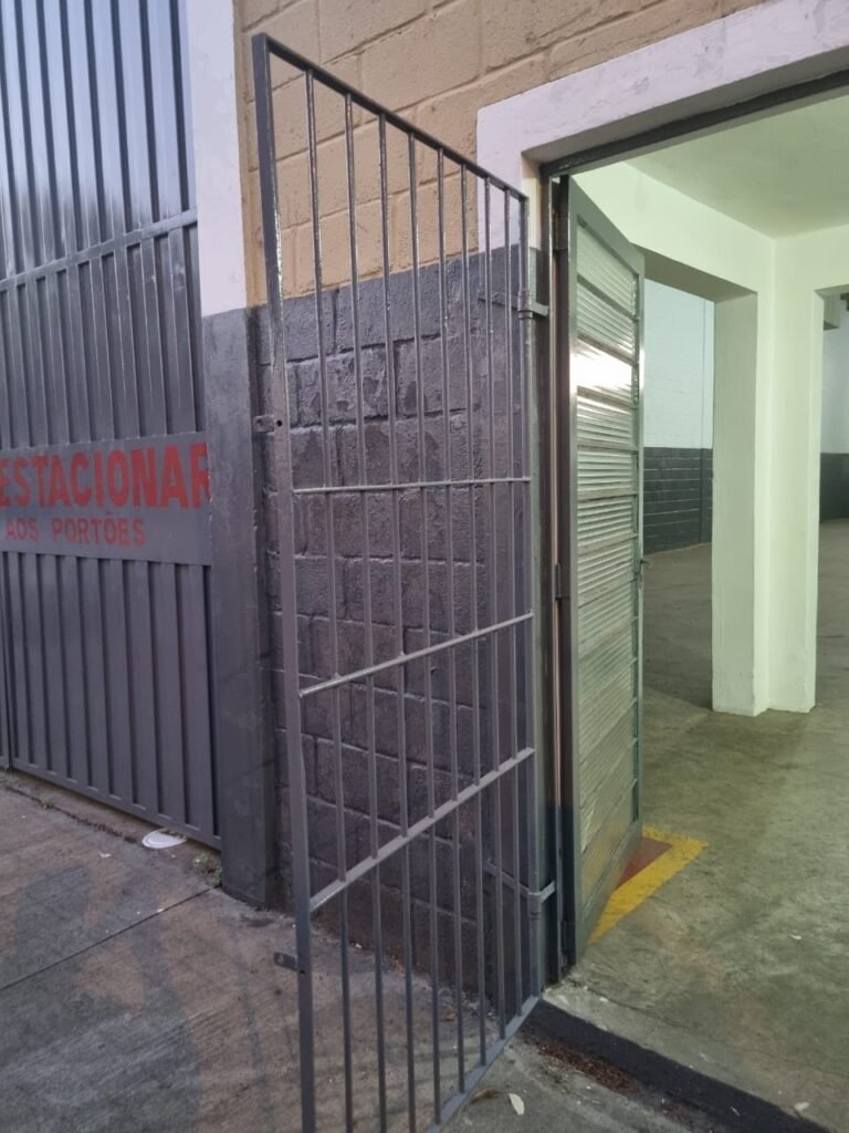 FUNDO GALPÃO:- Porta de ferro na cor cinza em ordem, sem fechadura somente suporte para cadeados em ordem, recuo coberto com telhas galvanizadas em ordem, paredes com bloco aparente sem pintura, piso com concreto nas laterais e pedras de brita no meio em ordem, degrau avariado do lado que fica encostado na parede do galpão.