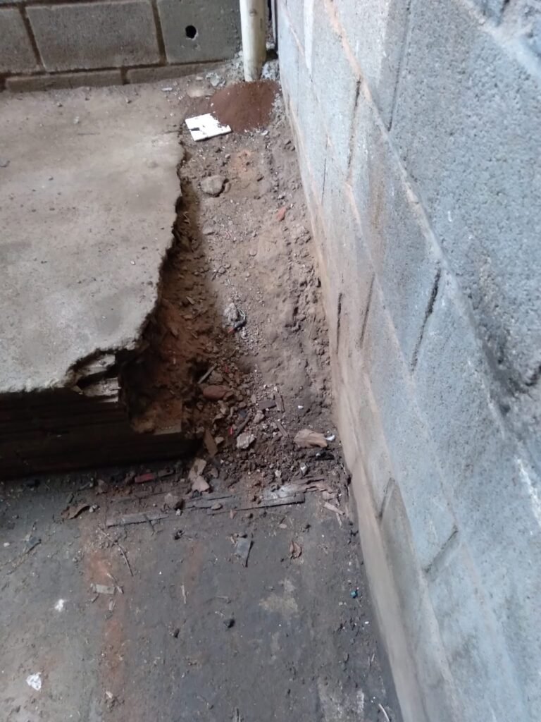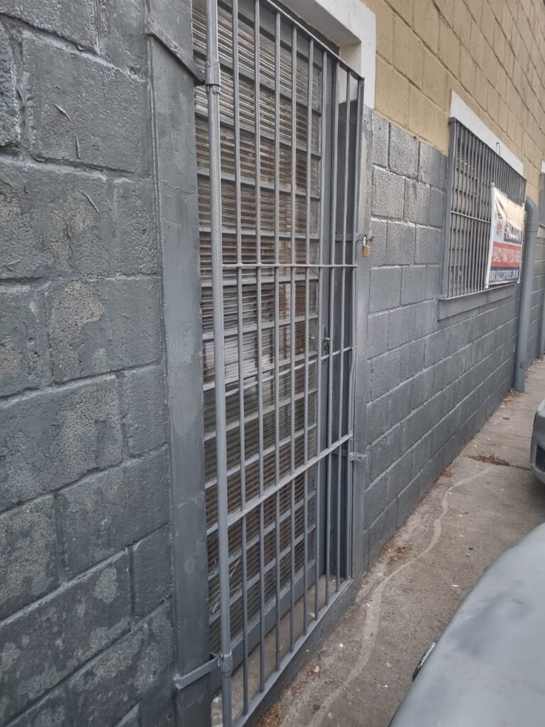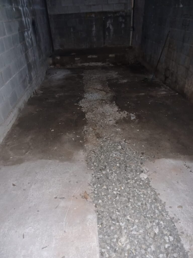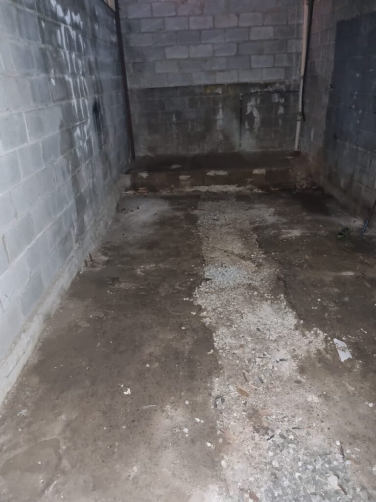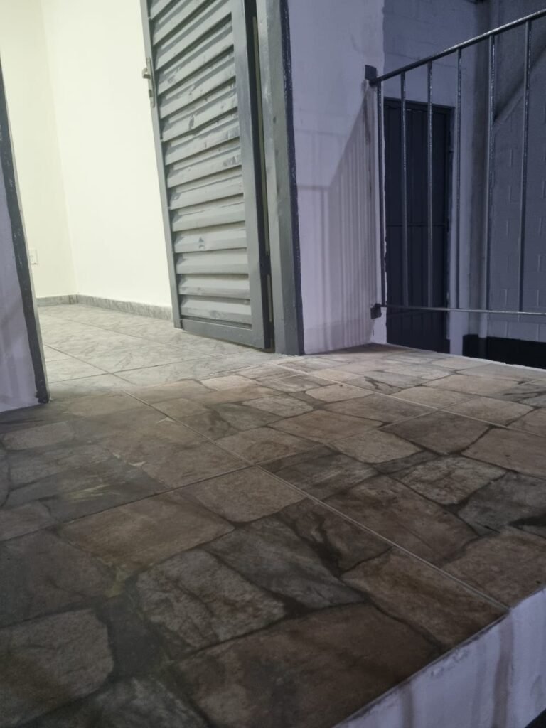 FUNDO GALPÃO:- Porta de ferro na cor cinza em ordem, sem fechadura somente suporte para cadeados em ordem, recuo coberto com telhas galvanizadas em ordem, paredes com bloco aparente sem pintura, piso com concreto nas laterais e pedras de brita no meio em ordem, degrau avariado do lado que fica encostado na parede do galpão.