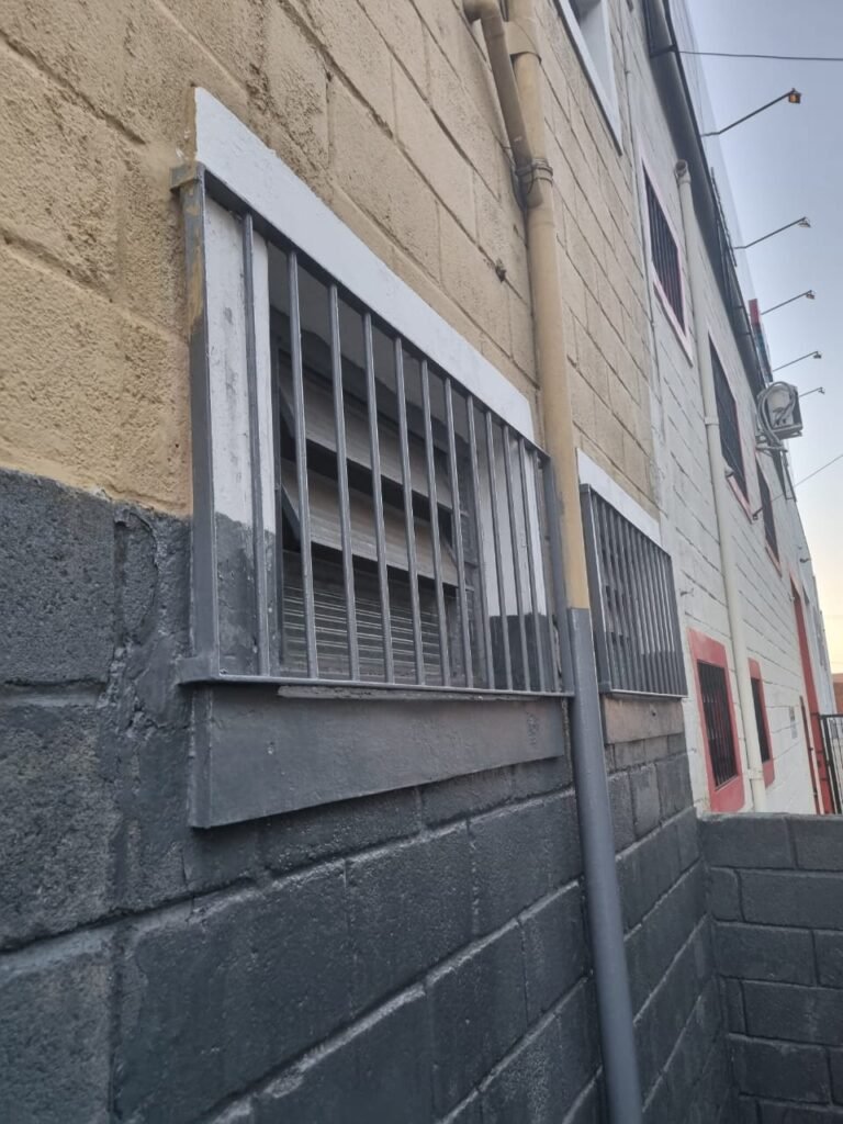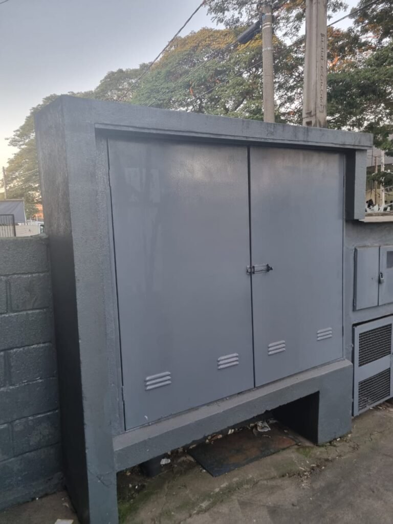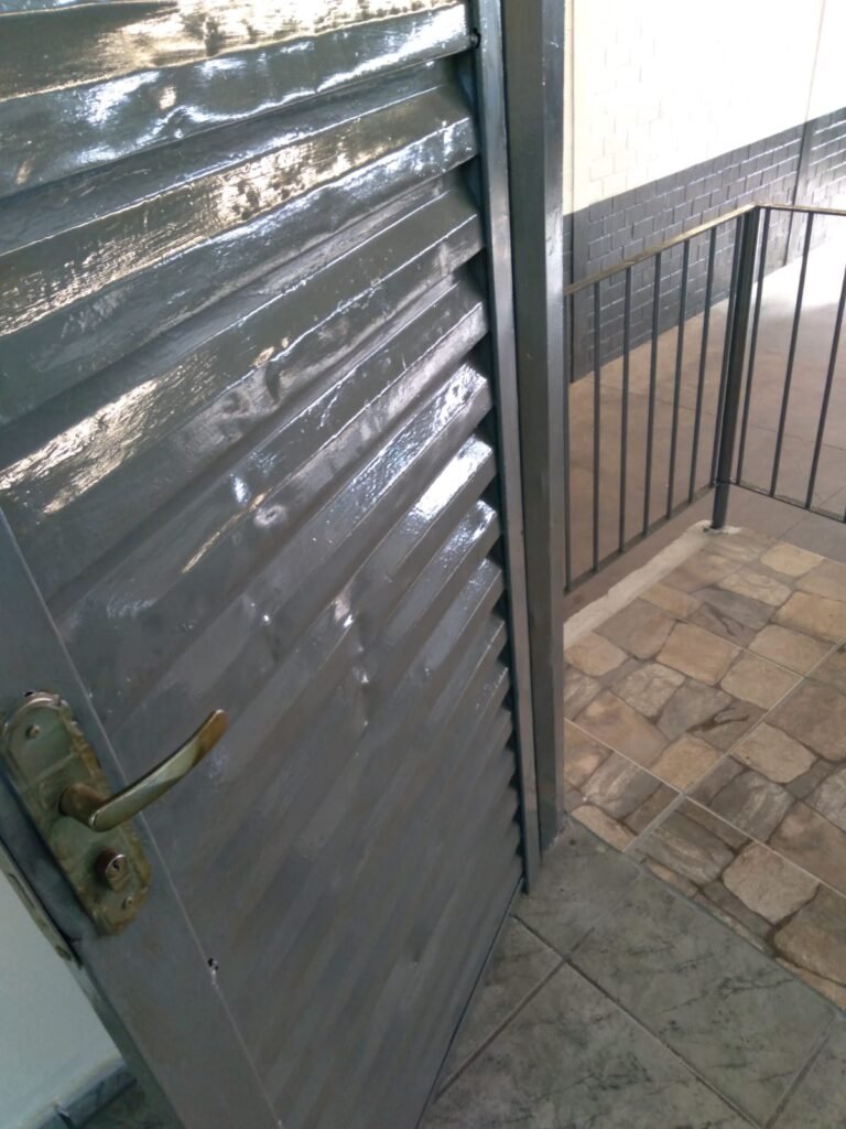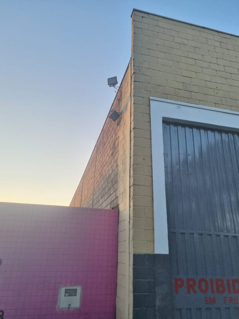 FACHADA:- Calçada com concreto com trincos e remendo próximo a guia da entrada de veículos restante em ordem, 01 lixeira com pintura na cor grafite em ordem, 02 holofotes LED 50w na fechadura frontal, 01 portão entrada de caminhões duas abas de chapa dobrada com pintura nova na cor grafite com letras em tinta vermelha em ordem, portão social grade e cadeado com chave em ordem, porta de vidro com pintura nova na cor cinza em ordem, fachada com blocos aparente e pintura látex nova sendo barrado no cor grafite e restante marrom com detalhes das janelas em branco neve em ordem, piso concreto usinado sem marcação de faixa, quadro de energia em ordem, padrão de água com grade e cadeado em ordem, painel de ferro sem marcadores na cor cinza em ordem, poste de energia em sem transformador, grade de proteção na porta social e nos 03 vitrôs de ferro com pintura na cor grafite em ordem.