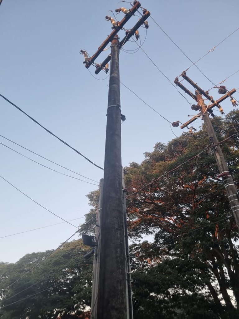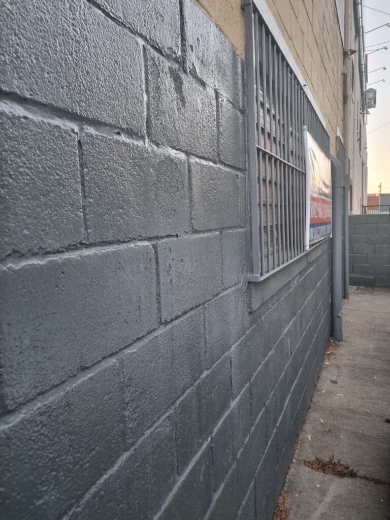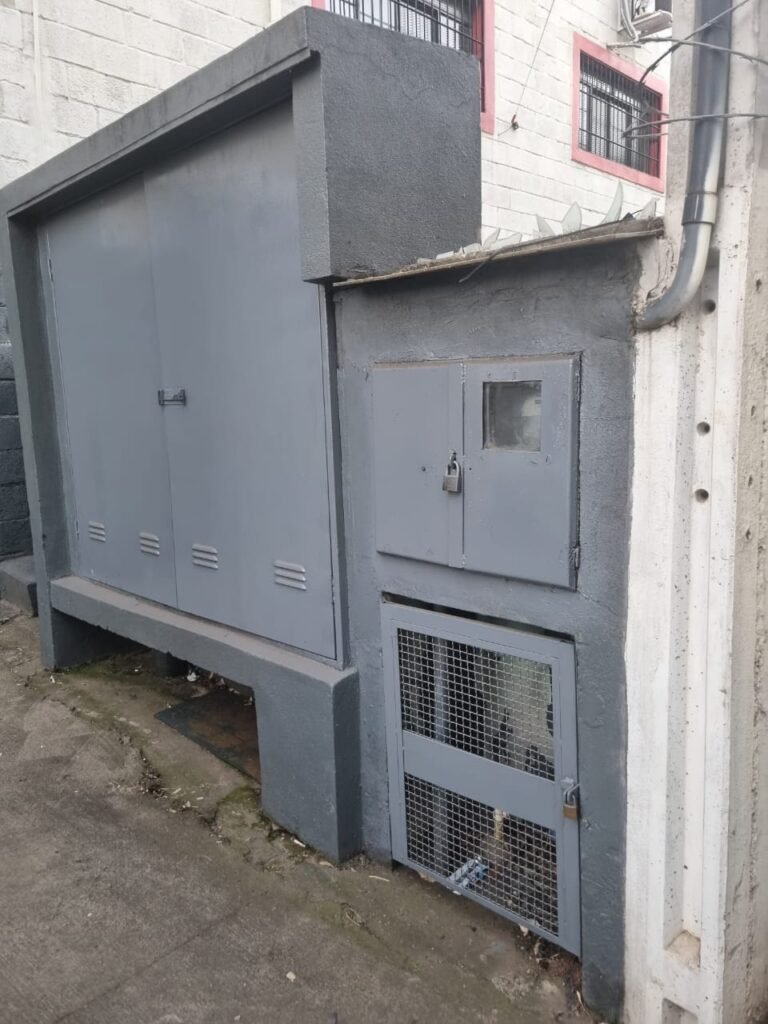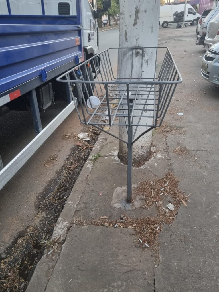 FACHADA:- Calçada com concreto com trincos e remendo próximo a guia da entrada de veículos restante em ordem, 01 lixeira com pintura na cor grafite em ordem, 02 holofotes LED 50w na fechadura frontal, 01 portão entrada de caminhões duas abas de chapa dobrada com pintura nova na cor grafite com letras em tinta vermelha em ordem, portão social grade e cadeado com chave em ordem, porta de vidro com pintura nova na cor cinza em ordem, fachada com blocos aparente e pintura látex nova sendo barrado no cor grafite e restante marrom com detalhes das janelas em branco neve em ordem, piso concreto usinado sem marcação de faixa, quadro de energia em ordem, padrão de água com grade e cadeado em ordem, painel de ferro sem marcadores na cor cinza em ordem, poste de energia em sem transformador, grade de proteção na porta social e nos 03 vitrôs de ferro com pintura na cor grafite em ordem.