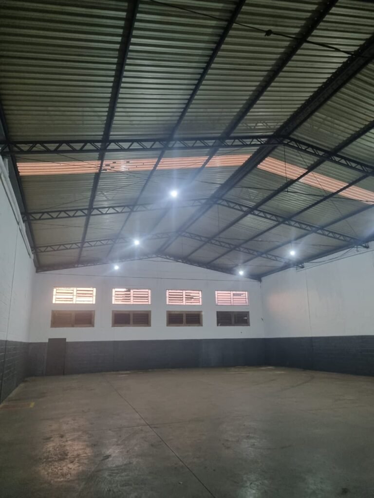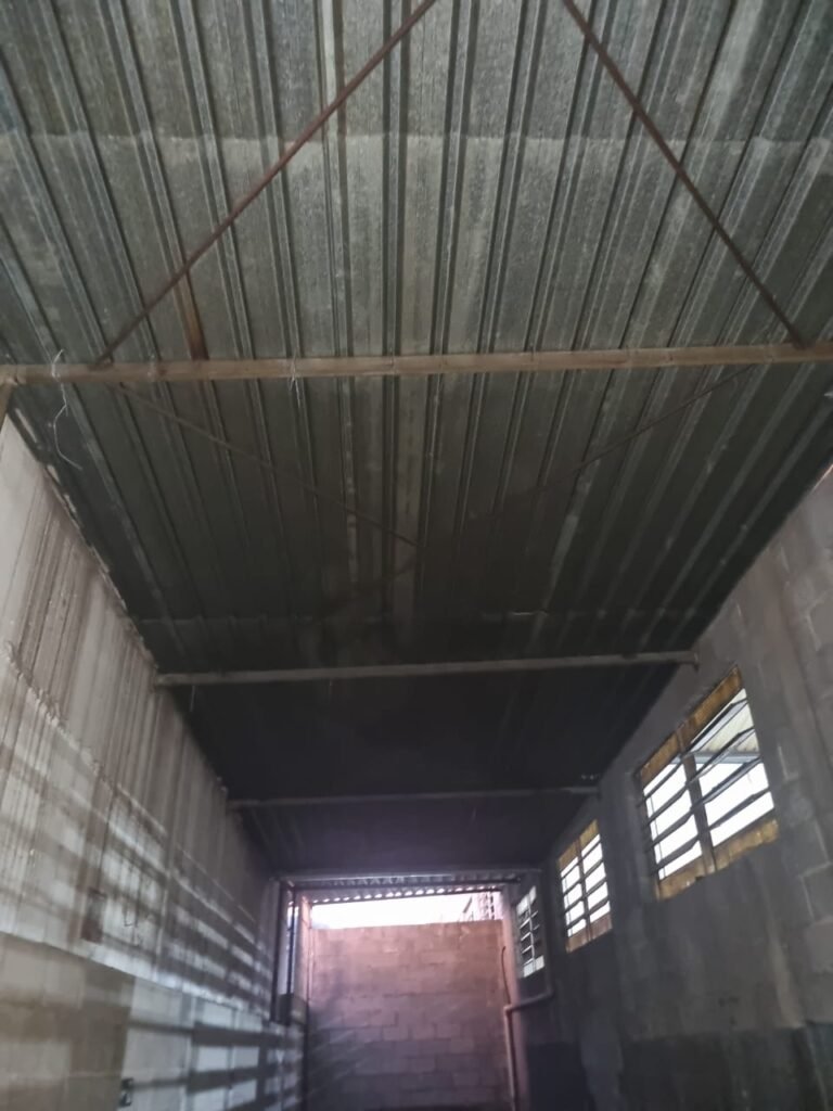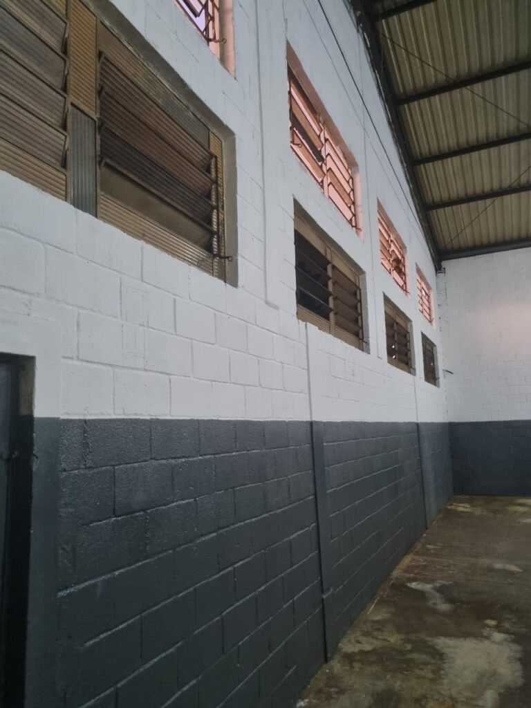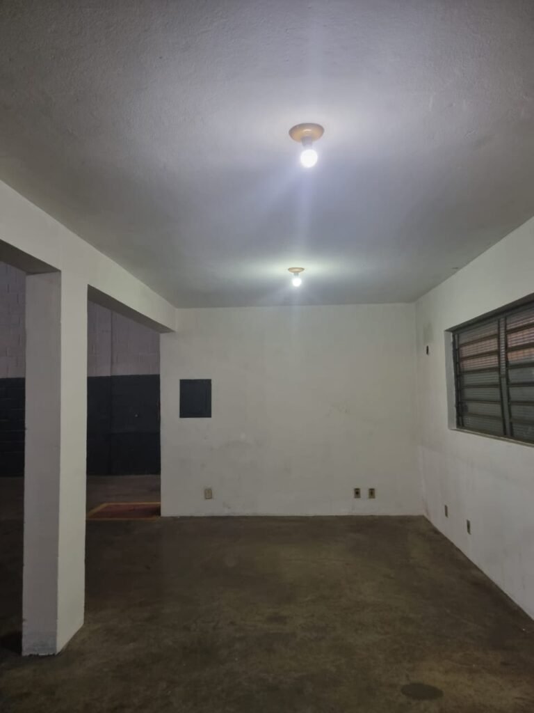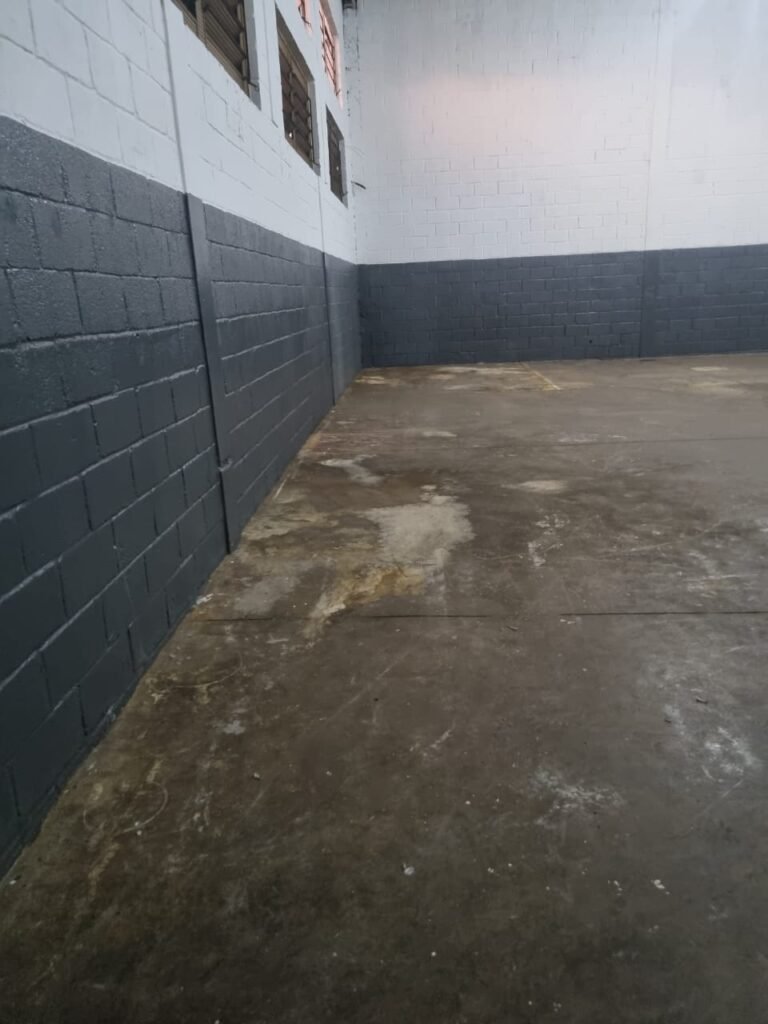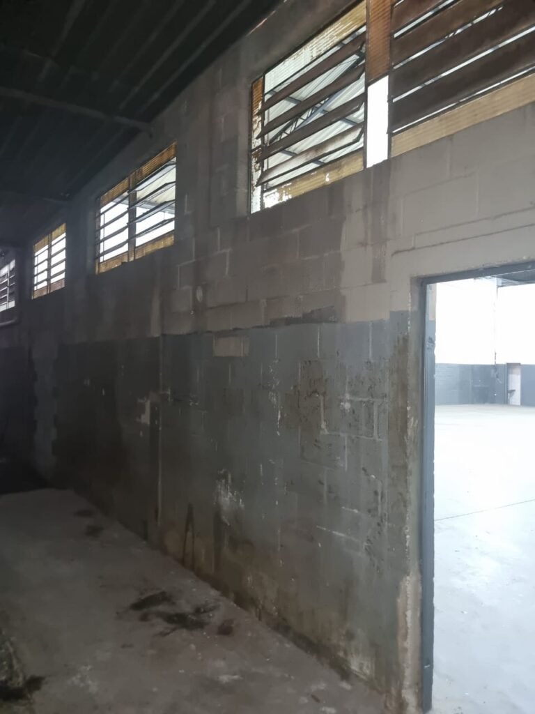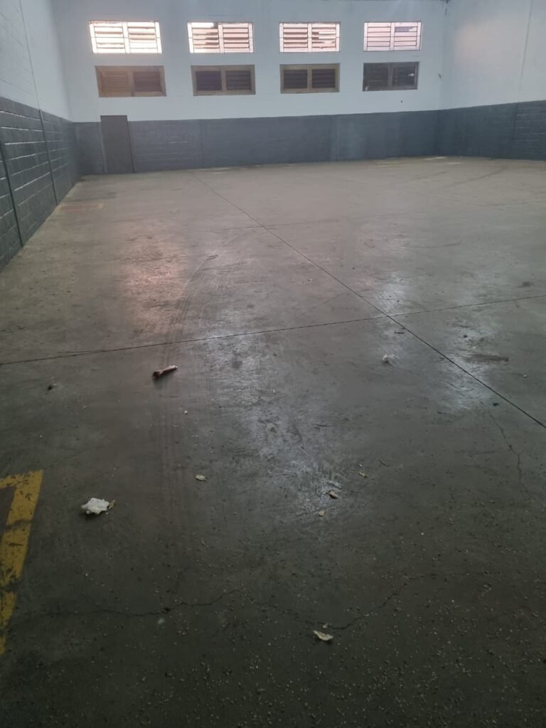 GALPÃO:- Piso concreto usinado polido com manchas próximo a parede do fundo do galpão e trinca na entrada do portão de caminhões restante em ordem, portão entrada de caminhões com chapa dobrada com pintura nova na cor grafite em ordem, travas todas em ordem, paredes com bloco aparente com pintura látex nova sendo barrado na cor grafite e restante na cor branco neve em ordem, 08 vitrôs de ferro com 19 vidros canelados cada sendo que 03 estão quebrados e 03 faltando restante em ordem, telhado estrutura metálica com telhas galvanizadas em ordem, 01 porta de ferro com 13 vidros canelados sendo que 01 esta trincado restante em ordem, maçanetas fechadura e chave yale em ordem, 01 vitrô basculante com 20 vidros canelados sendo que 03 estão trincados, 06 lâmpadas de LED no telhado do galpão e 02 lâmpadas LED na laje em ordem, cano de PVC de 100mm e calhas aparente na cor branco em ordem, 01 caixa de disjuntores com tampa com 11 disjuntores em ordem, tampa de inspeção de esgoto danificada.