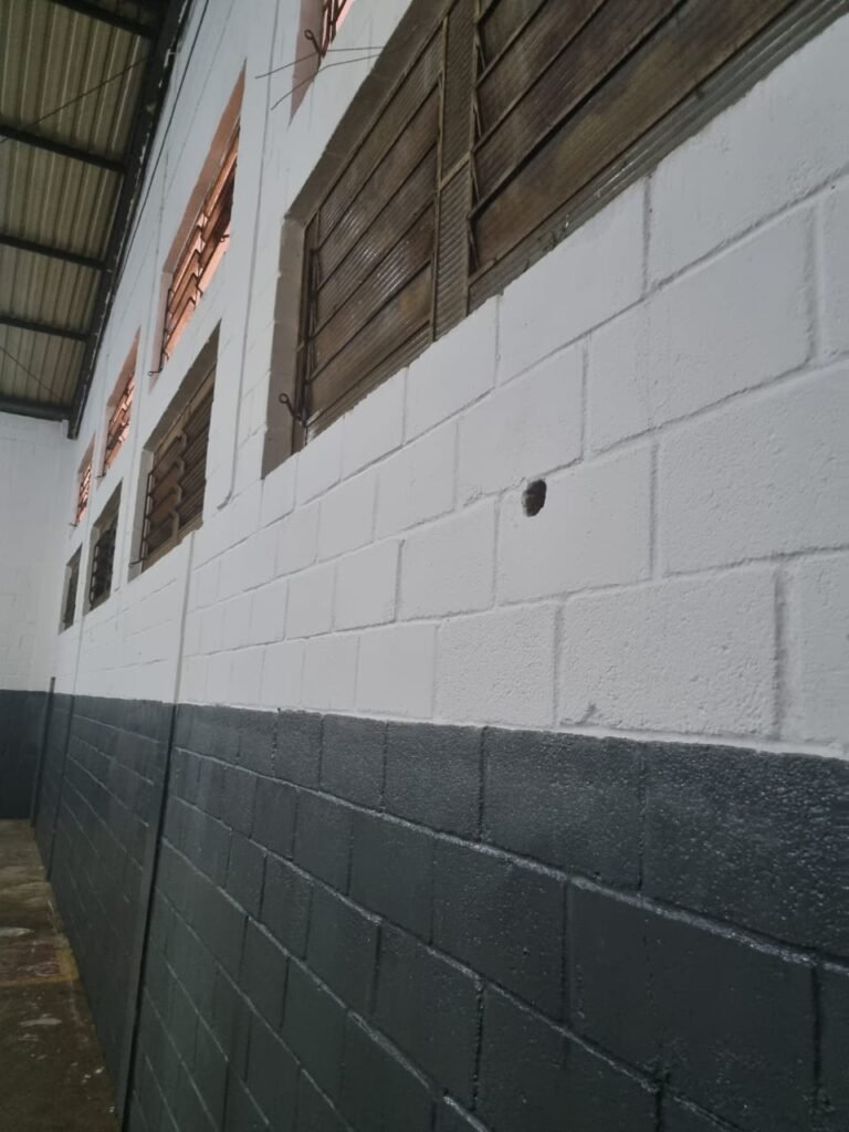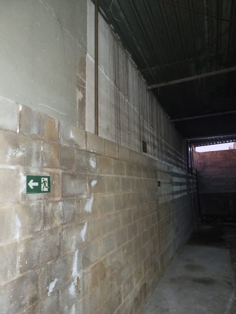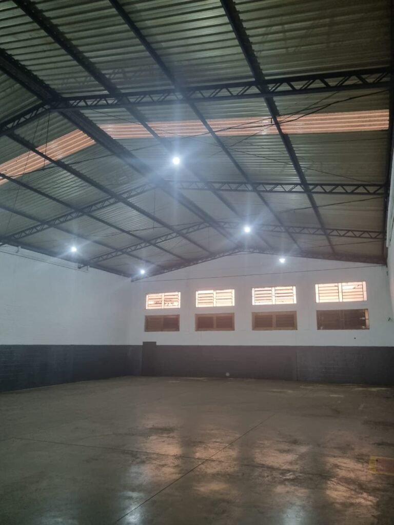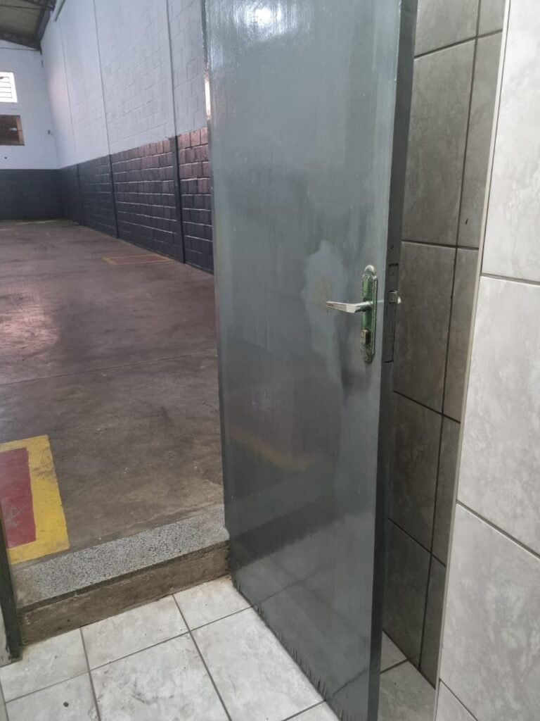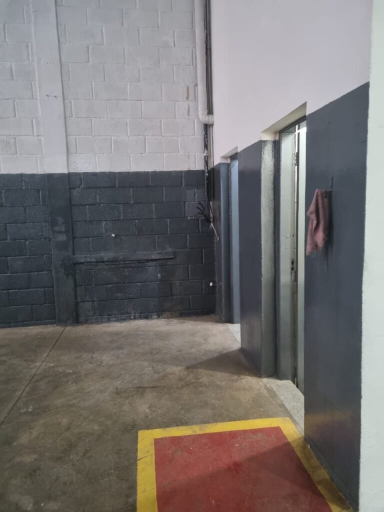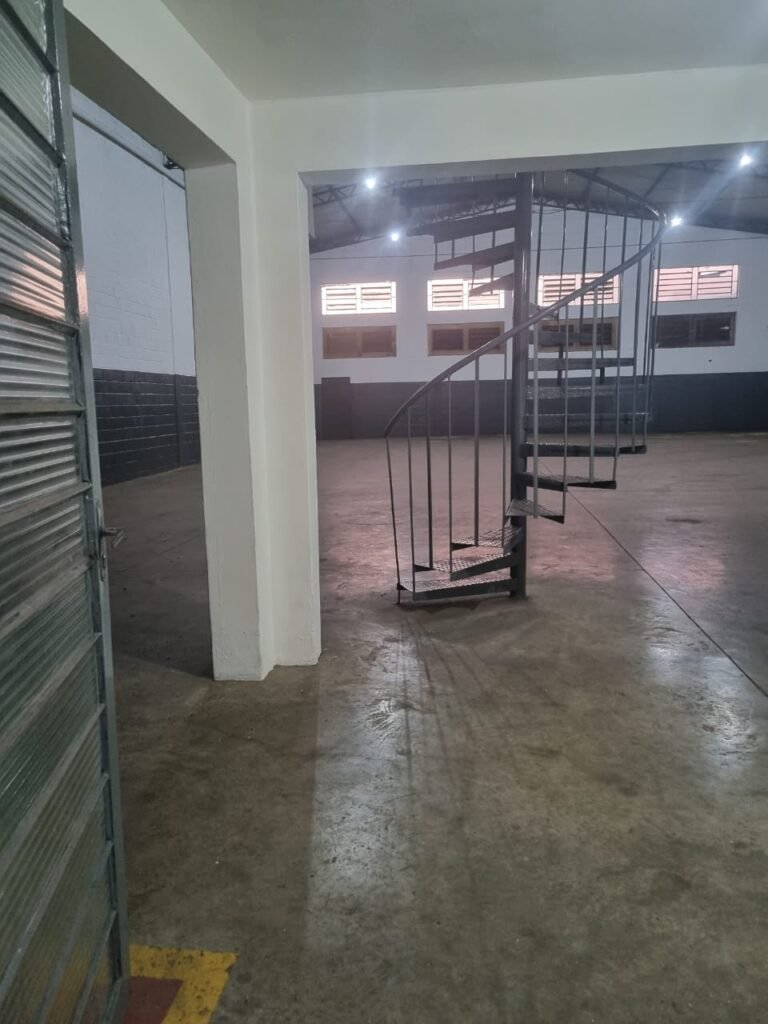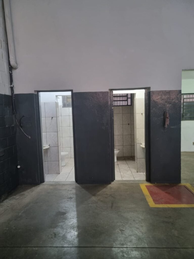 GALPÃO:- Piso concreto usinado polido com manchas próximo a parede do fundo do galpão e trinca na entrada do portão de caminhões restante em ordem, portão entrada de caminhões com chapa dobrada com pintura nova na cor grafite em ordem, travas todas em ordem, paredes com bloco aparente com pintura látex nova sendo barrado na cor grafite e restante na cor branco neve em ordem, 08 vitrôs de ferro com 19 vidros canelados cada sendo que 03 estão quebrados e 03 faltando restante em ordem, telhado estrutura metálica com telhas galvanizadas em ordem, 01 porta de ferro com 13 vidros canelados sendo que 01 esta trincado restante em ordem, maçanetas fechadura e chave yale em ordem, 01 vitrô basculante com 20 vidros canelados sendo que 03 estão trincados, 06 lâmpadas de LED no telhado do galpão e 02 lâmpadas LED na laje em ordem, cano de PVC de 100mm e calhas aparente na cor branco em ordem, 01 caixa de disjuntores com tampa com 11 disjuntores em ordem, tampa de inspeção de esgoto danificada.