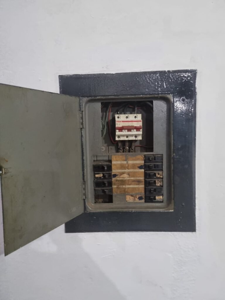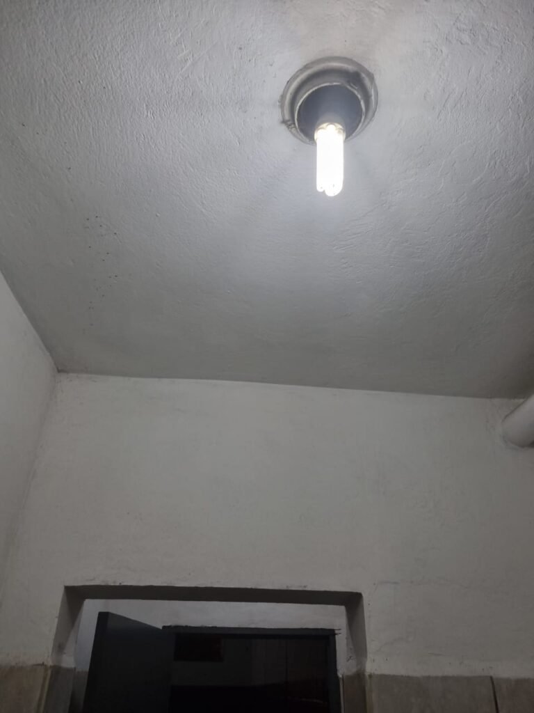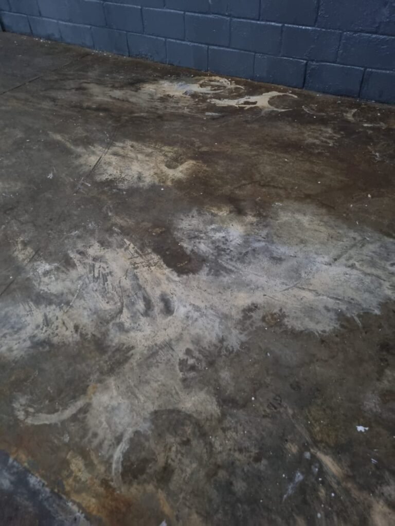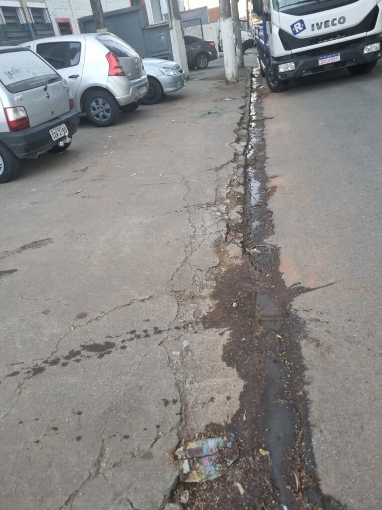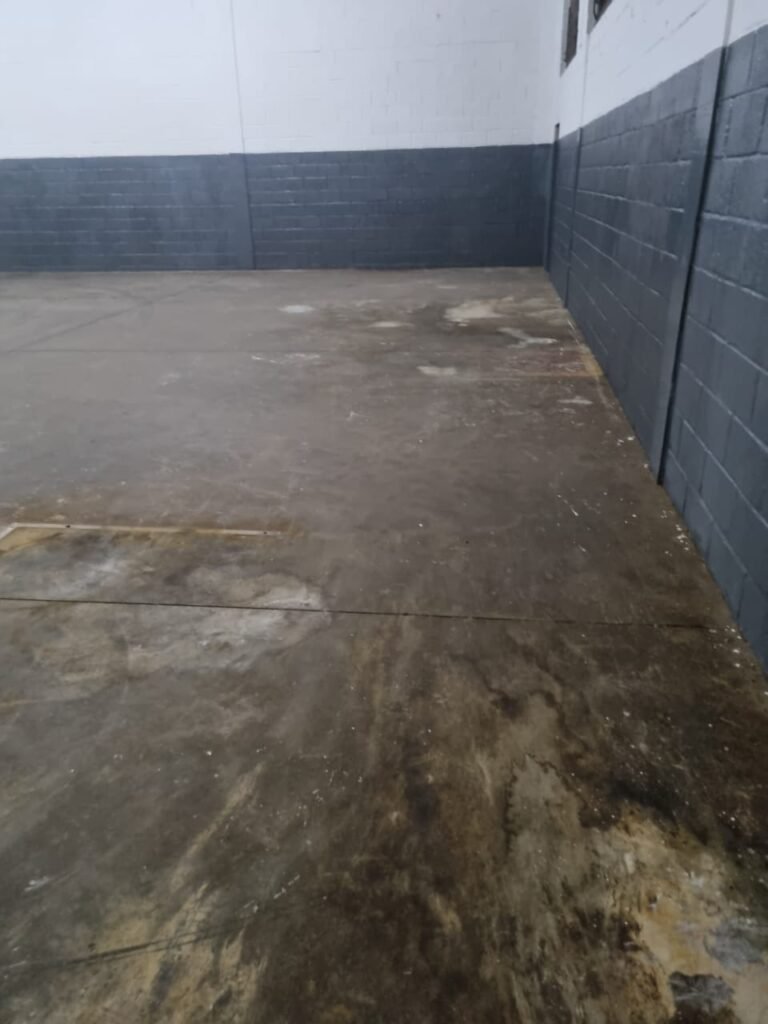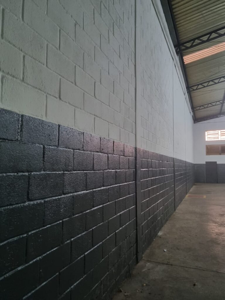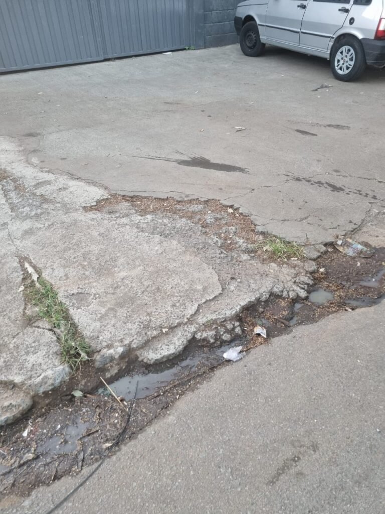 GALPÃO:- Piso concreto usinado polido com manchas próximo a parede do fundo do galpão e trinca na entrada do portão de caminhões restante em ordem, portão entrada de caminhões com chapa dobrada com pintura nova na cor grafite em ordem, travas todas em ordem, paredes com bloco aparente com pintura látex nova sendo barrado na cor grafite e restante na cor branco neve em ordem, 08 vitrôs de ferro com 19 vidros canelados cada sendo que 03 estão quebrados e 03 faltando restante em ordem, telhado estrutura metálica com telhas galvanizadas em ordem, 01 porta de ferro com 13 vidros canelados sendo que 01 esta trincado restante em ordem, maçanetas fechadura e chave yale em ordem, 01 vitrô basculante com 20 vidros canelados sendo que 03 estão trincados, 06 lâmpadas de LED no telhado do galpão e 02 lâmpadas LED na laje em ordem, cano de PVC de 100mm e calhas aparente na cor branco em ordem, 01 caixa de disjuntores com tampa com 11 disjuntores em ordem, tampa de inspeção de esgoto danificada.