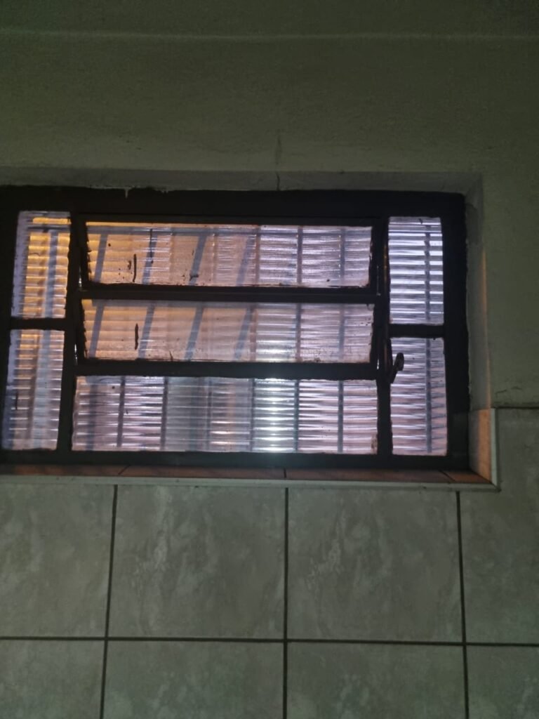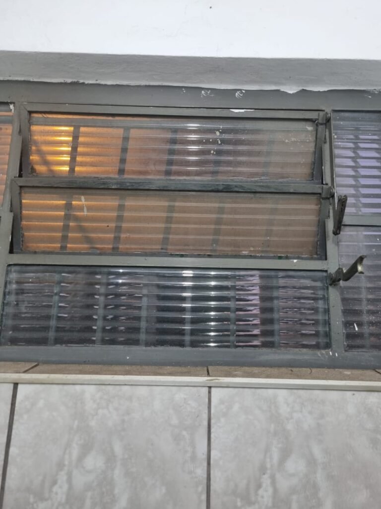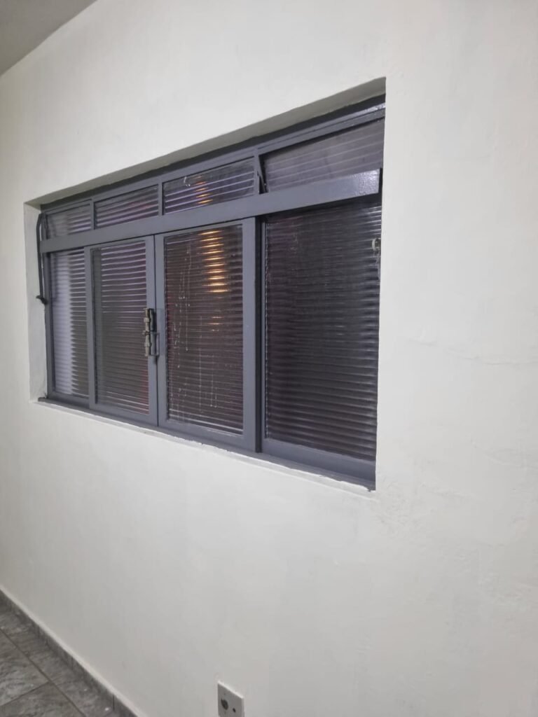 SALA 02:- Piso cerâmico na cor cinza em ordem, paredes com pintura látex nova na cor creme em ordem, teto com pintura látex nova na cor branco neve em ordem, 02 tomadas, 01 interruptor em ordem, vitrô correr está emperrado (colado com a tinta) basculante não funciona com puxador quebrado, vitrô com pintura nova na cor cinza em ordem, 08 vidros canelados sendo que 01 está trincado restante em ordem.