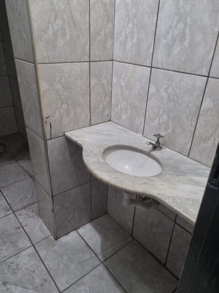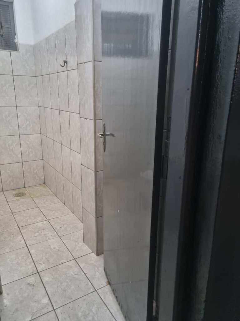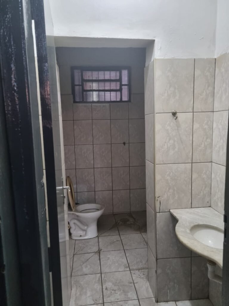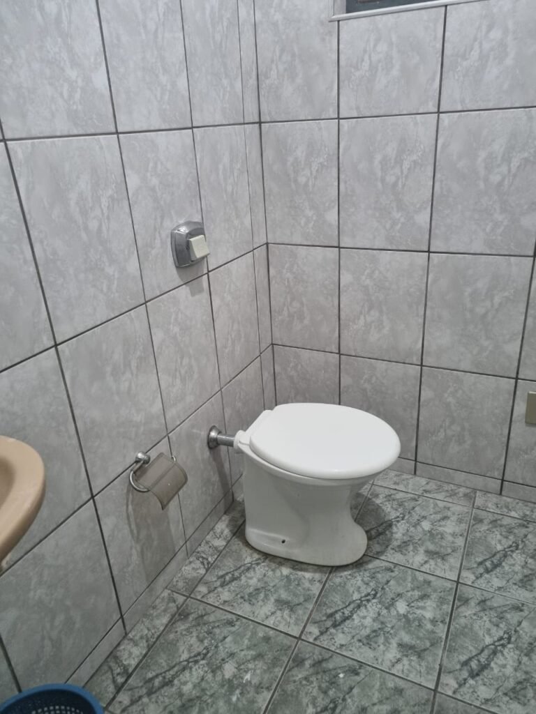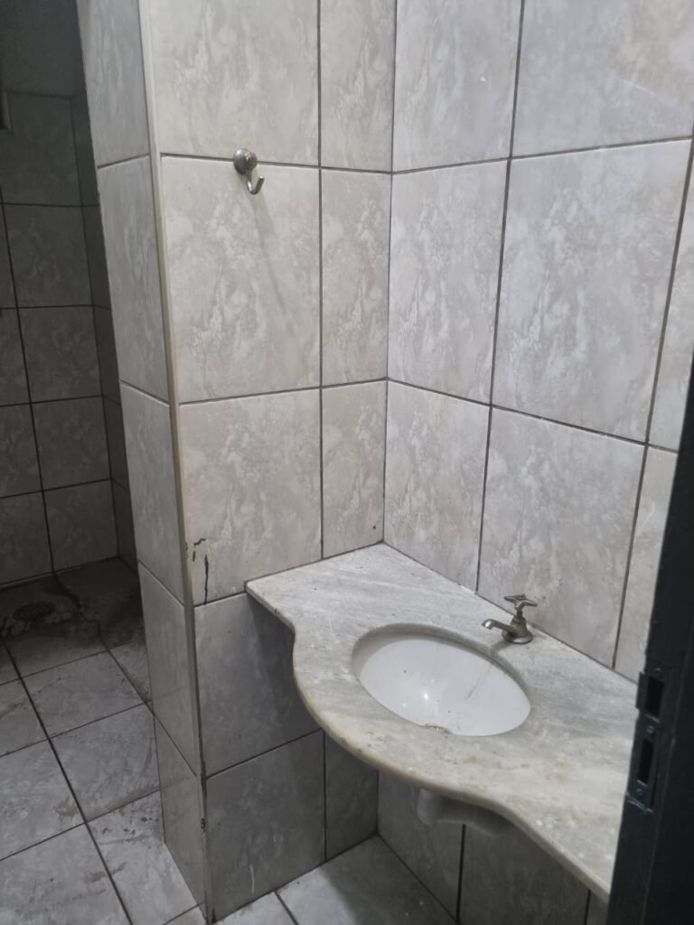 WC 02:- Piso frio cerâmico em ordem, ralo com tampa e desentupido em ordem, parede ½ azulejo barrado restante com pintura na cor branco neve em ordem, vitrô com puxador quebrado restante em ordem, vidro em ordem, pia de granito com sifão em ordem, torneira em ordem, conjunto vaso sanitário e caixa acoplada de descarga em ordem, tampa do vaso sanitário de plástico na cor branca em ordem, chuveiro tipo ducha de plástico na cor branca, porta de madeira na cor cinza lascando na parte inferior restante em ordem, maçanetas em ordem, fechadura e chave.