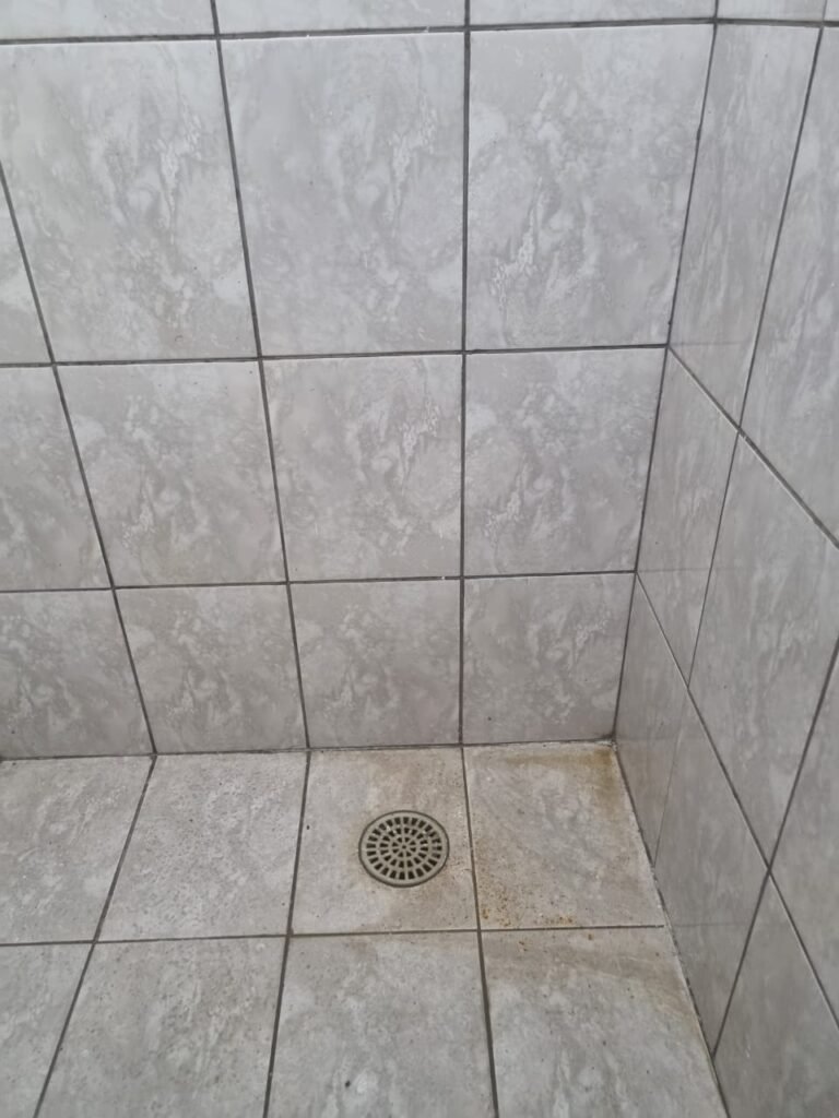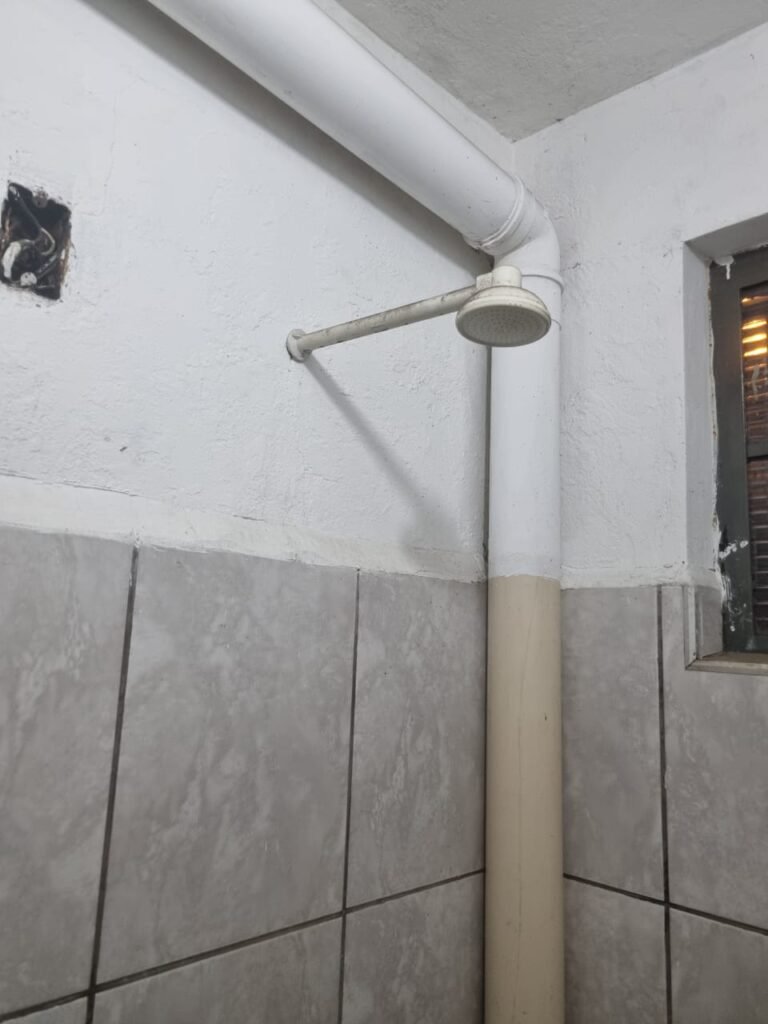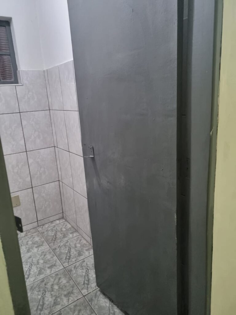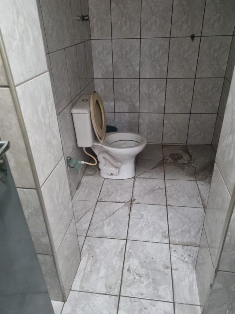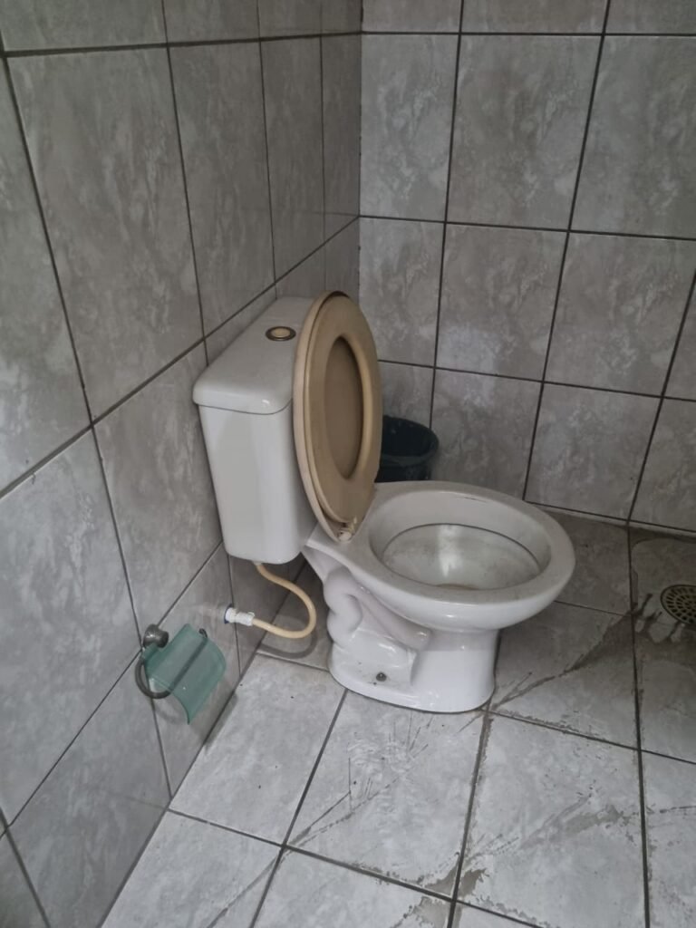 WC 02:- Piso frio cerâmico em ordem, ralo com tampa e desentupido em ordem, parede ½ azulejo barrado restante com pintura na cor branco neve em ordem, vitrô com puxador quebrado restante em ordem, vidro em ordem, pia de granito com sifão em ordem, torneira em ordem, conjunto vaso sanitário e caixa acoplada de descarga em ordem, tampa do vaso sanitário de plástico na cor branca em ordem, chuveiro tipo ducha de plástico na cor branca, porta de madeira na cor cinza lascando na parte inferior restante em ordem, maçanetas em ordem, fechadura e chave.