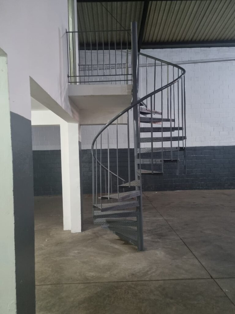 ESCADA caracol de ferro com guarda corpo e corrimão com pintura nova na cor cinza em ordem.