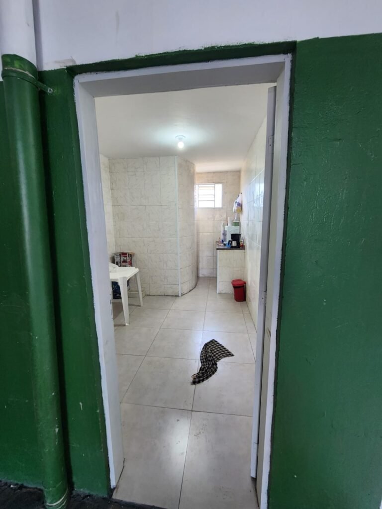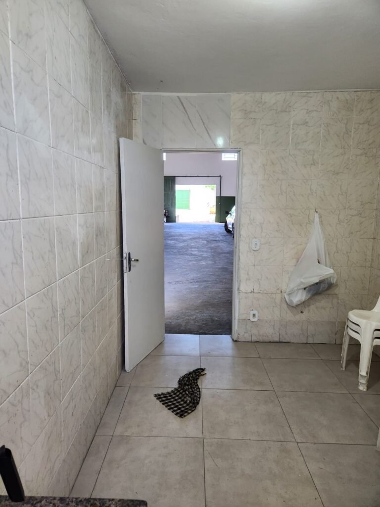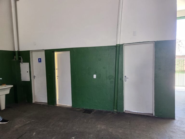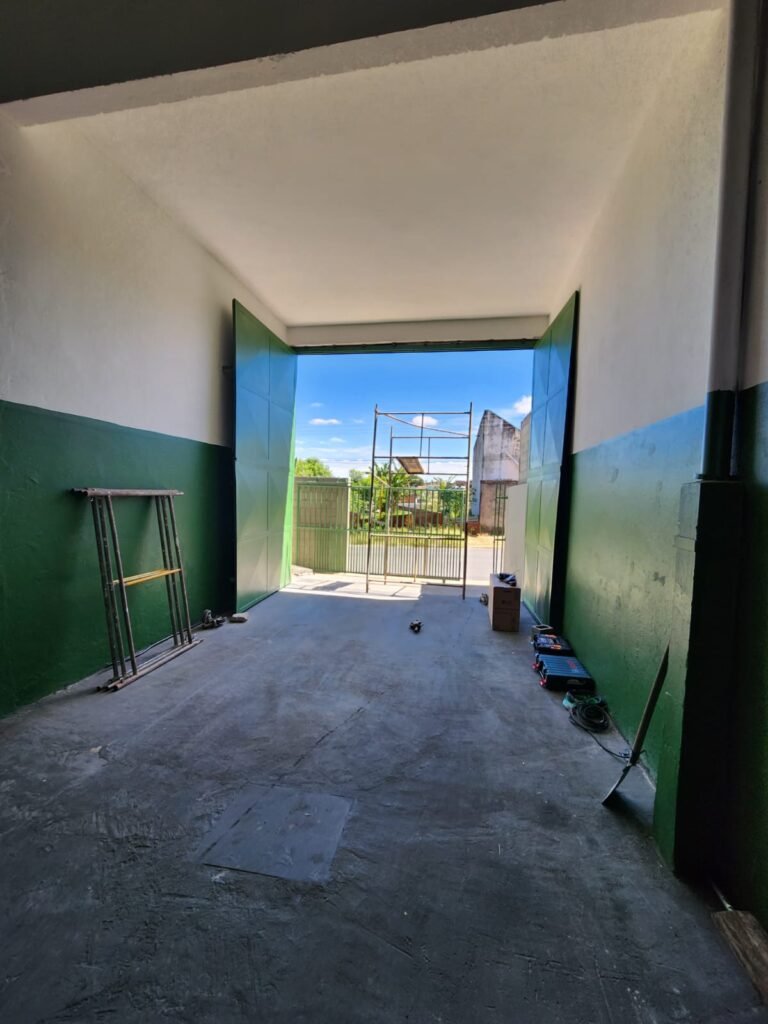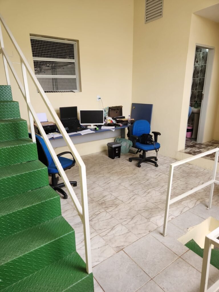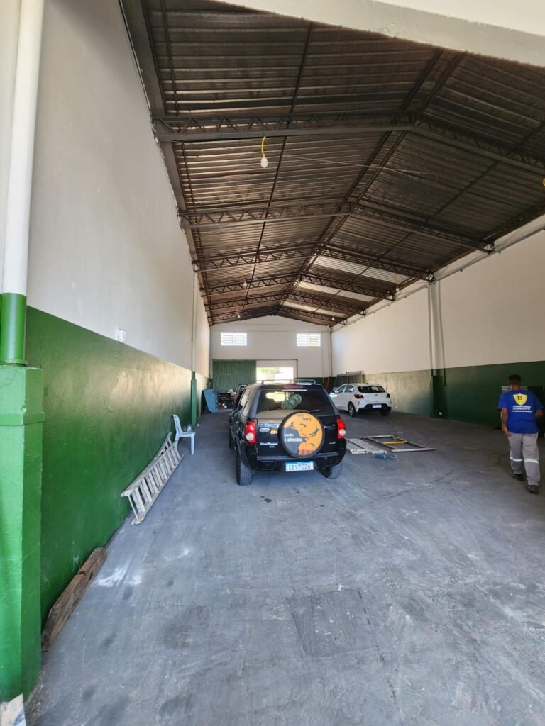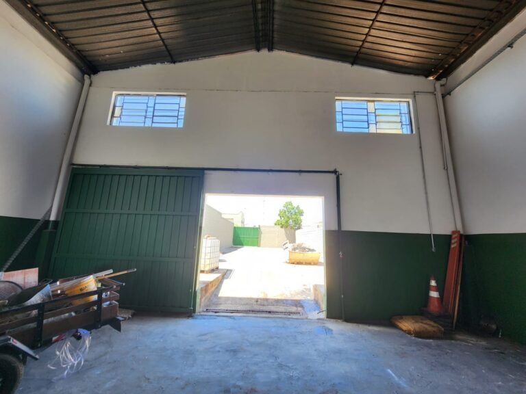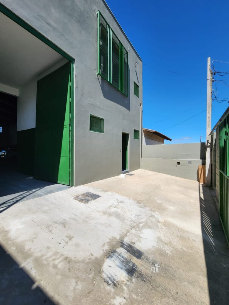 GALPÃO:- Piso concreto com irregularidade e com pintura nova com tinta piso na cor cinza em ordem, paredes barrado com pintura nova na cor verde em ordem e restante com pintura nova na cor branco neve em ordem, encanamento agua pluvial das calhas canos PVC 100mm com pintura nova barrado na cor verde e restante na cor branco, eletro tubos aparente na cor cinza com 02 espelhos para passagem de fios, 08 tomadas em ordem, 05 sendo 110 v e 03 sendo 220 v, 10 espelhos de luz de luz sendo que 03 são cegos e 01 esta com pintura na cor verde, 06 lâmpadas led em ordem, 06 coduletes para passagem de fios para as lâmpadas, 02 vitrôs com 19 vidros canelados cada em ordem, 01 portão deslizante de ferro com pintura nova na cor verde, travas e roldanas em ordem, 01 cadeado Pado e chave em ordem, telhado com estrutura metálica com pintura na cor preto em ordem, telhas galvanizadas em ordem, 01 tanque com coluna cerâmica branca, 01 torneira bica em ordem, 01 caixa de disjuntores com tampa na cor branco com 14 disjuntores em ordem sendo 01 Steck SD 100A 3P, 01 Steck SD C50 3P, 02 Steck SD C25 2P, 01 Steck SD C20 1P, 01 Streck SD C32 2P, 03 Steck 2P sem indentificação, 02 FD C16 2P, 01 Steck SD C25 1P, 02 Steck SD 1P sem identificação, 02 portas de madeira com pintura nova na cor branco sem guarnições restante em ordem, maçanetas e fechaduras em ordem, 01 porta de ferro com pintura nova na cor branco em ordem, maçaneta em ordem, sem fechadura, 02 ralo com grelha de ferro em ordem.