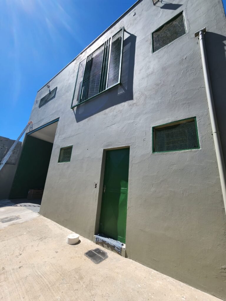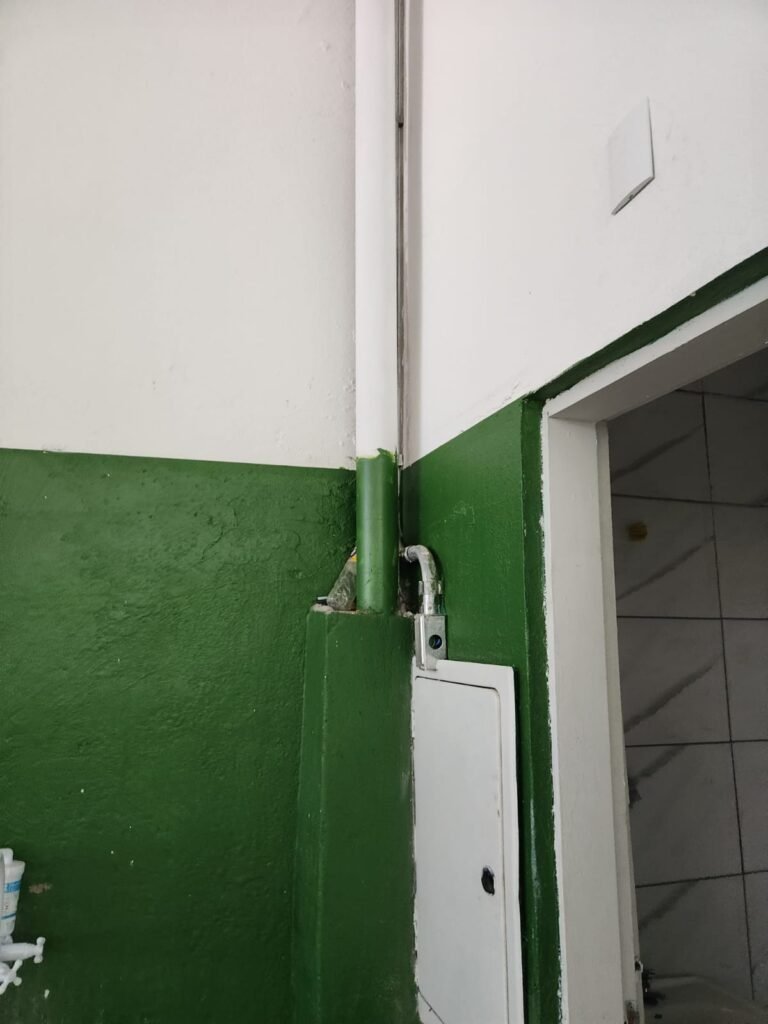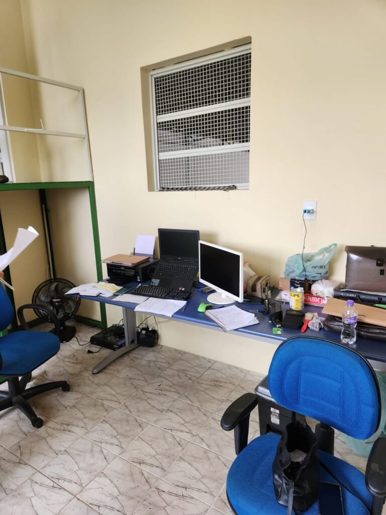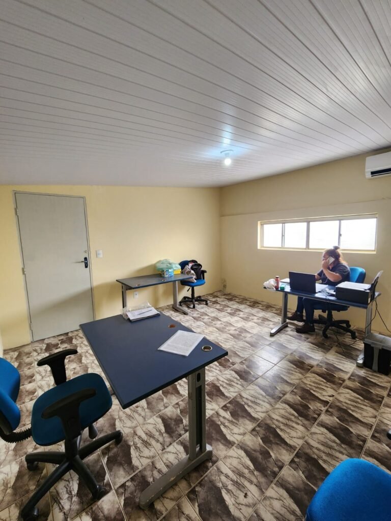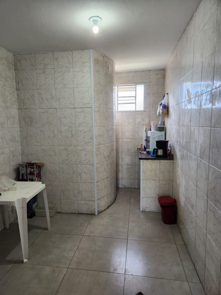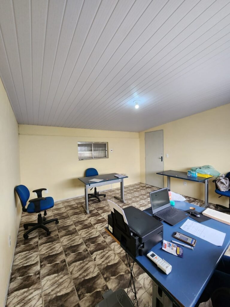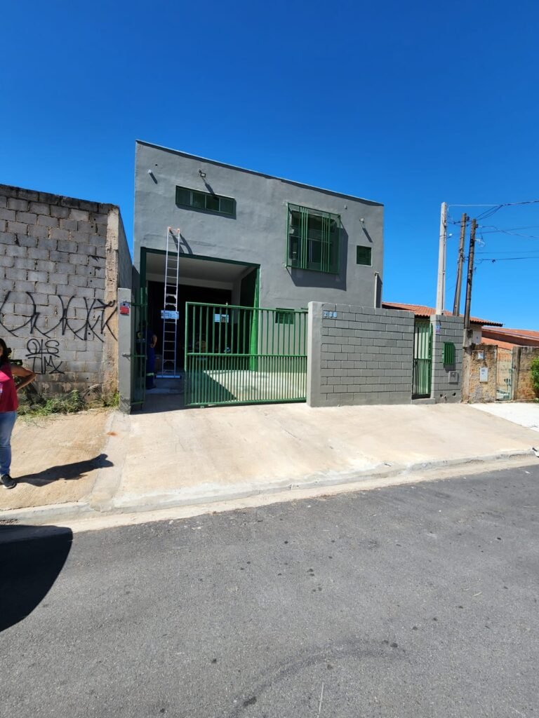 GALPÃO:- Piso concreto com irregularidade e com pintura nova com tinta piso na cor cinza em ordem, paredes barrado com pintura nova na cor verde em ordem e restante com pintura nova na cor branco neve em ordem, encanamento agua pluvial das calhas canos PVC 100mm com pintura nova barrado na cor verde e restante na cor branco, eletro tubos aparente na cor cinza com 02 espelhos para passagem de fios, 08 tomadas em ordem, 05 sendo 110 v e 03 sendo 220 v, 10 espelhos de luz de luz sendo que 03 são cegos e 01 esta com pintura na cor verde, 06 lâmpadas led em ordem, 06 coduletes para passagem de fios para as lâmpadas, 02 vitrôs com 19 vidros canelados cada em ordem, 01 portão deslizante de ferro com pintura nova na cor verde, travas e roldanas em ordem, 01 cadeado Pado e chave em ordem, telhado com estrutura metálica com pintura na cor preto em ordem, telhas galvanizadas em ordem, 01 tanque com coluna cerâmica branca, 01 torneira bica em ordem, 01 caixa de disjuntores com tampa na cor branco com 14 disjuntores em ordem sendo 01 Steck SD 100A 3P, 01 Steck SD C50 3P, 02 Steck SD C25 2P, 01 Steck SD C20 1P, 01 Streck SD C32 2P, 03 Steck 2P sem indentificação, 02 FD C16 2P, 01 Steck SD C25 1P, 02 Steck SD 1P sem identificação, 02 portas de madeira com pintura nova na cor branco sem guarnições restante em ordem, maçanetas e fechaduras em ordem, 01 porta de ferro com pintura nova na cor branco em ordem, maçaneta em ordem, sem fechadura, 02 ralo com grelha de ferro em ordem.