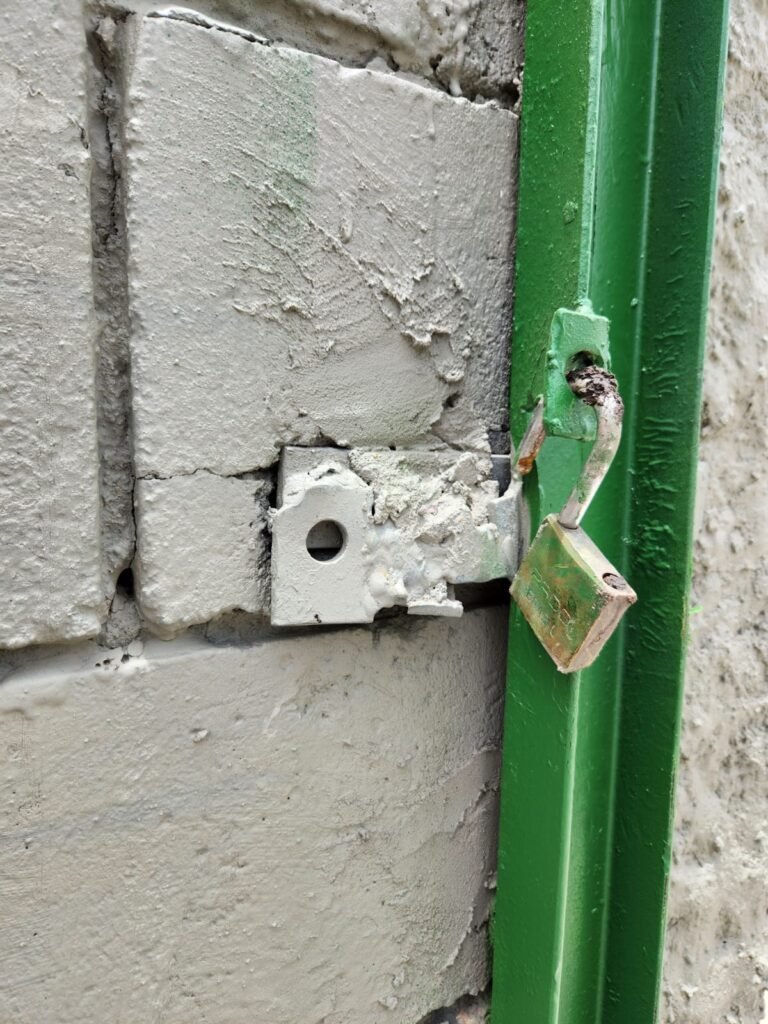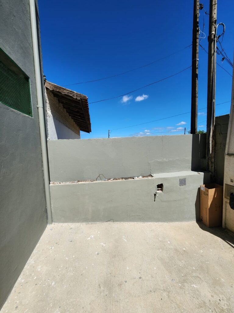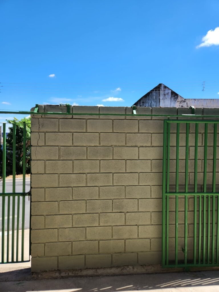 TERRENO:- Piso concreto usinado sem pintura, muros com bloco aparente com pintura nova com tinta piso na cor concreto em ordem, fundo do galpão com pintura nova na cor concreto em ordem, 02 tomadas, 02 espelhos de luz eletro tubos, 01 portão deslizante com pintura nova na cor verde em ordem, 01 cadeados  e chave em ordem.