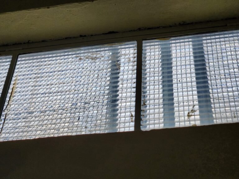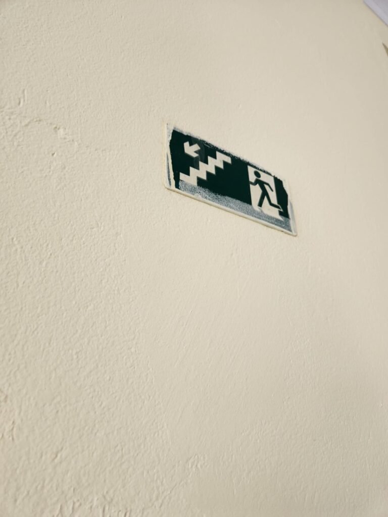 HALL:- Piso frio cerâmico marmorizado em ordem, ao redor da escada piso cerâmico na cor cinza, guarda corpo de ferro com pintura nova na cor branco em ordem, paredes com pintura nova na cor marfim em ordem, teto de forro PVC branco em ordem, 05 tomadas, 01 interruptor, 05 espelhos de luz, porta  com pintura na cor branco gelo nova em ordem, 01 janela com 04 folhas de vidro sujas com marcas de tinta e com folhas de vidro emperrando, 01 vitrô com 04 vidros canelados sujos com marcas de tinta, 05 placas de sinalização de saída emergencial sujas de tinta, 01 vitro com grades sem vidros.