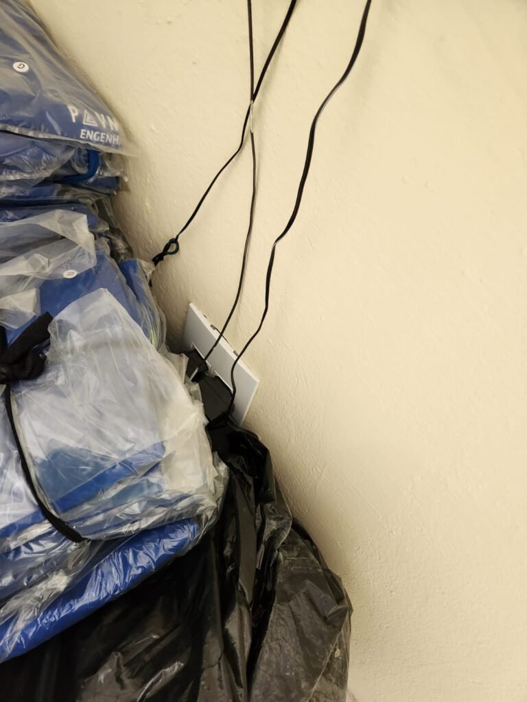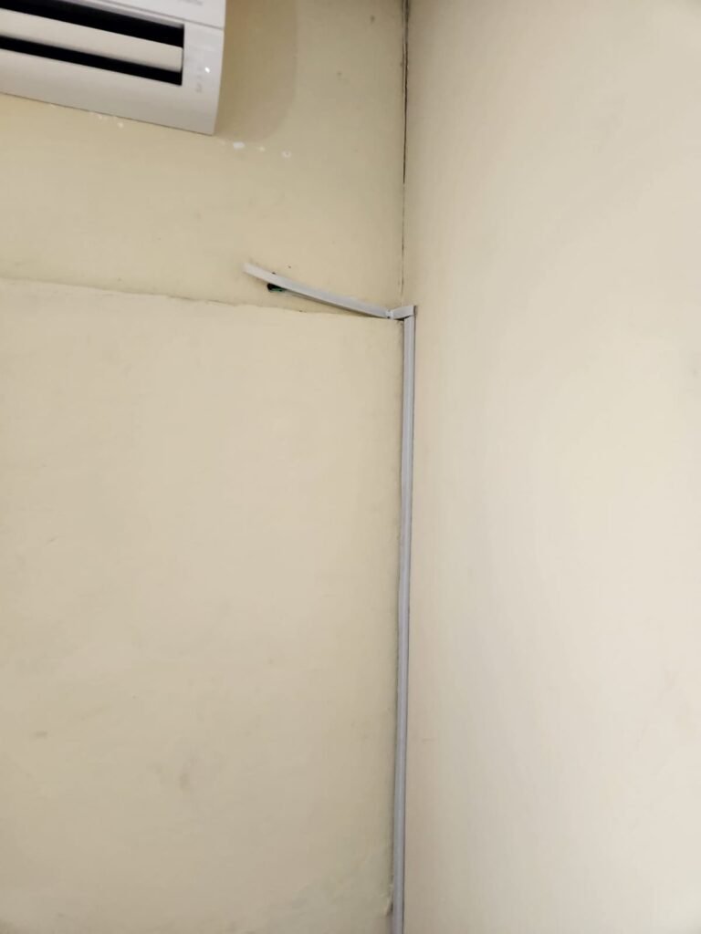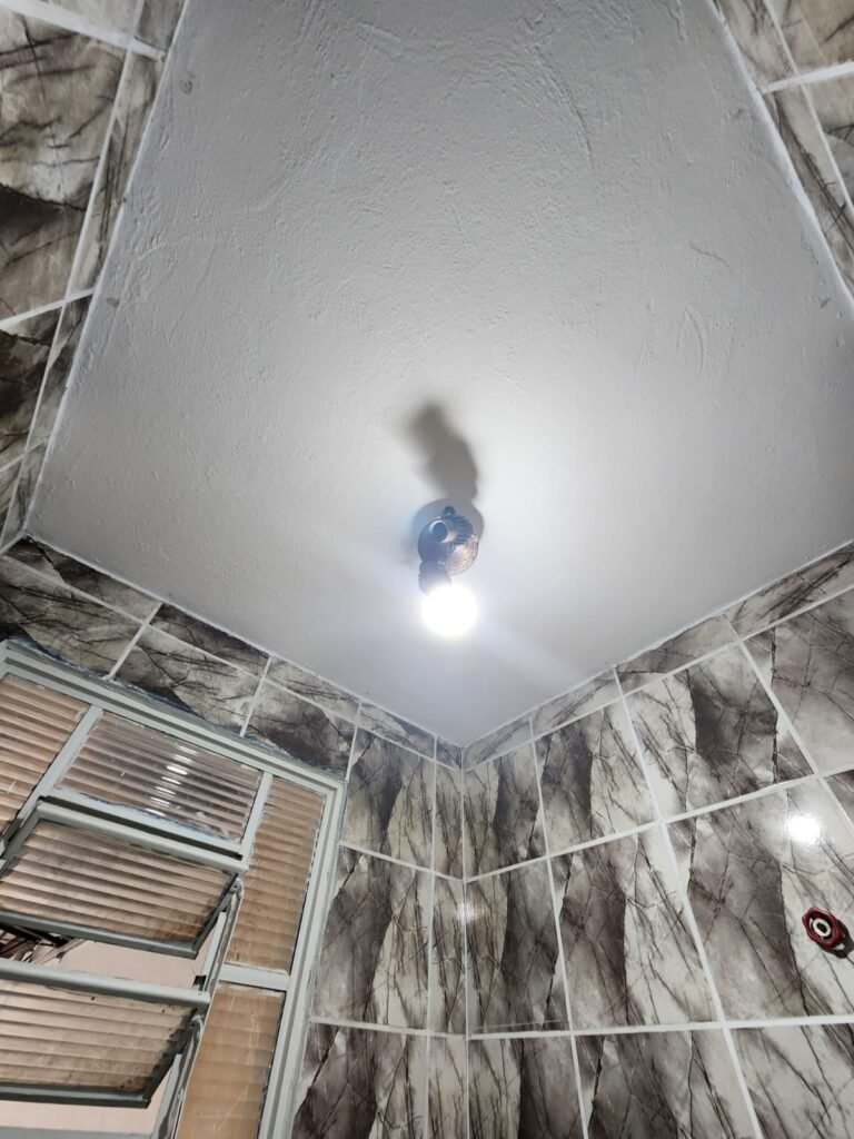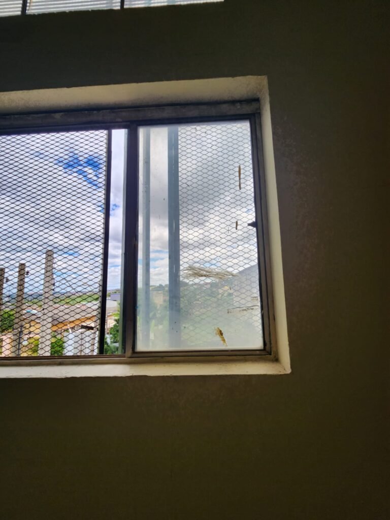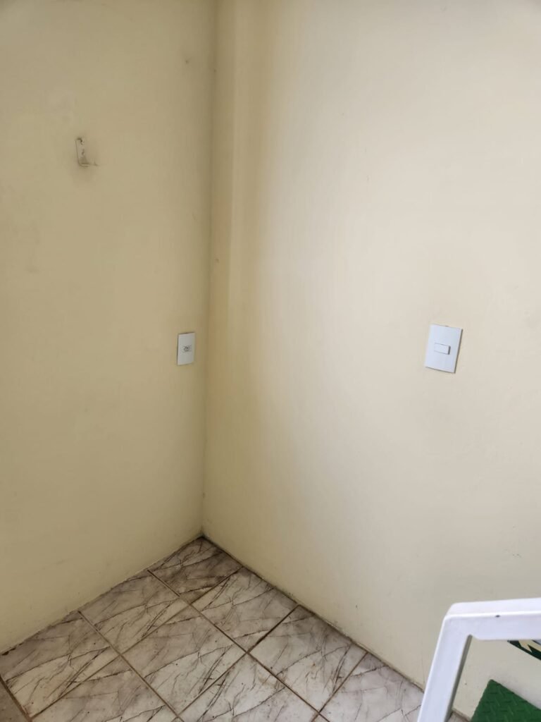 SALA:- Piso frio cerâmico marmorizado em ordem, paredes com pintura nova na cor marfim em ordem, teto forro PVC na cor branca, 09 tomadas, 01 interruptor, 13 espelhos de luz sendo que 03 são espelhos cegos, 01 vitrô com 04 vidros canelados transparentes sujos de tinta, emperrando e está faltando 02 puxadores, 01 vitrô com 02 vidros canelados sendo que 01 esta faltando puxador, grade de ferro com pintura na cor branco, 01 lâmpada bulbo led com spot, porta de madeira com pintura nova na  cor branco gelo em ordemo, maçaneta e fechadura em ordem, condulete para passagem de fios.