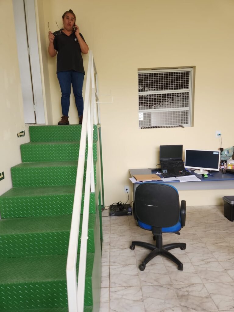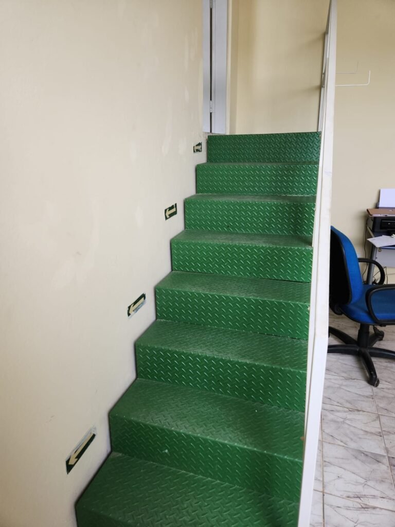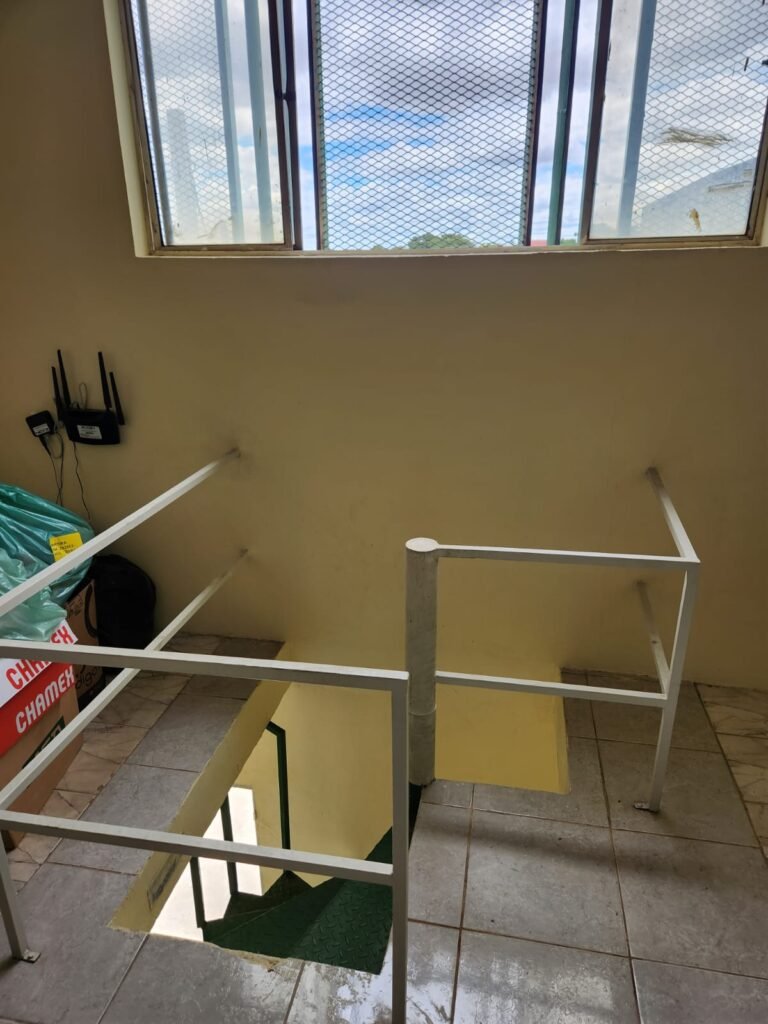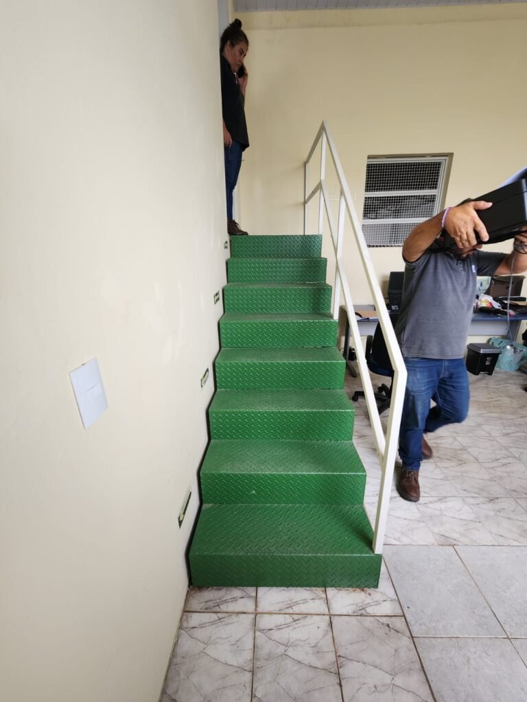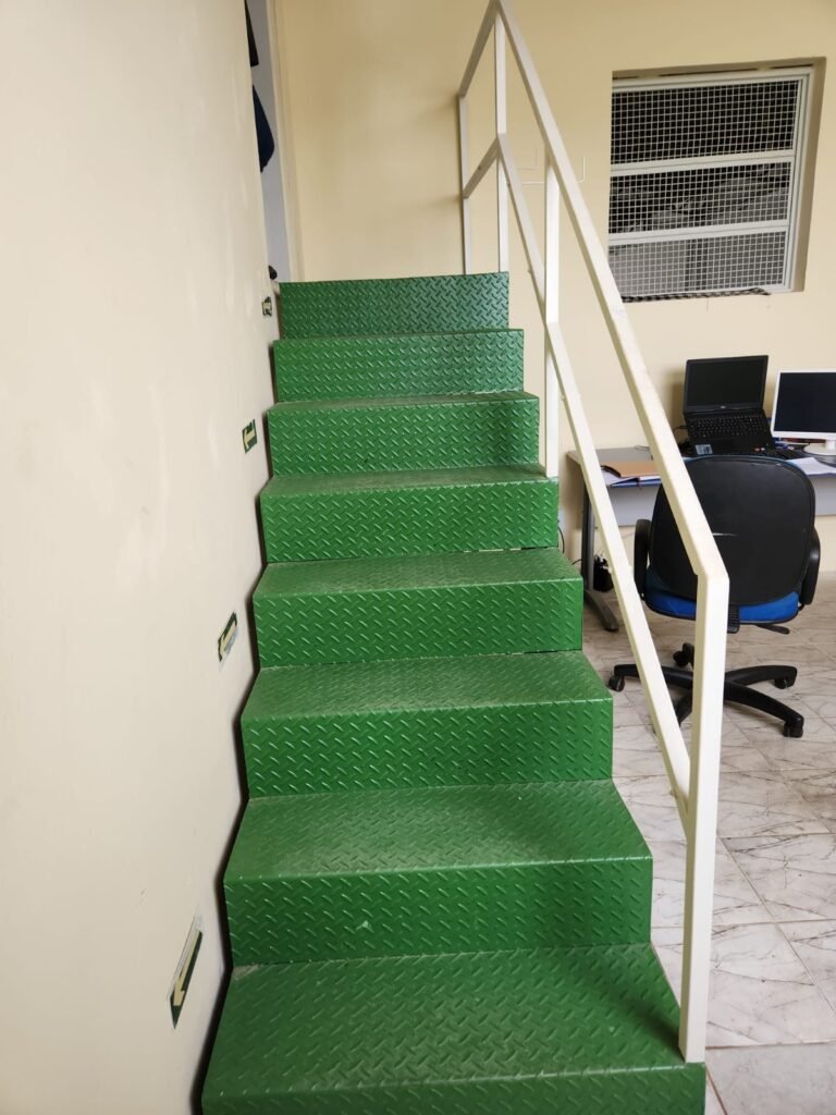 ESCADA de ferro com pintura nova na cor verde e guarda corpo e corrimão com pintura nova na cor branco em ordem.