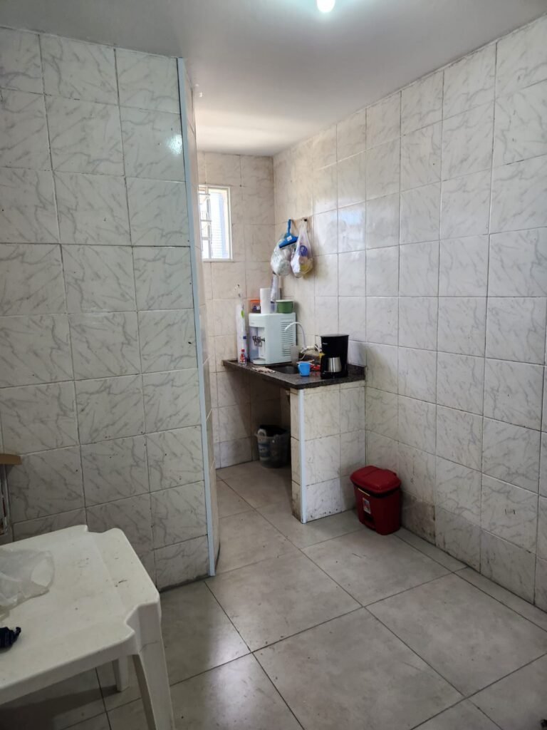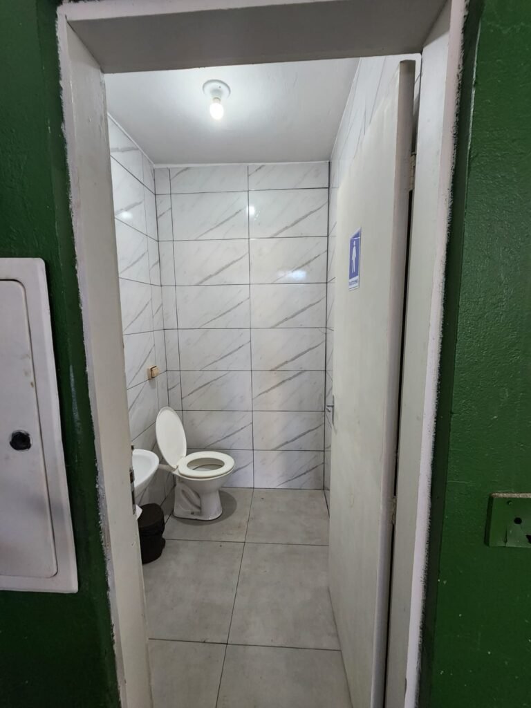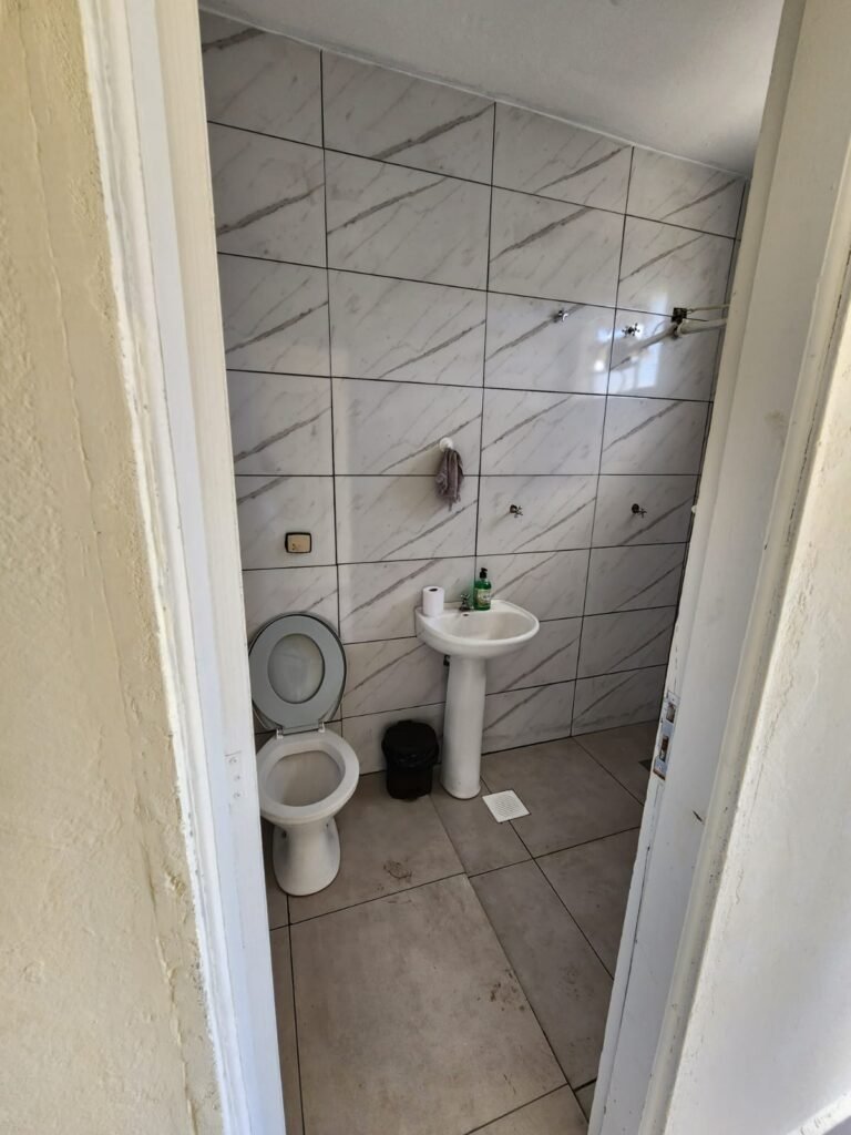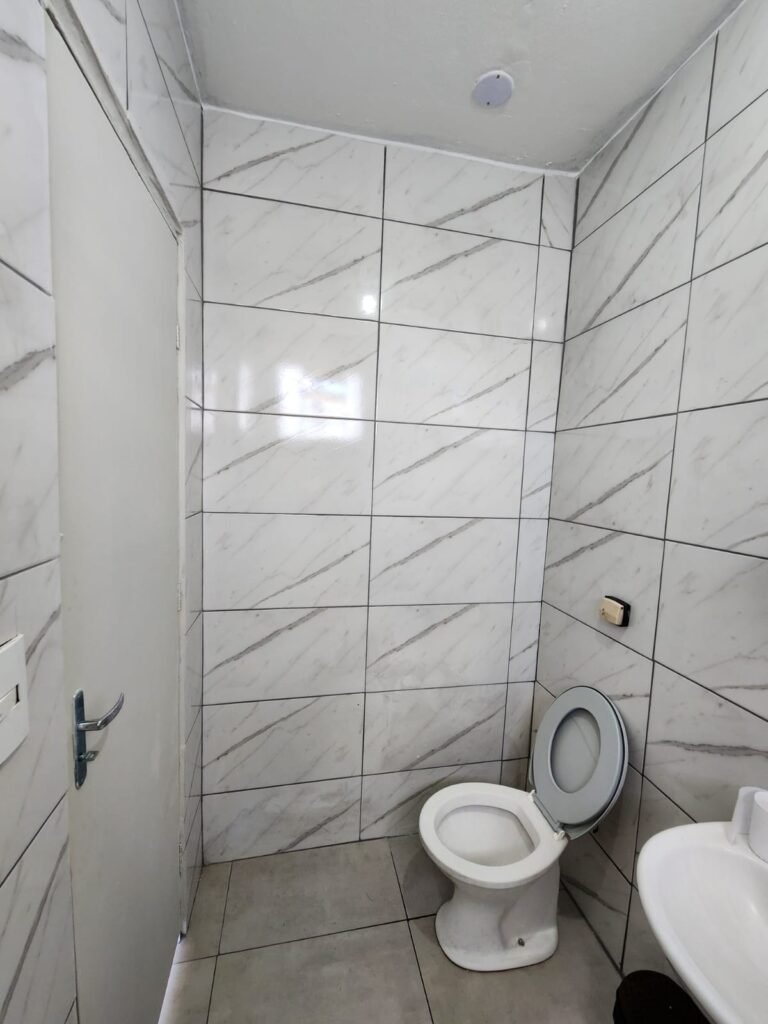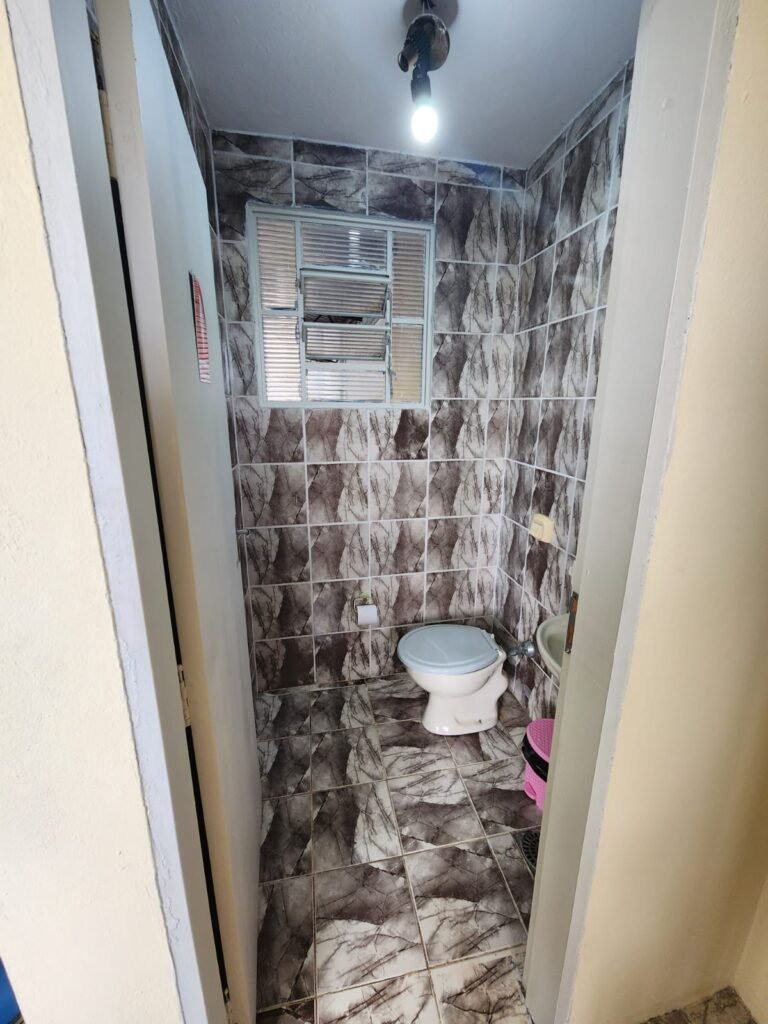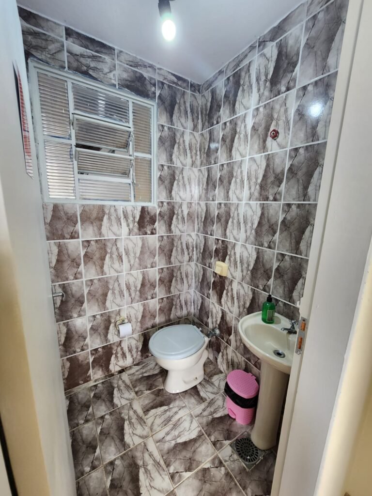 WC 2 :- Piso e paredes com azulejo ate o teto, teto com pintura nova na cor branco gelo em ordem, 01 lâmpada bulbo led com spot, 01 bocal sem lâmpada, 01 registro com canopla, 01 interruptor em ordem, 01 espelho de luz, 01 vitrô basculante com 08 vidros em ordem, 01 conjunto lavatório com coluna cerâmica com desgaste natural restante em ordem, vaso sanitário cerâmica branca com desgaste natural em ordem, válvula descarga em ordem, 01 torneira em ordem, 01 porta papel higiênico em ordem, 01 porta tolha em ordem, 01 saboneteira em ordem, 01 ralo com tampa inox, porta de madeira com pintura na cor cinza médio sem guarnição, maçaneta em ordem, fechadura e chave fixa em ordem.