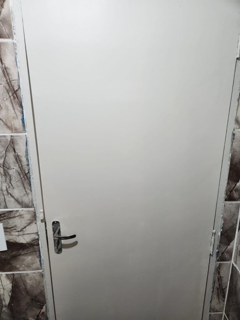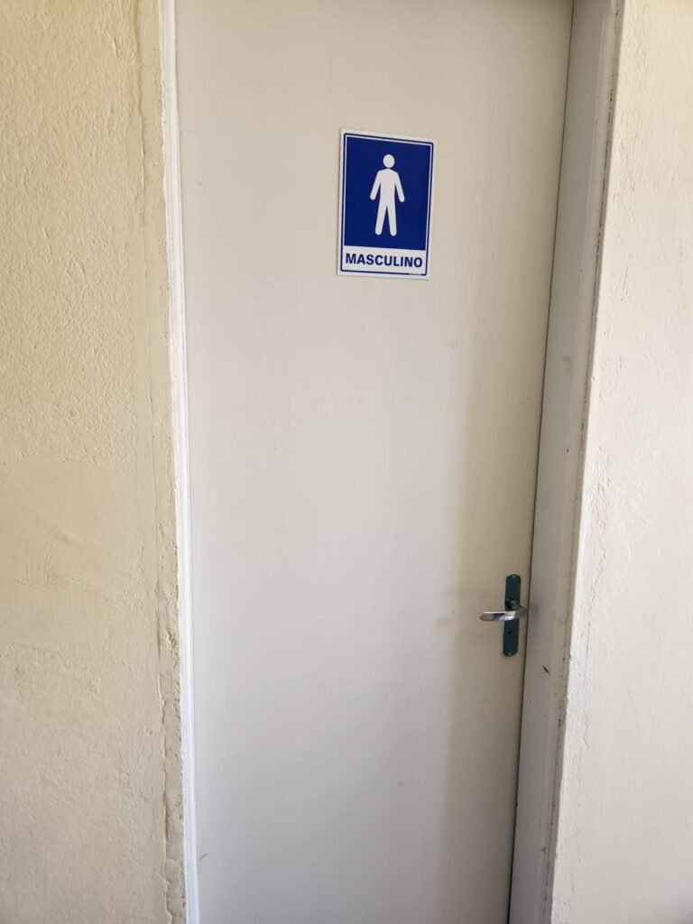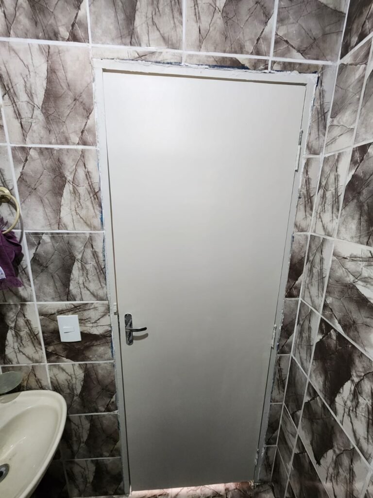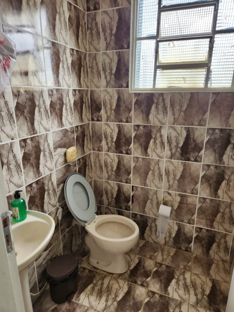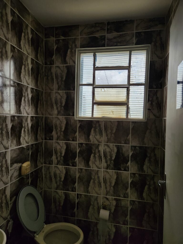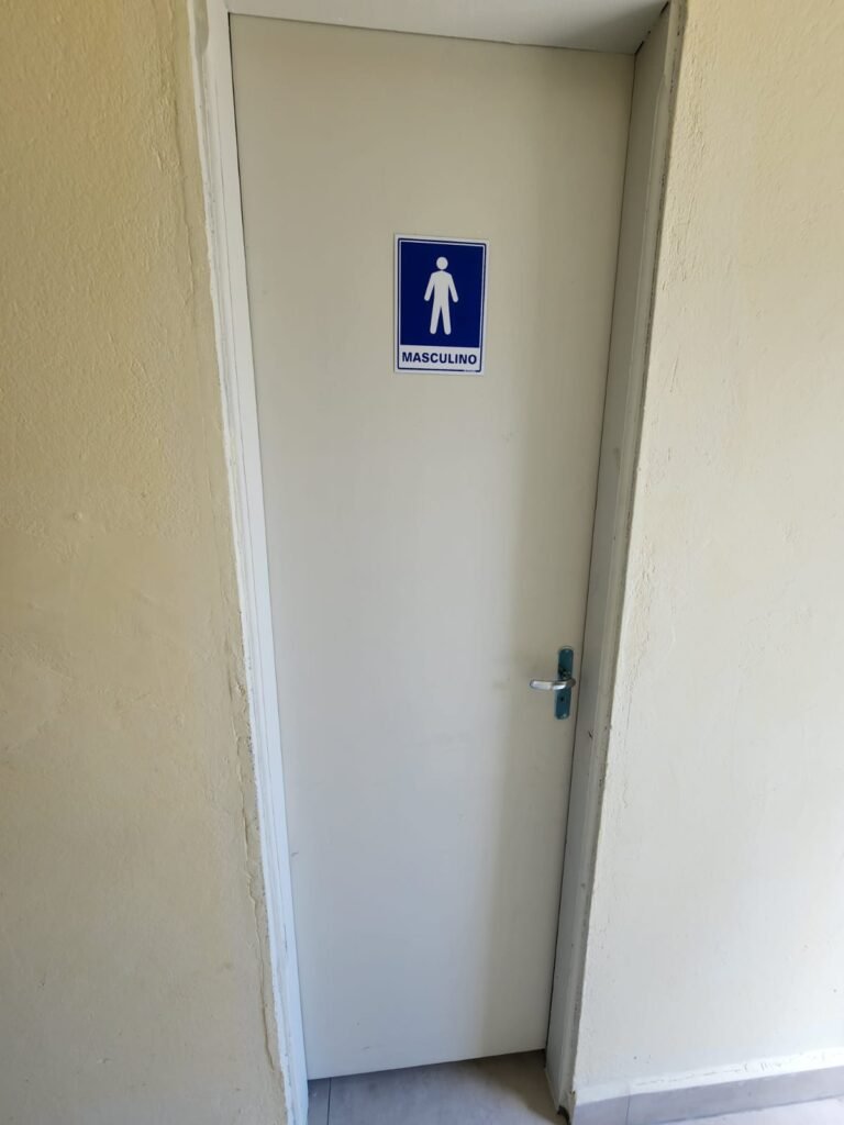 WC 2 :- Piso e paredes com azulejo ate o teto, teto com pintura nova na cor branco gelo em ordem, 01 lâmpada bulbo led com spot, 01 bocal sem lâmpada, 01 registro com canopla, 01 interruptor em ordem, 01 espelho de luz, 01 vitrô basculante com 08 vidros em ordem, 01 conjunto lavatório com coluna cerâmica com desgaste natural restante em ordem, vaso sanitário cerâmica branca com desgaste natural em ordem, válvula descarga em ordem, 01 torneira em ordem, 01 porta papel higiênico em ordem, 01 porta tolha em ordem, 01 saboneteira em ordem, 01 ralo com tampa inox, porta de madeira com pintura na cor cinza médio sem guarnição, maçaneta em ordem, fechadura e chave fixa em ordem.