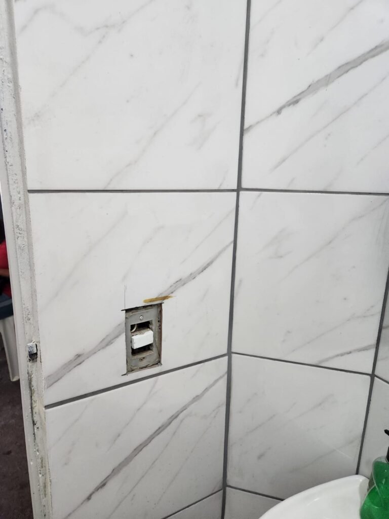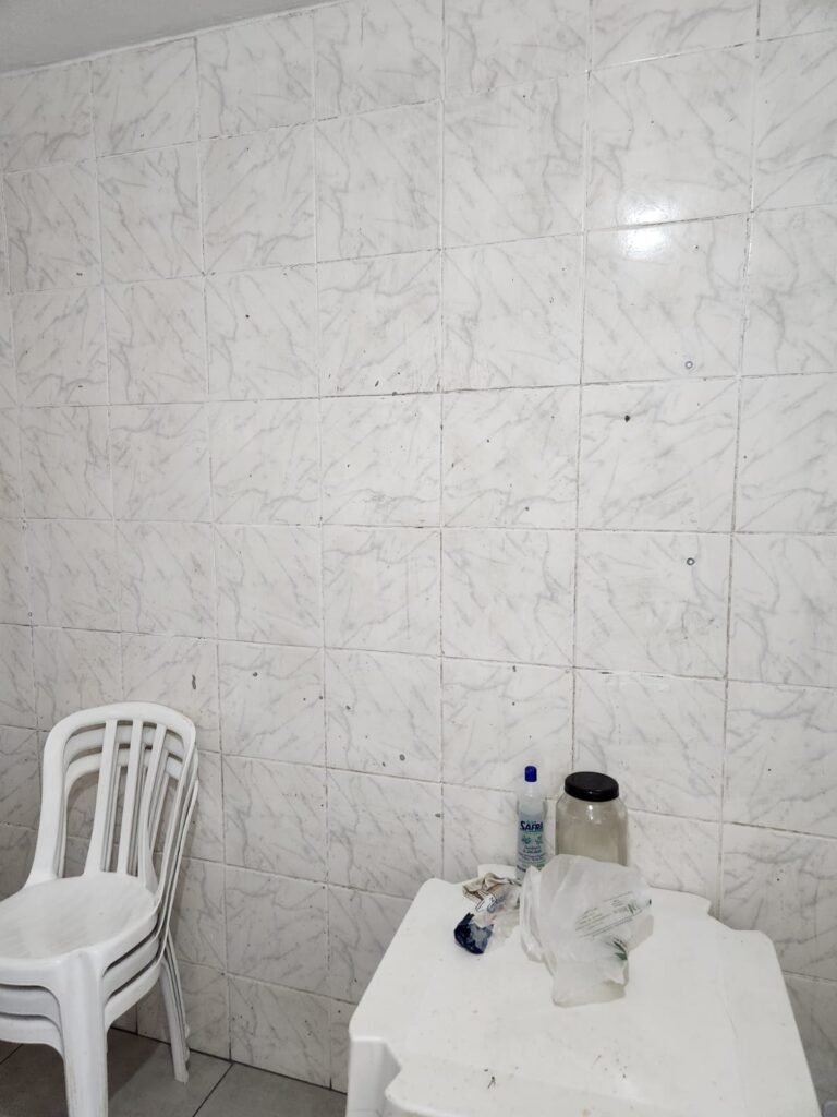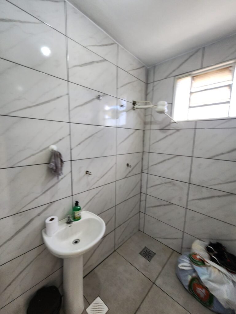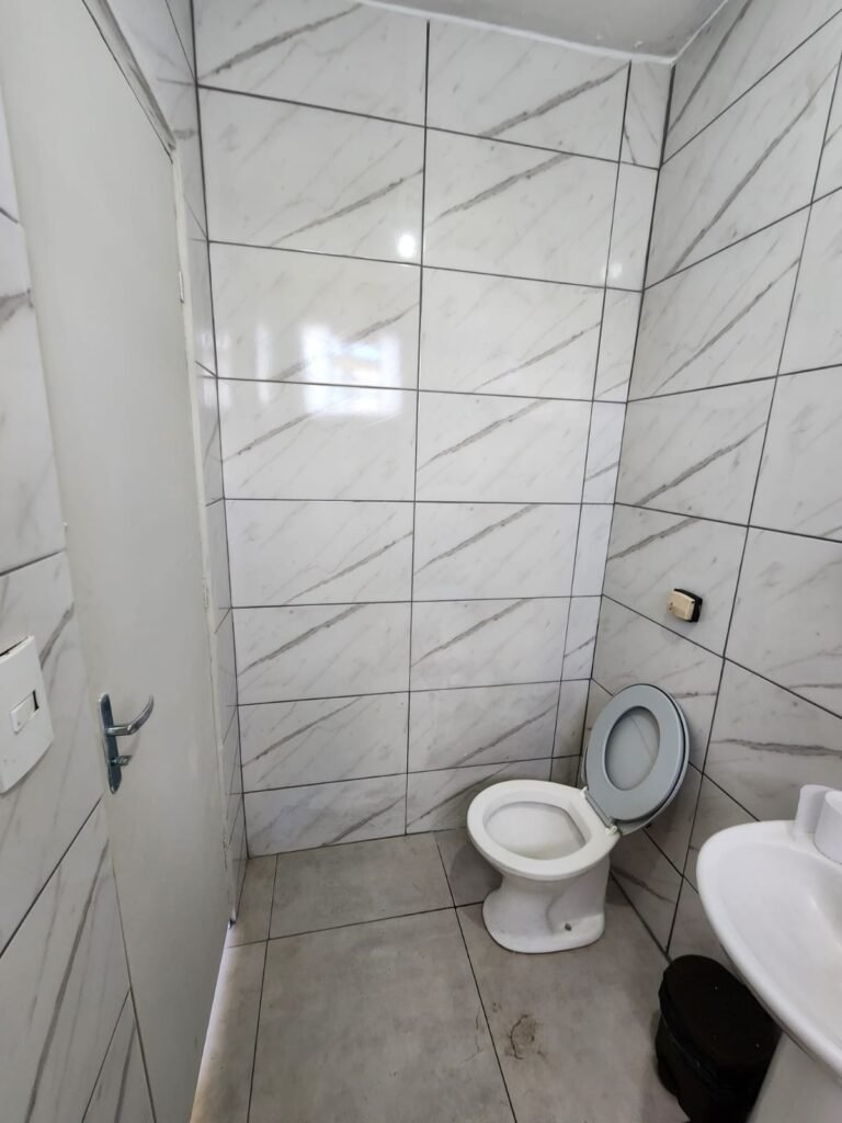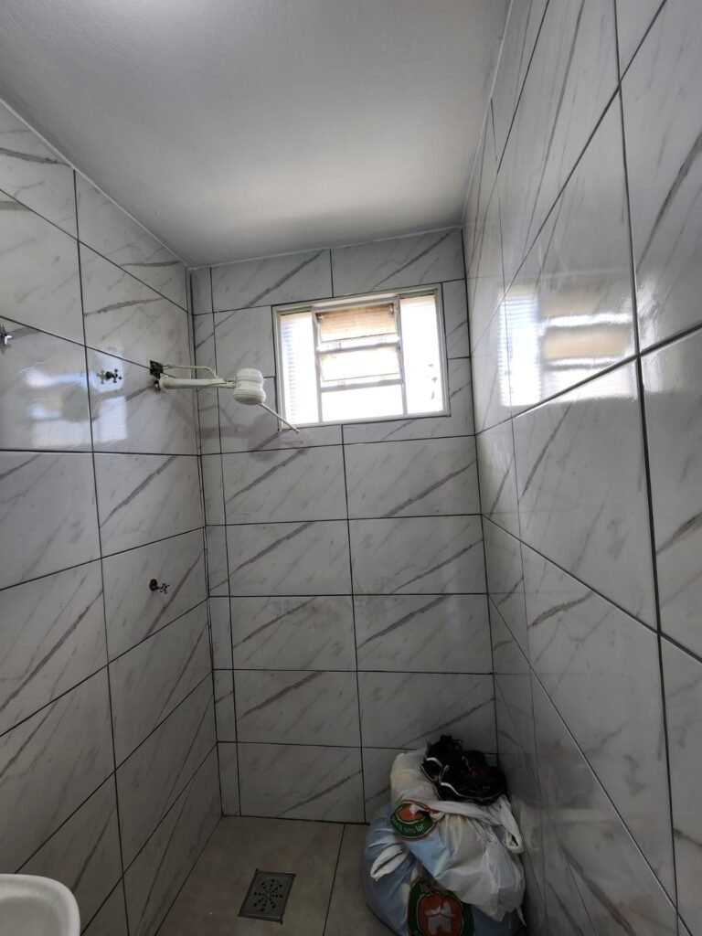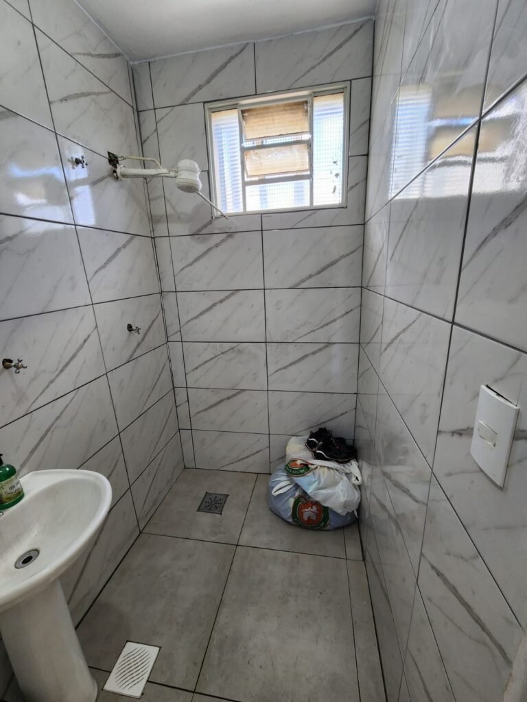 WC:- Piso frio cerâmico na cor cinza, azulejos até o teto em ordem, teto com pintura na cor branco em ordem, 01 interruptor, 01 espelho de luz, 04 registro com canopla, 01 chuveiro LorenBello Lorenzetti, 02 ralos sendo que 01 está com tampa de plástico e o outro com tampa de inox, 01 conjunto lavatório cerâmica branca com coluna cerâmica branca marca Fiori em ordem, torneira em ordem, vaso sanitário cerâmica branca com vazamento, válvula de descarga em ordem, porta de madeira com pintura na cor branco em ordem, maçaneta, fechadura e chave fixa em ordem, lâmpada bulbo led com spot em ordem, 01 vitro basculante com 05 vidros canelados em ordem.