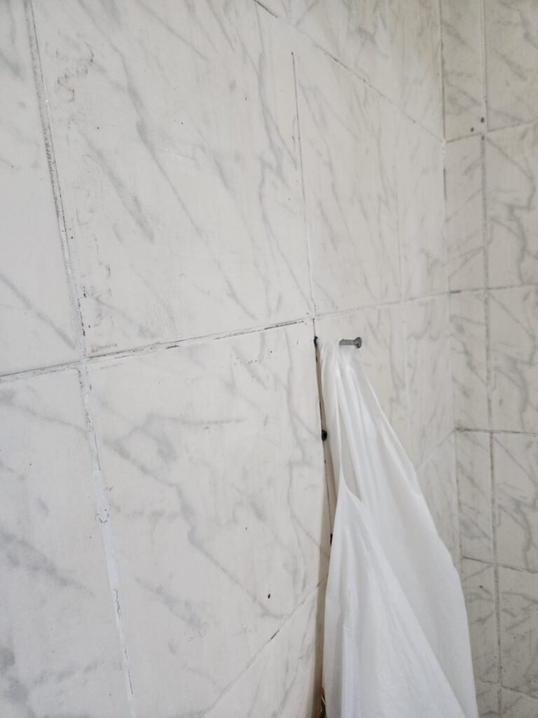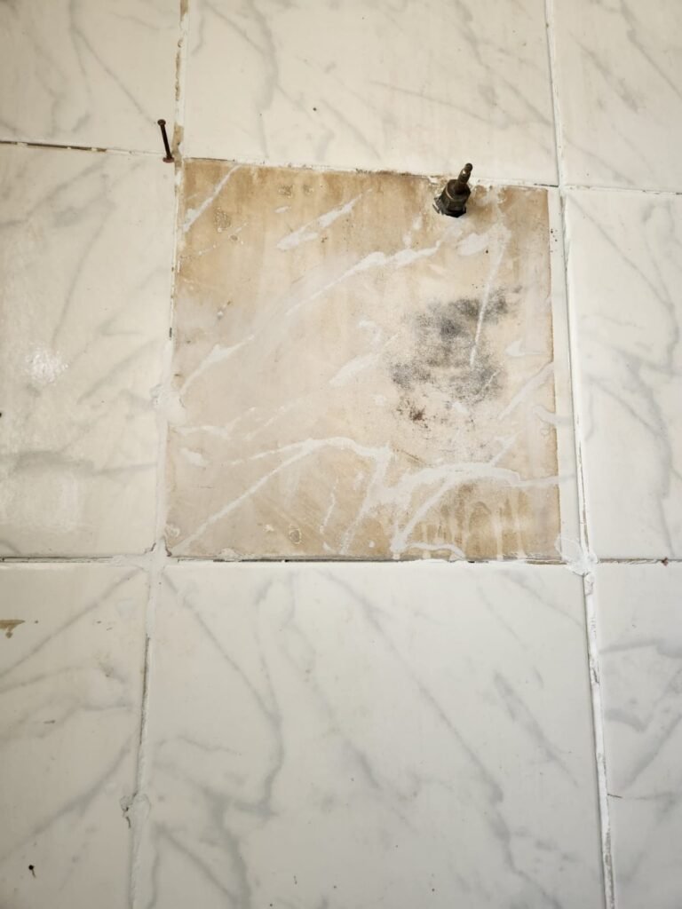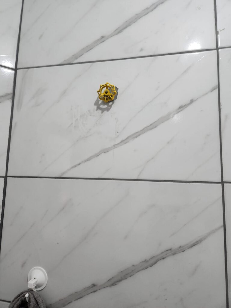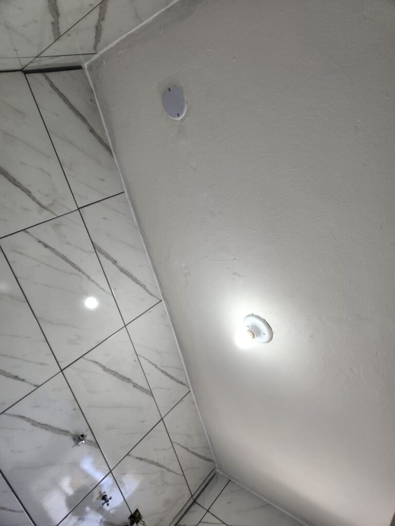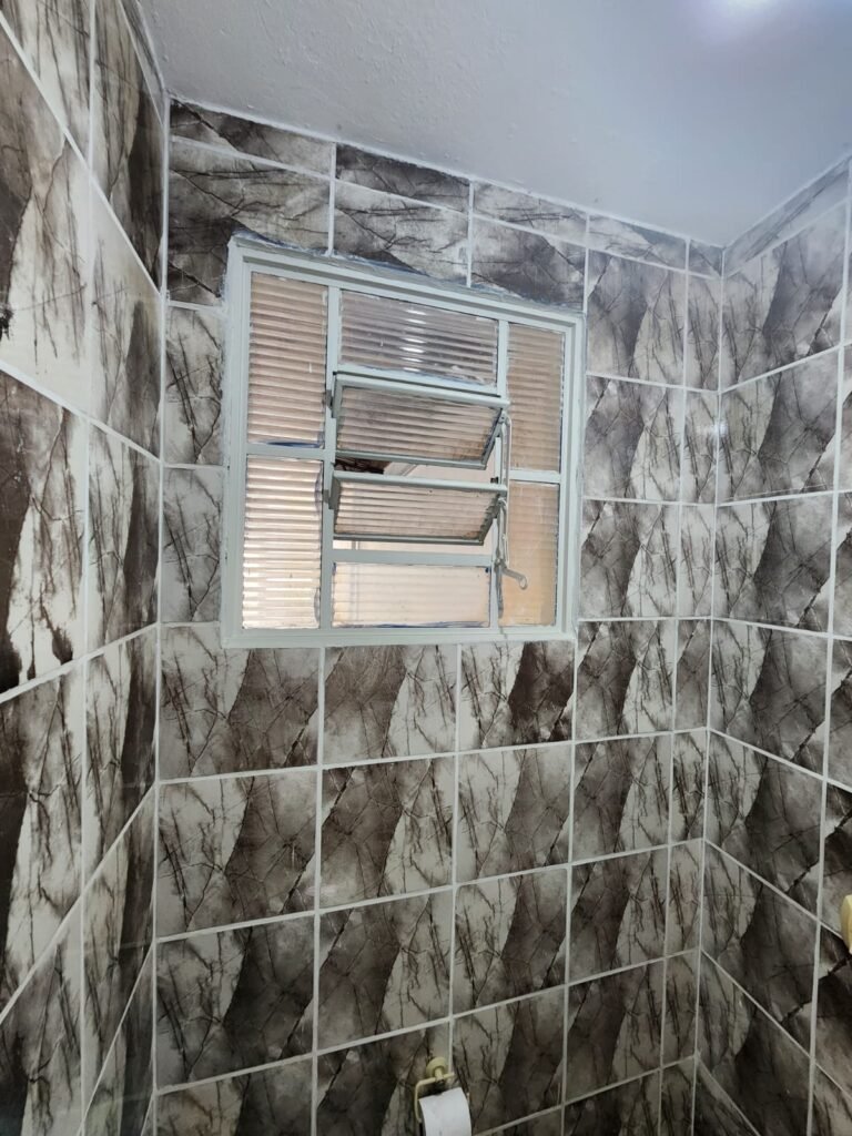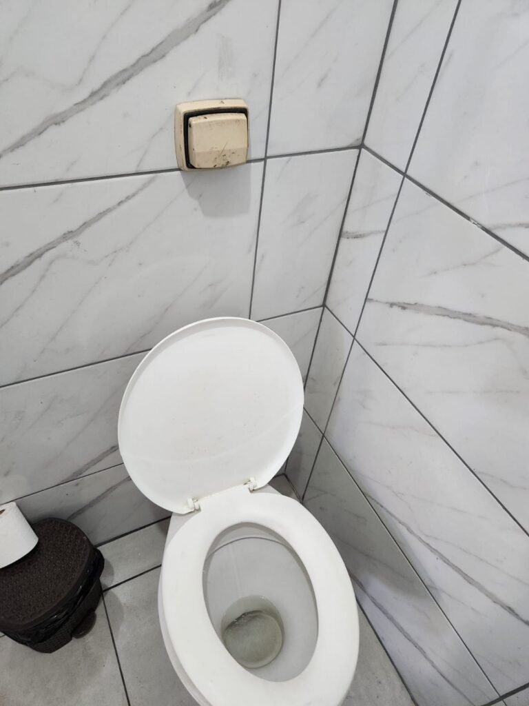 WC:- Piso frio cerâmico na cor cinza, azulejos até o teto em ordem, teto com pintura na cor branco em ordem, 01 interruptor, 01 espelho de luz, 04 registro com canopla, 01 chuveiro LorenBello Lorenzetti, 02 ralos sendo que 01 está com tampa de plástico e o outro com tampa de inox, 01 conjunto lavatório cerâmica branca com coluna cerâmica branca marca Fiori em ordem, torneira em ordem, vaso sanitário cerâmica branca com vazamento, válvula de descarga em ordem, porta de madeira com pintura na cor branco em ordem, maçaneta, fechadura e chave fixa em ordem, lâmpada bulbo led com spot em ordem, 01 vitro basculante com 05 vidros canelados em ordem.