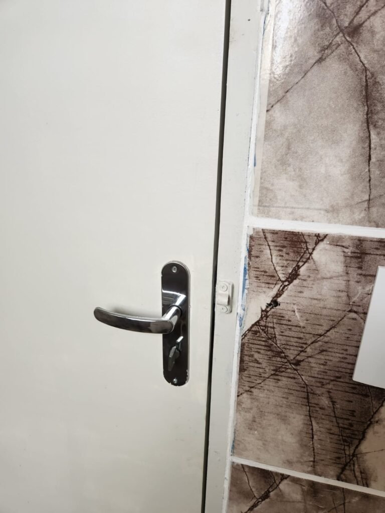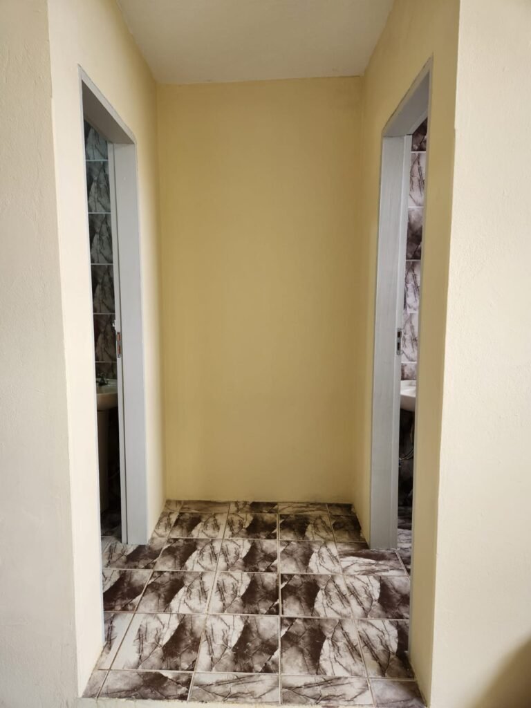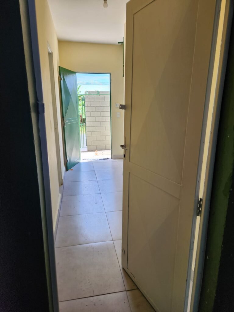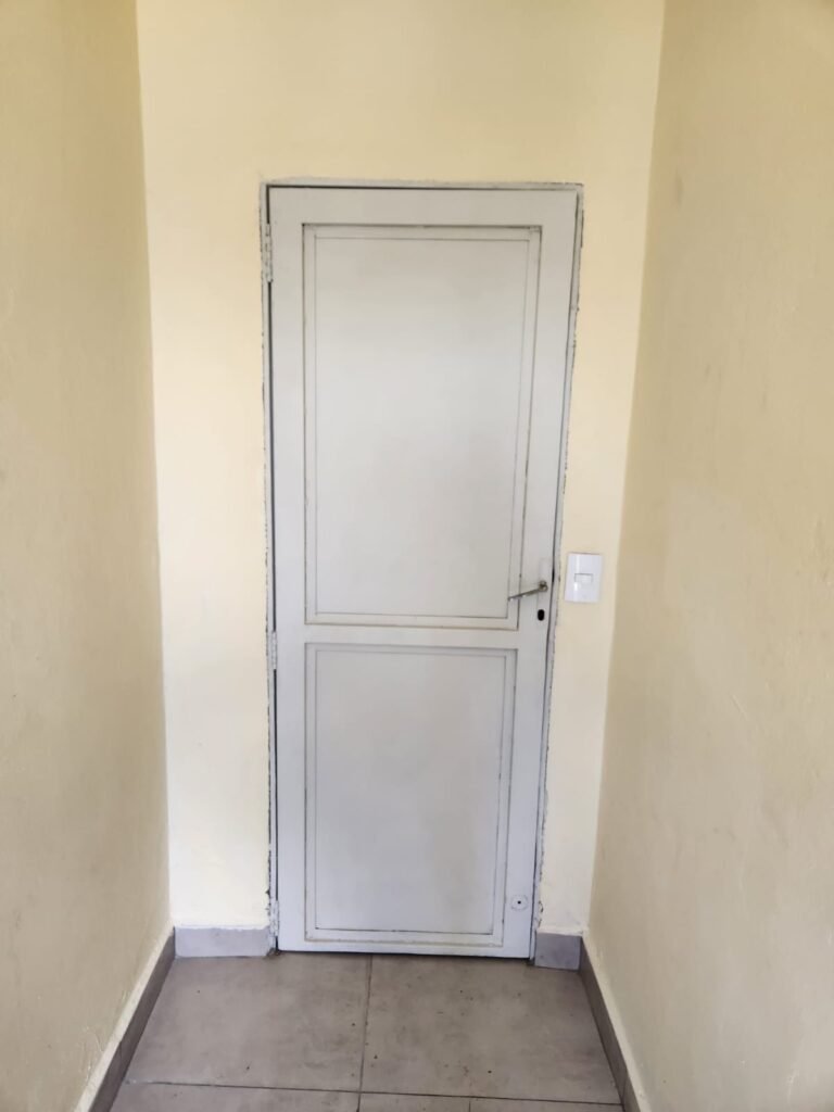 CORREDOR ENTRADA:- Piso frio cerâmico cinza em ordem, paredes com pintura nova na cor marfim em ordem, teto com pintura na cor branco em ordem, lâmpada bulbo led com spot, 02 interruptores, 02 espelhos de luz, 02 portas de ferro 01 com pintura na cor verde e outra na cor branco, sendo que na branca com maçaneta sem trava e sem fechadura, a outra em ordem.