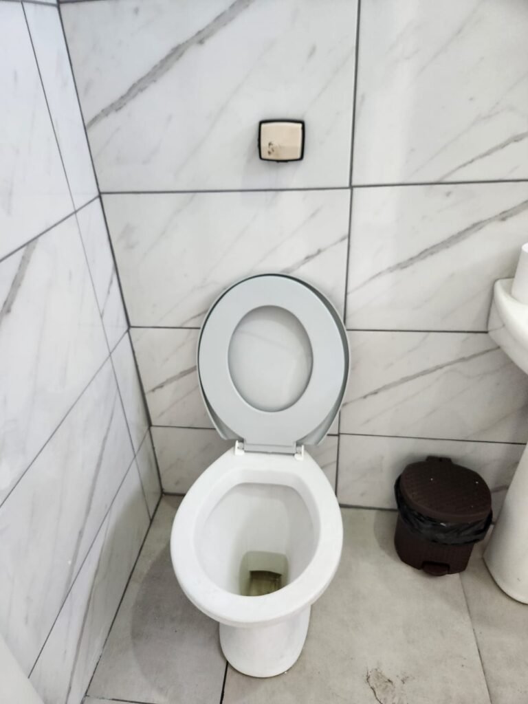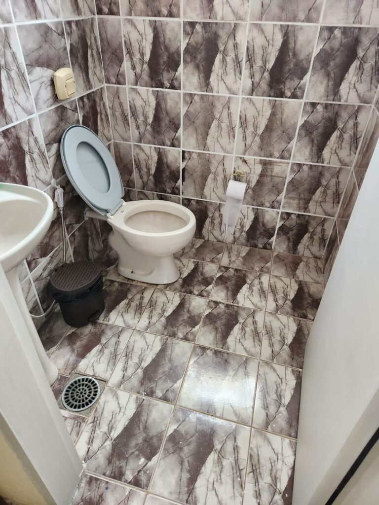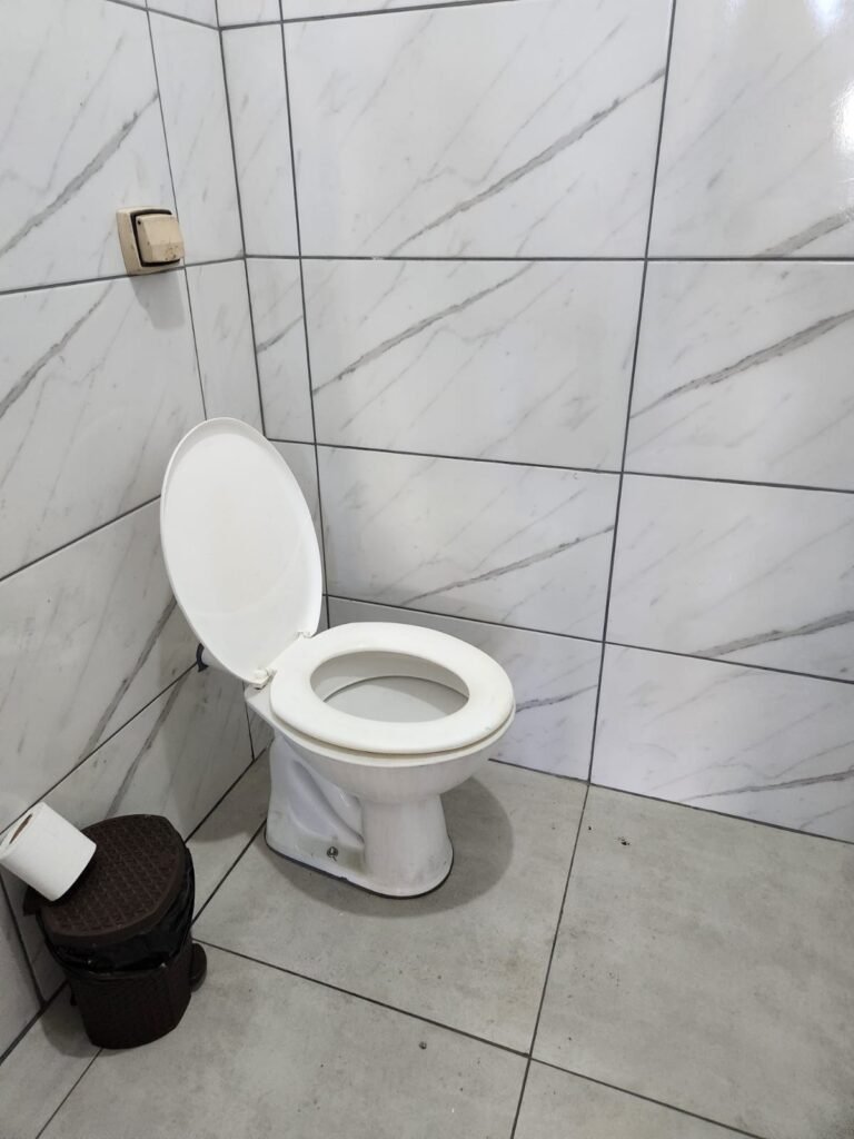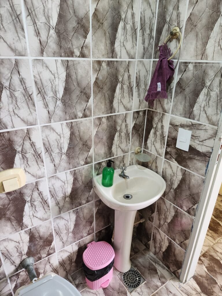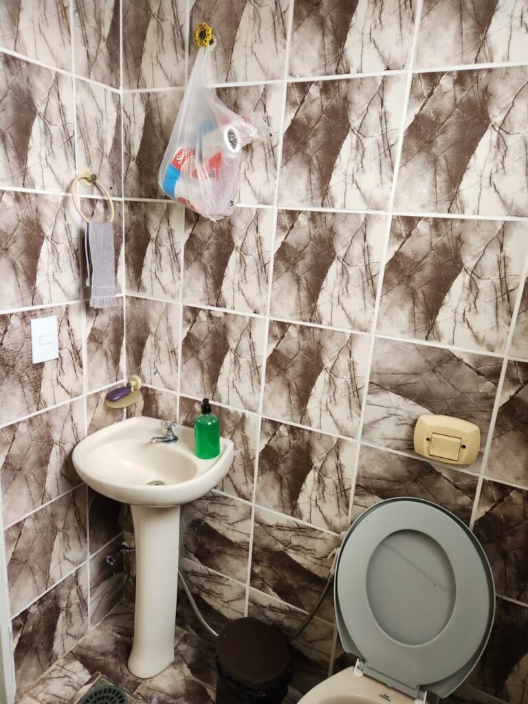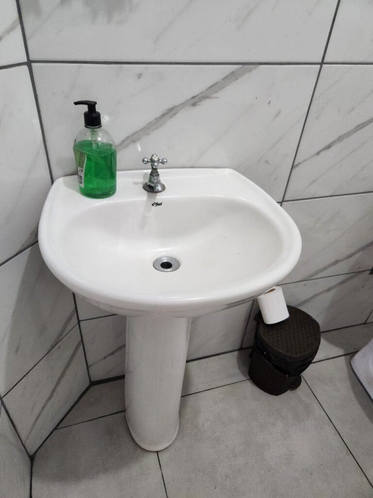 WC:- Piso frio cerâmico em ordem, paredes com azulejos marmorizados ate o teto em ordem, teto com pintura nova na cor branco em ordem, 01 interruptor sem espelho de luz, 01 registro, 01 lâmpada bulbo led com spot em ordem, 01 conjunto lavatório cerâmica branca com coluna cerâmica branca da marca Fiori em ordem, 01 torneira em ordem, 01 vaso sanitário cerâmica branca em ordem, válvula de descarga em ordem, porta de madeira com pintura na cor branco sem guarnição, maçaneta em ordem, fechadura em ordem.