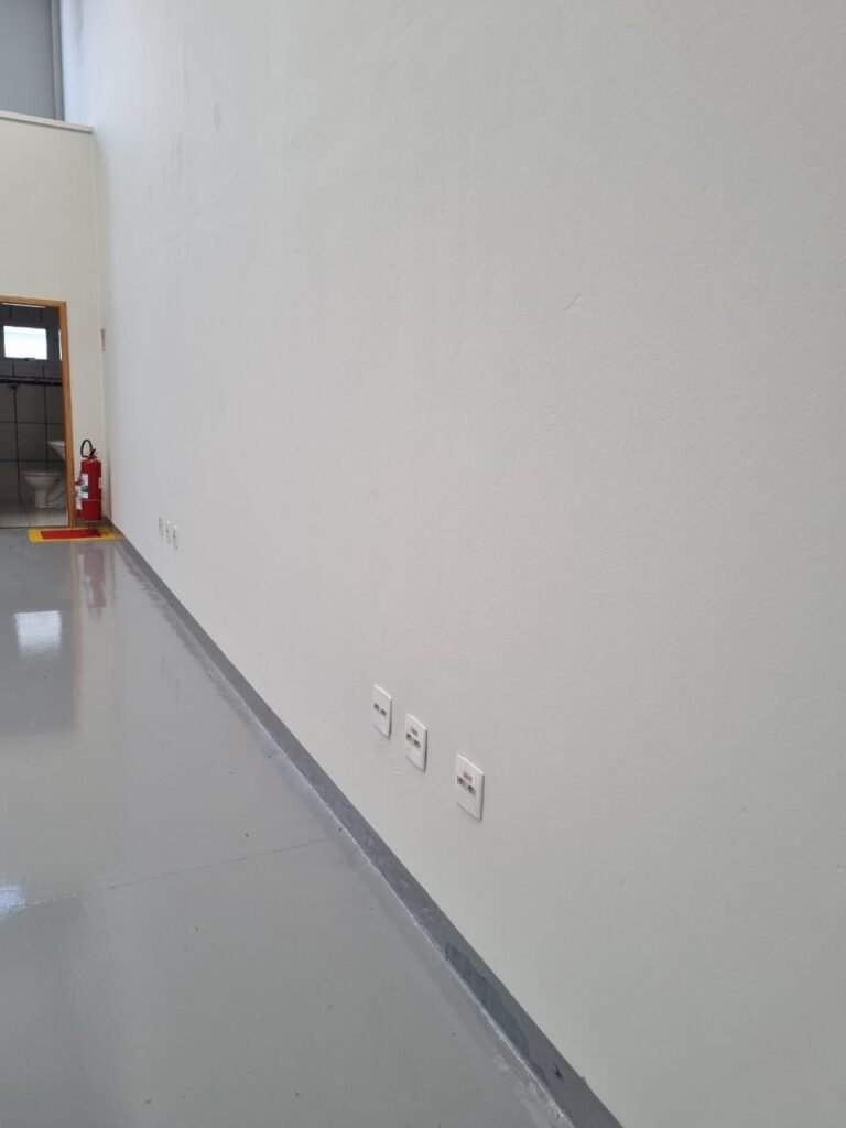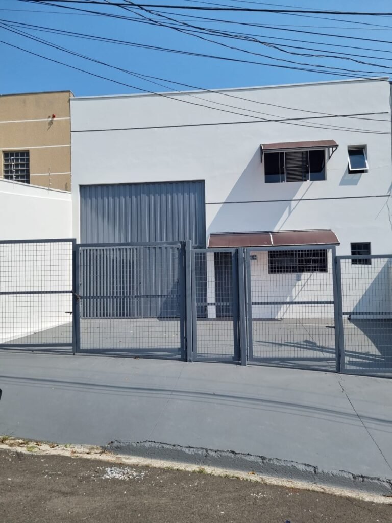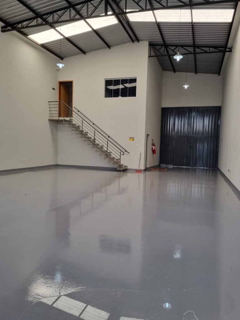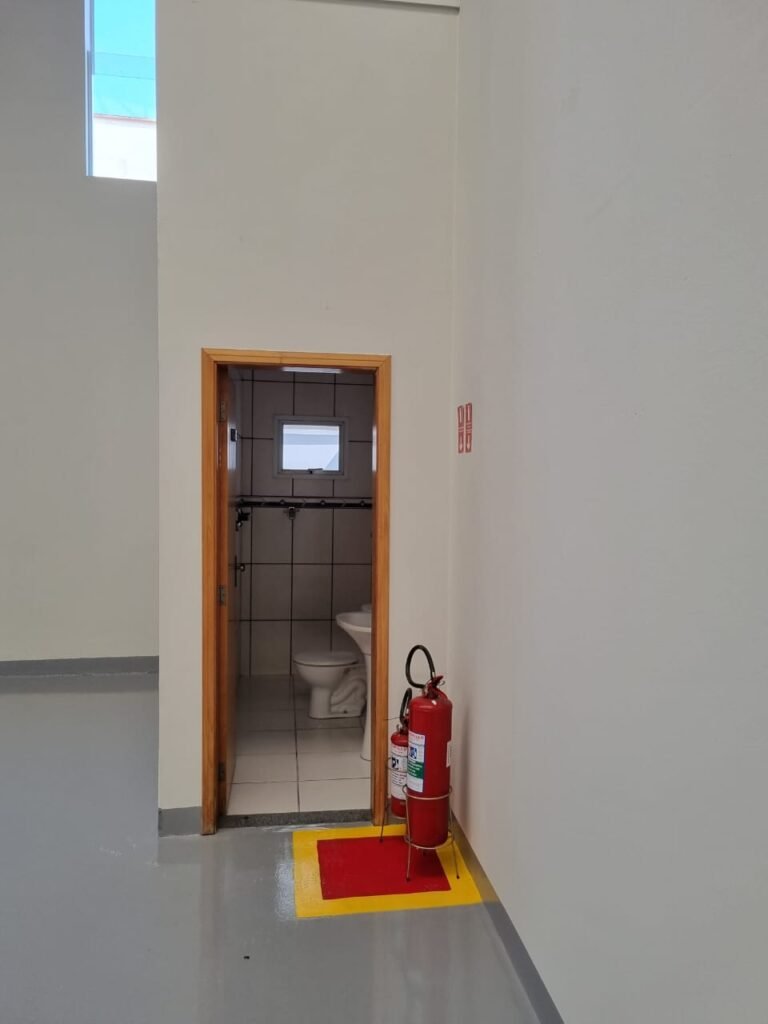 GALPÃO:- Piso de concreto usinado pintado de epóxi cinza pintura nova em ordem, paredes com reboco e pintura nova na cor branco em ordem, interruptor em ordem, tomadas 110/220/trifásico em ordem, 03 janelas com vidros temperados em ordem, telhado de telhas galvanizadas com faixas de telhas transparentes em ordem, estrutura de ferro para o telhado com pintura na cor preta em ordem, 05 luminárias com lâmpadas incandescentes em ordem, caixa d’água em ordem, 01 escada de concreto com faixas antiderrapantes, placas de sinalização em ordem, guarda corpo de ferro redondo e corrimão na cor cinza em ordem, 01 porta social de chapa dobrada cor cinza com fechadura e chaves em ordem, 04 extintores com sinalização no piso em ordem, sendo 02 pó químico e 02 de água.