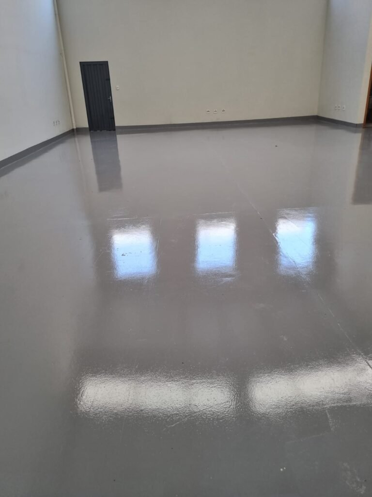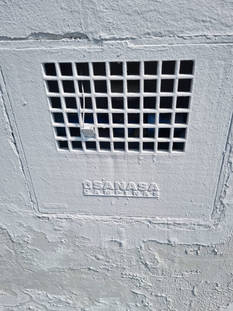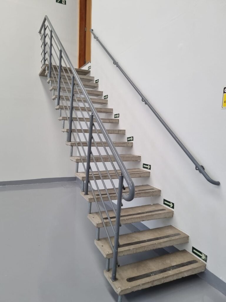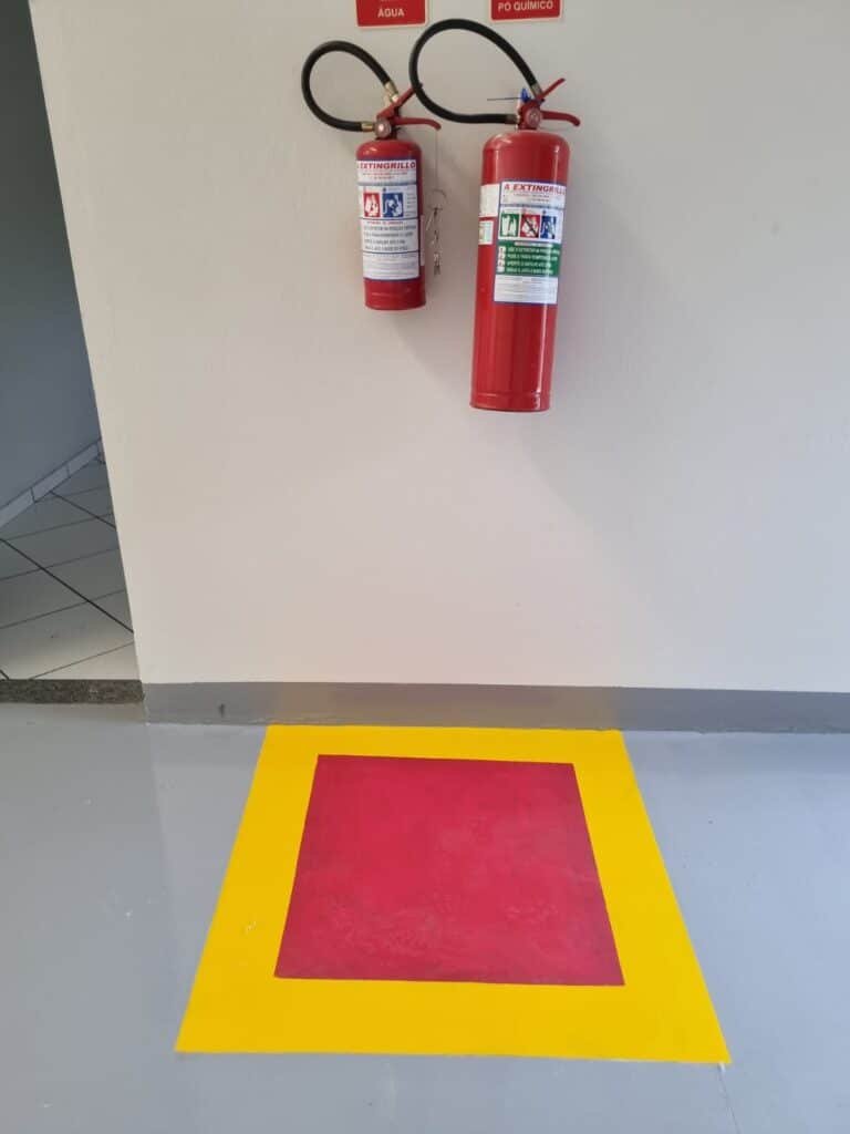 GALPÃO:- Piso de concreto usinado pintado de epóxi cinza pintura nova em ordem, paredes com reboco e pintura nova na cor branco em ordem, interruptor em ordem, tomadas 110/220/trifásico em ordem, 03 janelas com vidros temperados em ordem, telhado de telhas galvanizadas com faixas de telhas transparentes em ordem, estrutura de ferro para o telhado com pintura na cor preta em ordem, 05 luminárias com lâmpadas incandescentes em ordem, caixa d’água em ordem, 01 escada de concreto com faixas antiderrapantes, placas de sinalização em ordem, guarda corpo de ferro redondo e corrimão na cor cinza em ordem, 01 porta social de chapa dobrada cor cinza com fechadura e chaves em ordem, 04 extintores com sinalização no piso em ordem, sendo 02 pó químico e 02 de água.