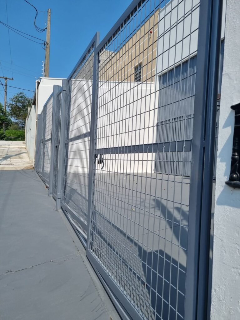 FACHADA:- Calçada piso de concreto com pintura nova na cor cinza em ordem, 02 portões de metalon e tela com duas abas com pintura nova na cor cinza em ordem, trincos e cadeados em ordem, caixa de correio em ordem, poste de força padrão CPFL em ordem, relógio de água padrão SANASA em ordem, 01 portão social de metalon e tela na cor cinza com cadeados e trincos em ordem, número 27 de aço inox em ordem.