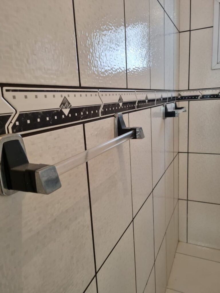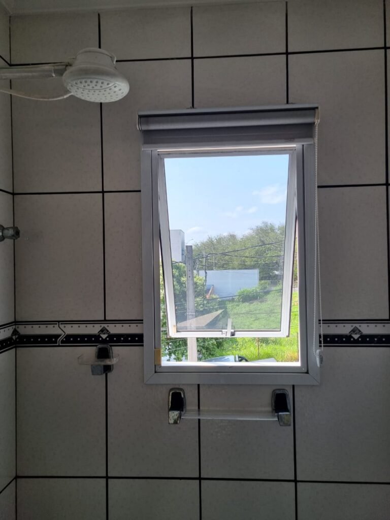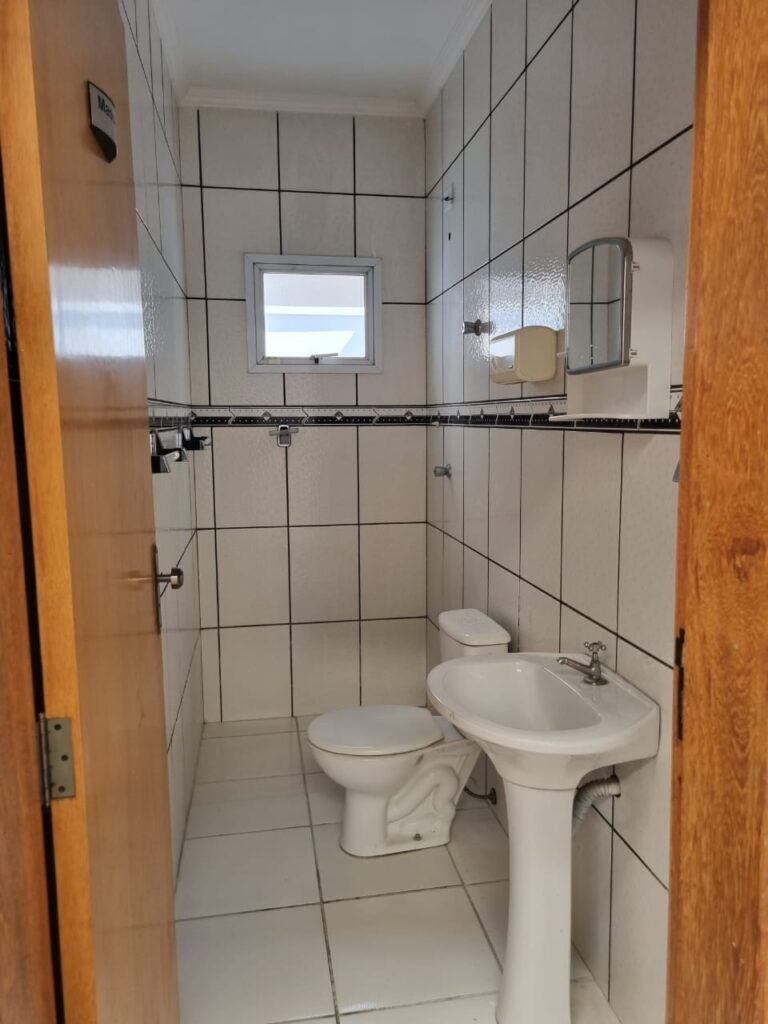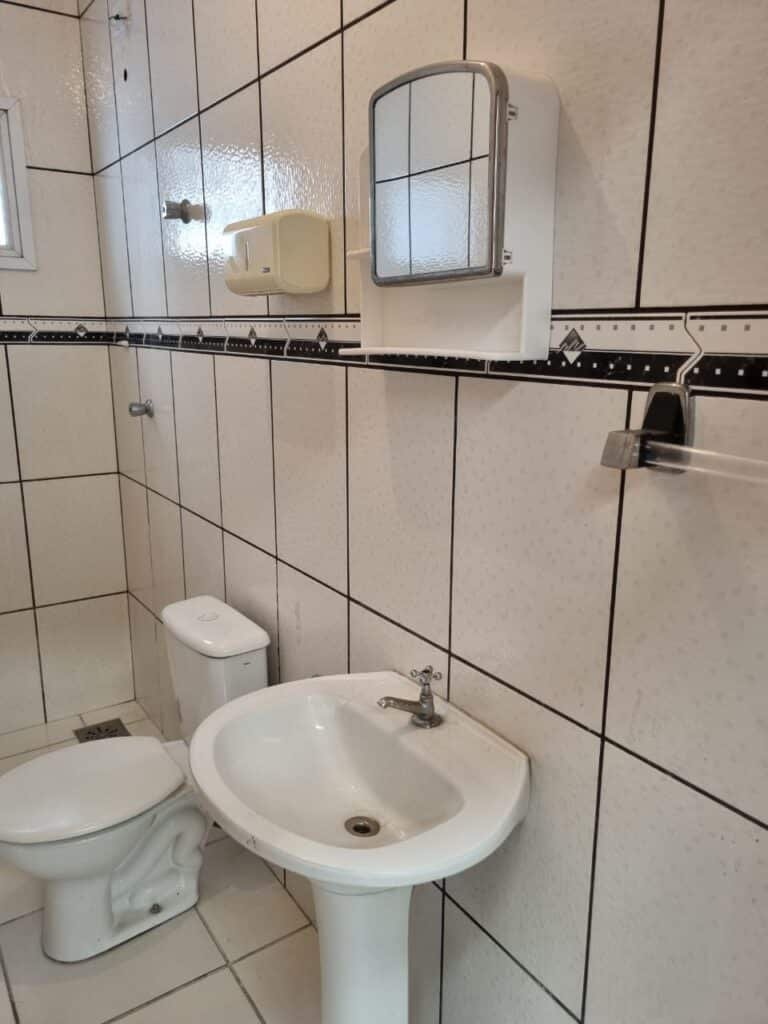 WC3:- Piso frio cerâmico da cor branca em ordem, parede com azulejos até o teto na cor branca com faixa em detalhes preto em ordem, 01 lâmpada led em ordem, 01 bocal sem lâmpada em ordem, 01 interruptor em ordem, conjunto lavatório cerâmica branca com coluna em ordem, sifão universal sanfonado em ordem, 01 torneira em ordem, conjunto de vaso sanitário com caixa acoplada e tampa em ordem, registro em ordem, porta de madeira envernizada em ordem, maçaneta em ordem, fechadura e chave fixa em ordem, suportes de papel higiênico e toalhas em ordem, espelho com armário em ordem, chuveiro Lorenzetti em ordem, 01 vitrô basculante com vidros em ordem, travas em ordem, persiana horizontal em ordem.