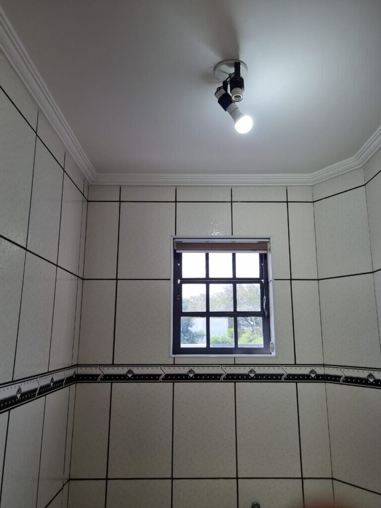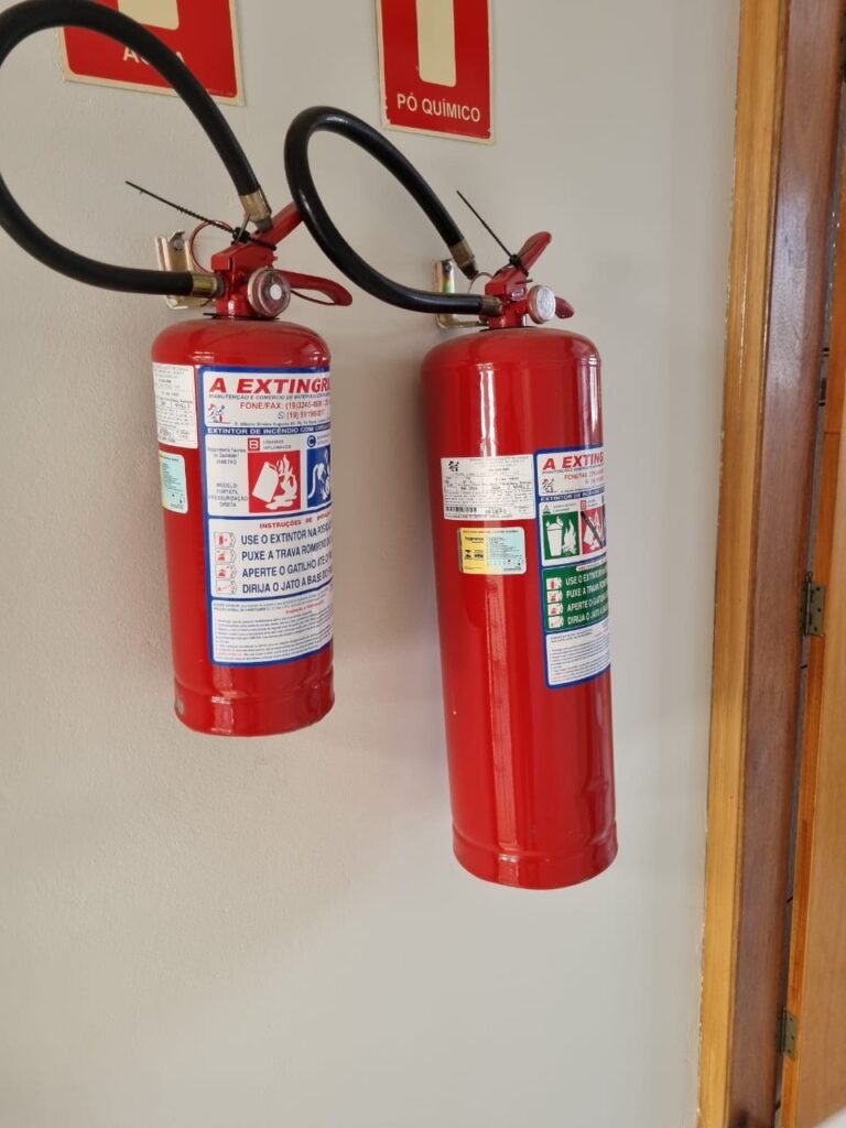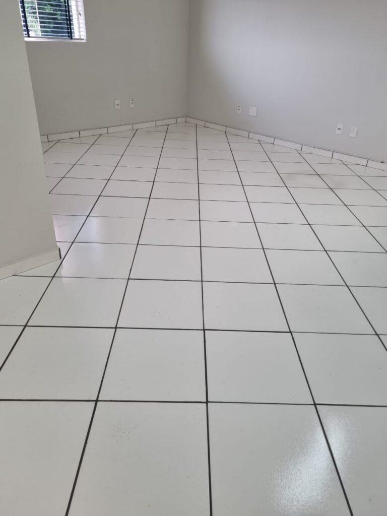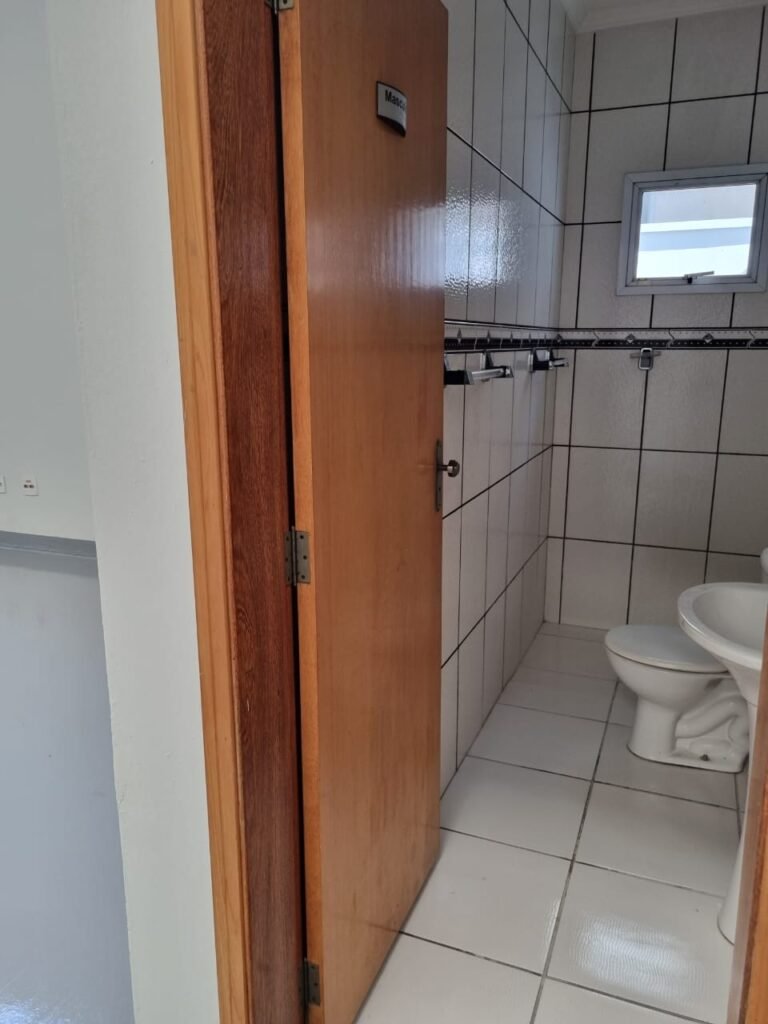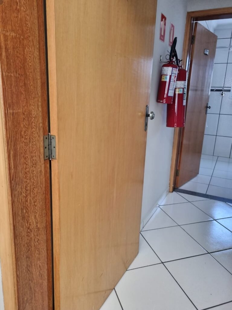 ESCRITÓRIO/1° PISO:- Piso frio cerâmico na cor branca em ordem, paredes com reboco e pintura na cor branca em ordem, teto com pintura na cor branca em ordem, gola de gesso com pintura na cor branca em ordem, 03 luminárias tubular em ordem, 03 lâmpadas tubular em ordem, interruptores em ordem, tomadas em ordem, cortina persiana em ordem, 01 porta de madeira envernizada em ordem, fechadura e chaves em ordem, 02 extintores sendo 01 pó químico e 01 água em ordem, 02 janelas de correr em ordem, travas em ordem, 01 porta de alumínio para o alçapão em ordem.
