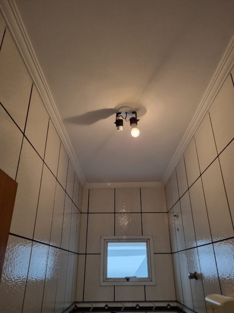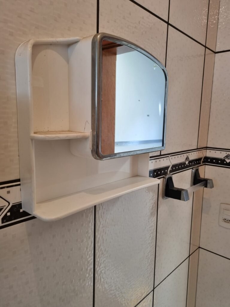 WC1:- Piso frio cerâmico da cor branca em ordem, parede com azulejos até o teto na cor branca com faixa em detalhes preto em ordem, 01 lâmpada led em ordem, 01 bocal sem lâmpada em ordem, 01 interruptor em ordem, conjunto lavatório cerâmico branca com coluna em ordem, sifão universal sanfonado em ordem, 01 torneira em ordem, conjunto de vaso sanitário com caixa acoplada e tampa em ordem, registro em ordem, porta de madeira envernizada em ordem, maçaneta em ordem, fechadura e chave fixa em ordem, suportes de papel higiênico e toalhas em ordem, espelho com armário em ordem, ponto para chuveiro em ordem, 01 janela basculante com vidro em ordem, trava em ordem, 01 ralo com tampa em ordem.