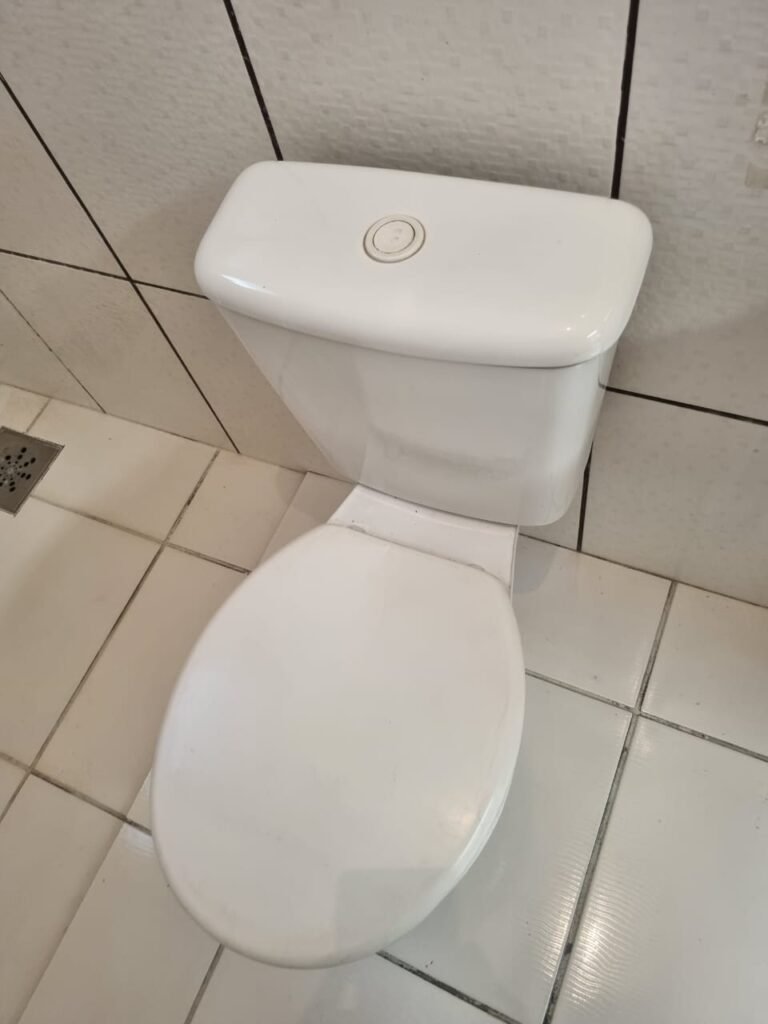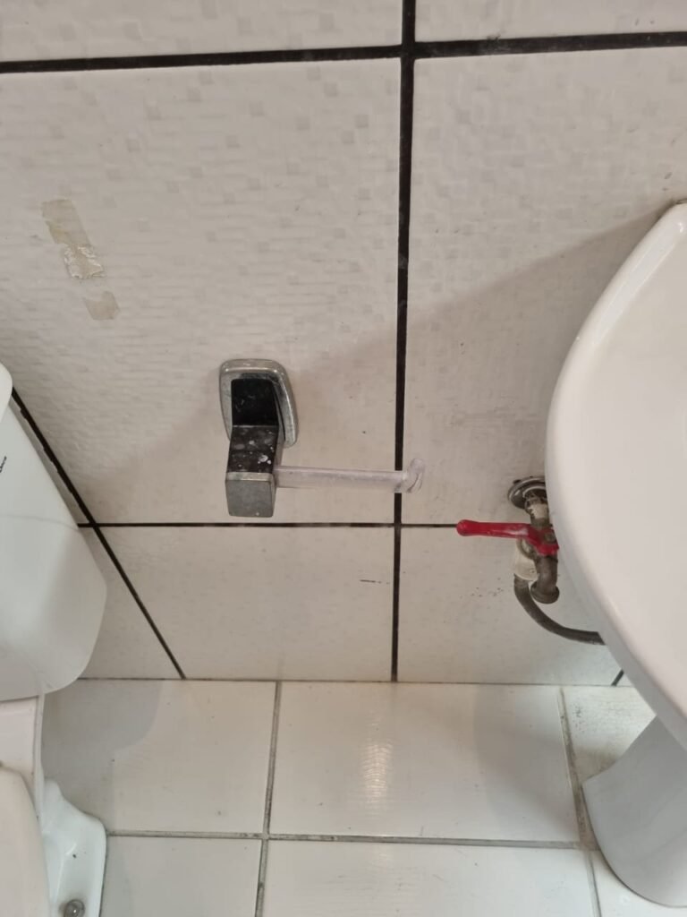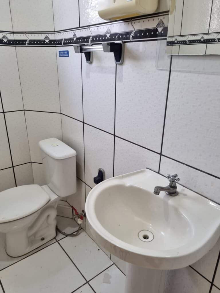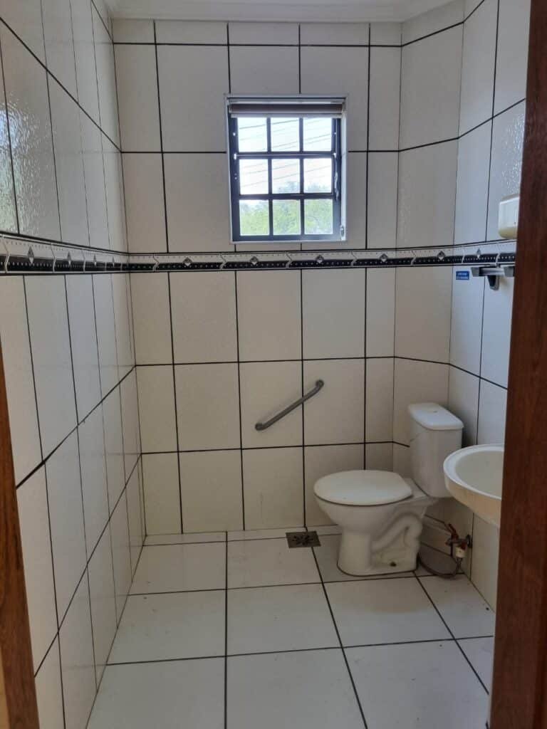 WC2:- Piso frio cerâmico da cor branca em ordem, parede com azulejos até o teto na cor branca com faixa em detalhes preto em ordem, 01 lâmpada led em ordem, 01 bocal sem lâmpada em ordem, 01 interruptor em ordem, conjunto lavatório cerâmica branca com coluna em ordem, sifão universal sanfonado em ordem, 01 torneira em ordem, conjunto de vaso sanitário com caixa acoplada e tampa em ordem, registro em ordem, porta de madeira envernizada em ordem, maçaneta em ordem, fechadura e chave fixa em ordem, suportes de papel higiênico e toalhas em ordem, barra para acessibilidade em ordem, placas de sinalização de WC/M, WCF/ Ede acessibilidade, 01 vitrô basculante com 09 vidros em ordem, trava em ordem, 01 ralo com tampa de ferro em ordem.