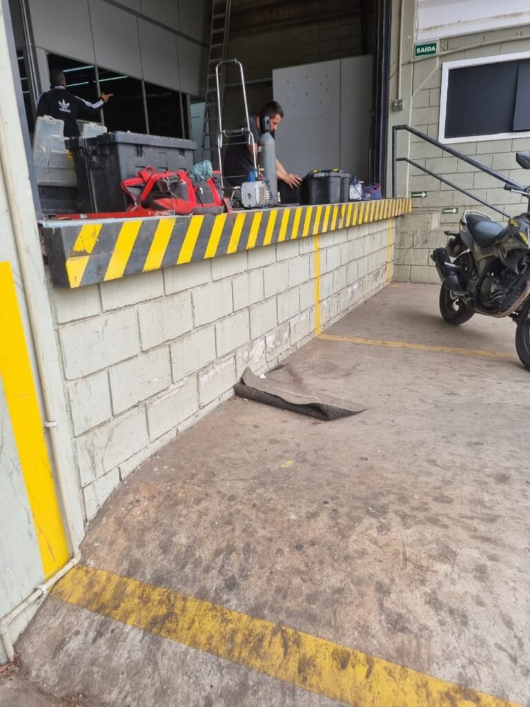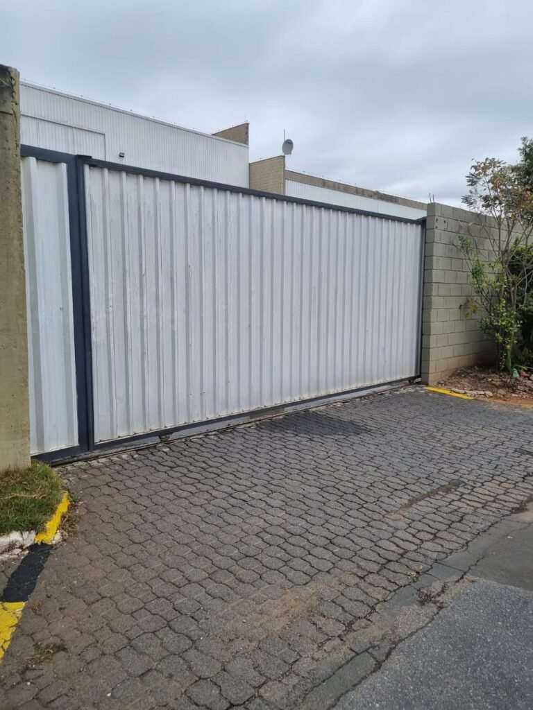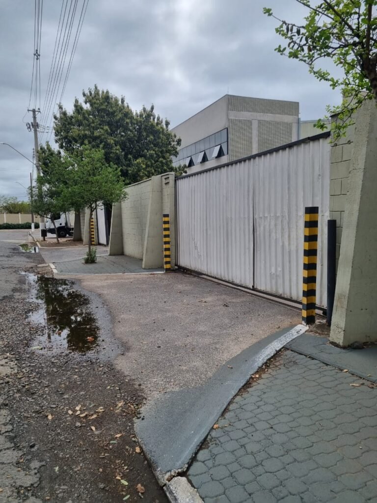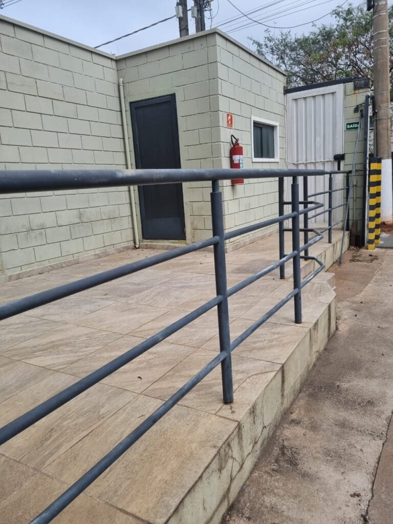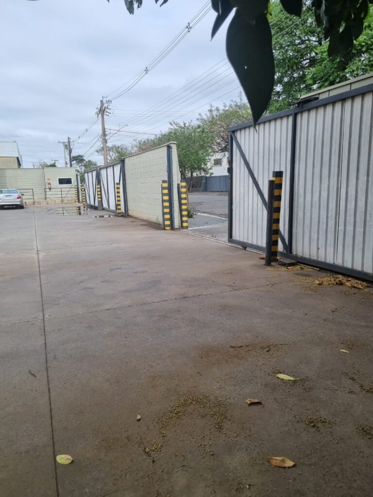 FACHADA:- Muros de blocos aparente com pintura na cor bege acinzentado em ordem, 03 portões deslizante de chapa galvanizadas com pintura na cor branco em ordem, roldanas em ordem, 12 trilhos para proteção dos portões com pintura na cor amarelo e preto em ordem, padrão de energia e água em ordem, 01 aparelho de interfone HDL em ordem, nº 460 fixado no muro em ordem, pátio piso concreto usinado com trincas e 09 demarcações de vagas com pintura na cor amarelo em ordem, 18 plataformas batedoras de ferro em ordem, escada de alvenaria com 03 degraus revestida com piso frio cerâmico em ordem, corrimão tubular com pintura na cor preto em ordem, entrada da guarita com piso frio cerâmico com trincas e guarda corpo com pintura na cor preto em ordem, fachada do administrativo com blocos aparente e pintura na cor bege acinzentado e colunas e vigas com pintura na cor branco neve em ordem, fachada do galpão com telhas galvanizadas com pintura na cor branco neve em ordem, para raio em toda a extensão do telhado em ordem, portão social com pintura na cor preto, fechadura elétrica HDL em ordem, 05 refletores de LED em ordem.