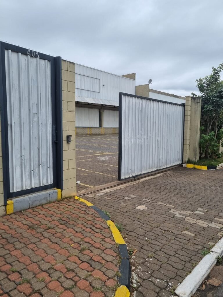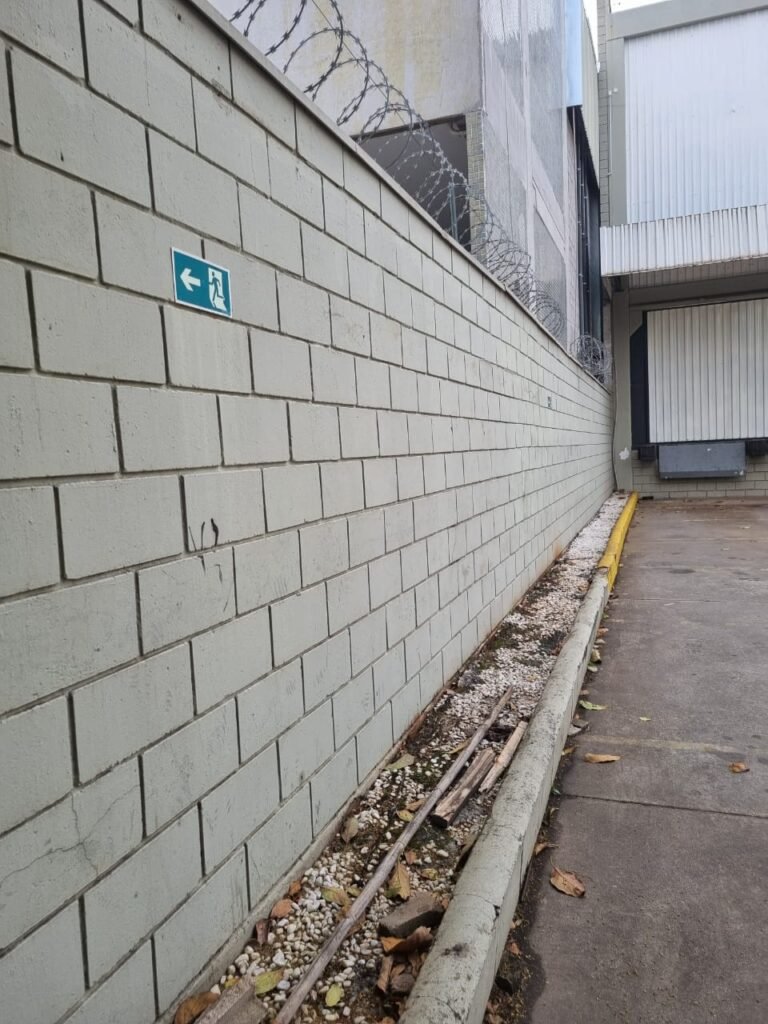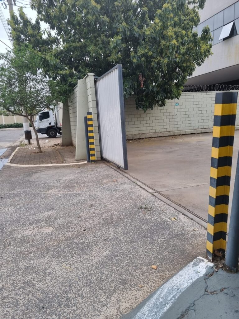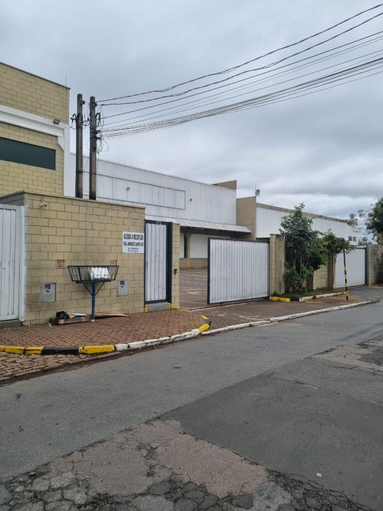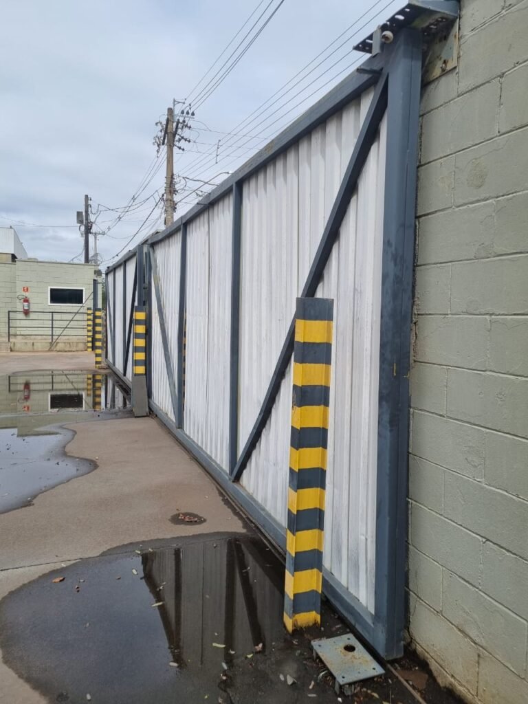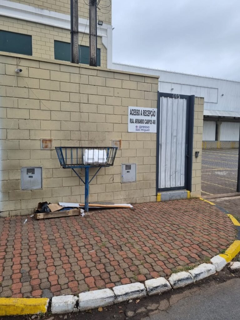 FACHADA:- Muros de blocos aparente com pintura na cor bege acinzentado em ordem, 03 portões deslizante de chapa galvanizadas com pintura na cor branco em ordem, roldanas em ordem, 12 trilhos para proteção dos portões com pintura na cor amarelo e preto em ordem, padrão de energia e água em ordem, 01 aparelho de interfone HDL em ordem, nº 460 fixado no muro em ordem, pátio piso concreto usinado com trincas e 09 demarcações de vagas com pintura na cor amarelo em ordem, 18 plataformas batedoras de ferro em ordem, escada de alvenaria com 03 degraus revestida com piso frio cerâmico em ordem, corrimão tubular com pintura na cor preto em ordem, entrada da guarita com piso frio cerâmico com trincas e guarda corpo com pintura na cor preto em ordem, fachada do administrativo com blocos aparente e pintura na cor bege acinzentado e colunas e vigas com pintura na cor branco neve em ordem, fachada do galpão com telhas galvanizadas com pintura na cor branco neve em ordem, para raio em toda a extensão do telhado em ordem, portão social com pintura na cor preto, fechadura elétrica HDL em ordem, 05 refletores de LED em ordem.