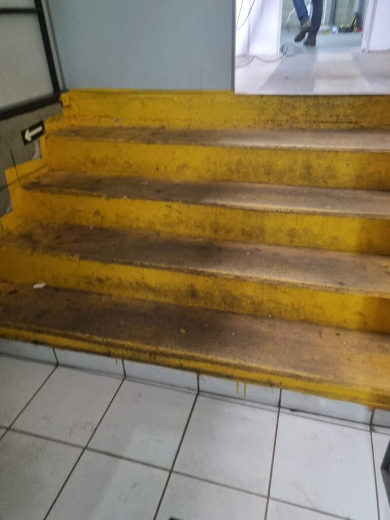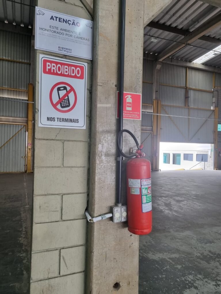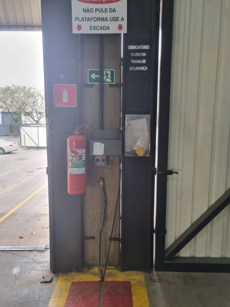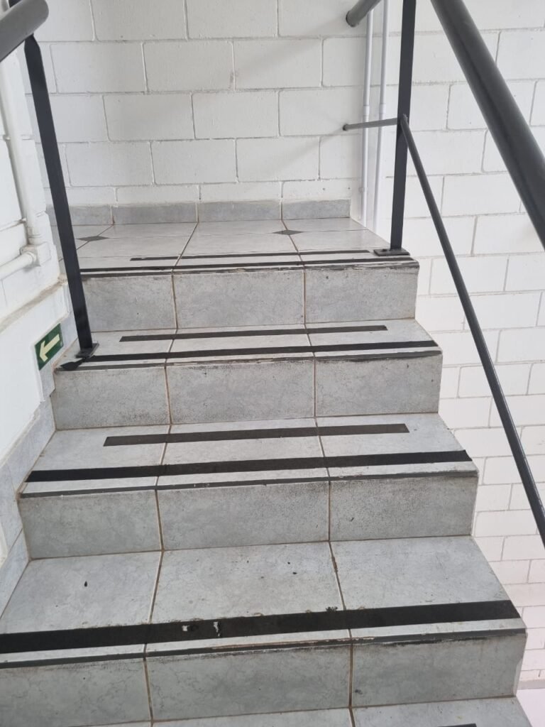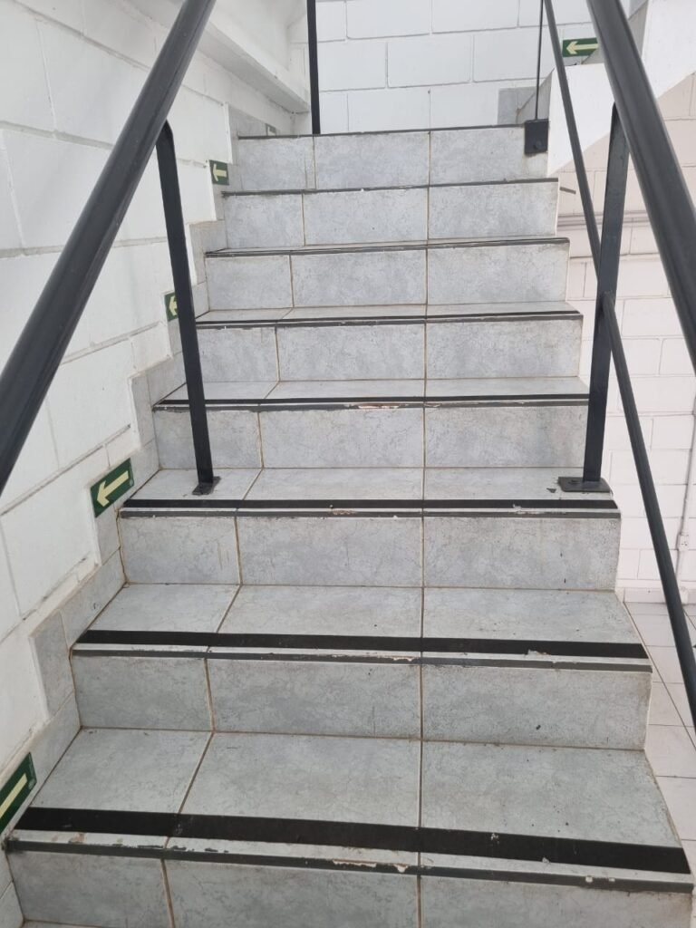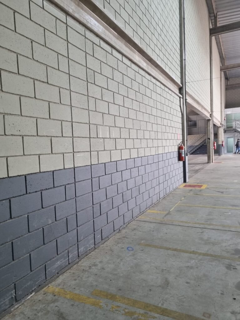 GALPÃO:- Escada de alvenaria com pintura na cor amarelo em ordem, piso concreto usinado e polido em ordem, paredes de bloco aparente com pintura na cor bege acinzentado e barrado na cor cinza escuro sendo que 01 parede esta com manchas brancas restante em ordem, 10 lustres tipo prato com 06 lâmpadas LED alta potência em ordem, 04 portas tipo guilhotina com pintura na cor branco em ordem, roldanas e contra pesos em ordem, 08 extintores água 10 litros 2-A recarregado em agosto/2023, lâmpadas de emergência em ordem, telhado telha grega trapezoidal e telhas translucidas em ordem, 15 holofotes de LED sendo que 05 estão piscando.