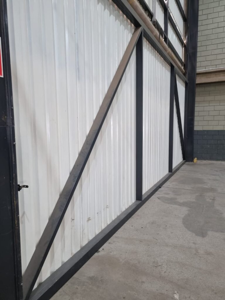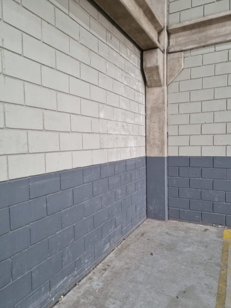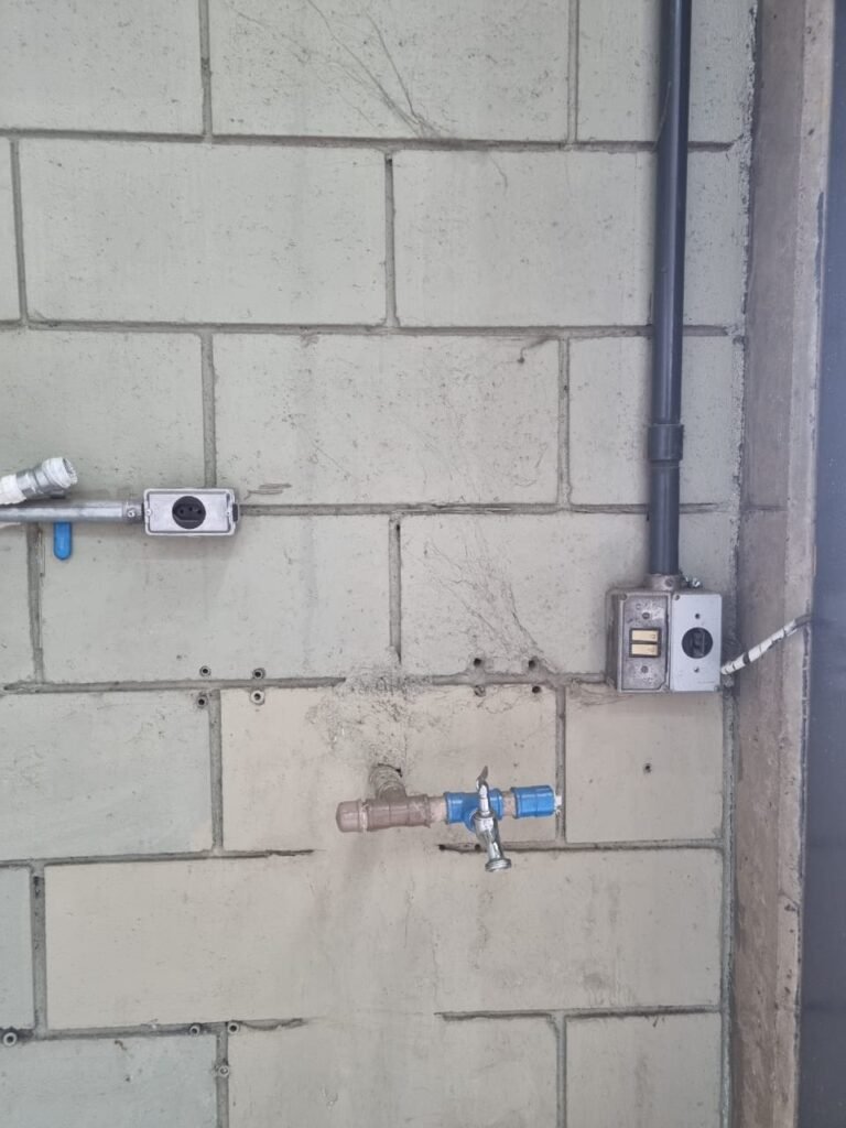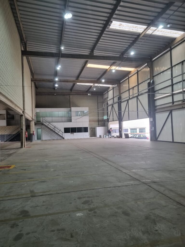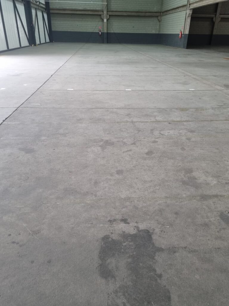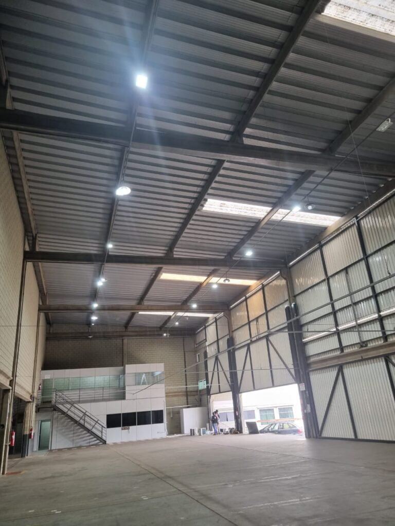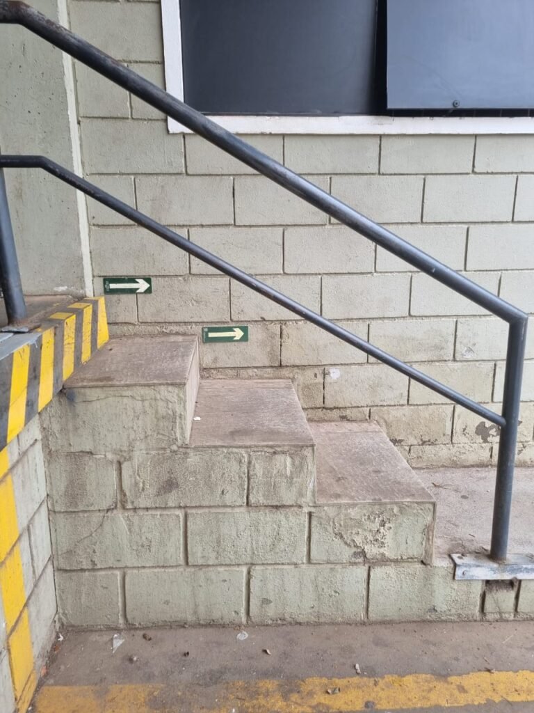 GALPÃO:- Escada de alvenaria com pintura na cor amarelo em ordem, piso concreto usinado e polido em ordem, paredes de bloco aparente com pintura na cor bege acinzentado e barrado na cor cinza escuro sendo que 01 parede esta com manchas brancas restante em ordem, 10 lustres tipo prato com 06 lâmpadas LED alta potência em ordem, 04 portas tipo guilhotina com pintura na cor branco em ordem, roldanas e contra pesos em ordem, 08 extintores água 10 litros 2-A recarregado em agosto/2023, lâmpadas de emergência em ordem, telhado telha grega trapezoidal e telhas translucidas em ordem, 15 holofotes de LED sendo que 05 estão piscando.