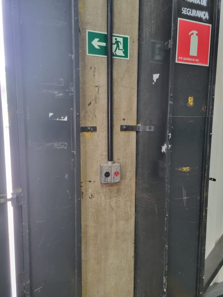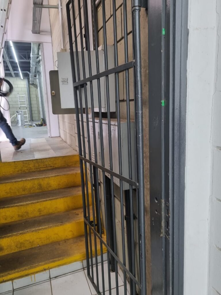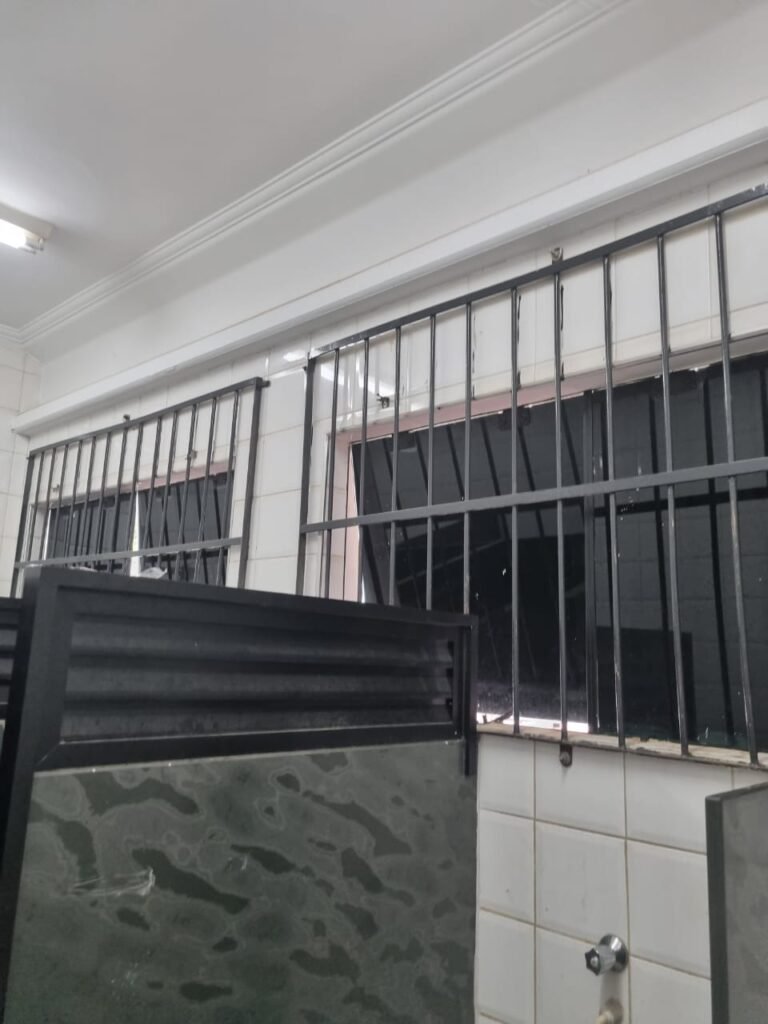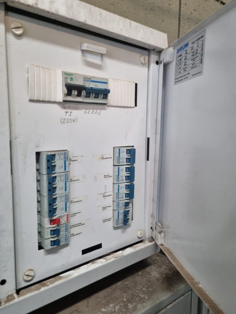 SALA ADMINISTRATIVA:- Piso frio cerâmico com manchas claras restante em ordem, paredes com blocos aparente e pintura na cor branco neve em com manchas, teto e gola de gesso com pintura na cor branco neve em ordem, 02 portas de madeira com pintura na cor preto em ordem, fechadura sem chave e maçanetas em ordem, porta de saída para o galpão com grade proteção em ordem, 02 Vitrô de correr com fechaduras e chaves em ordem, vidros blindex transparente em ordem, 02 persianas verticais quebradas, 02 extintores: 01 de pó químico 04 KG 20-B:C com recarregado em agosto/2023, 01 água 10 litros 2-A com recarregado em agosto/2023, 01 lâmpada de emergência, parte elétrica por conduletes, 02 luminárias duplas em ordem, 08 lâmpadas tubulares em ordem.