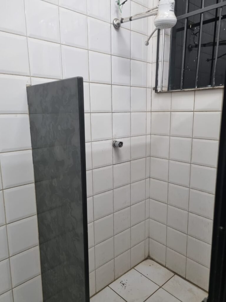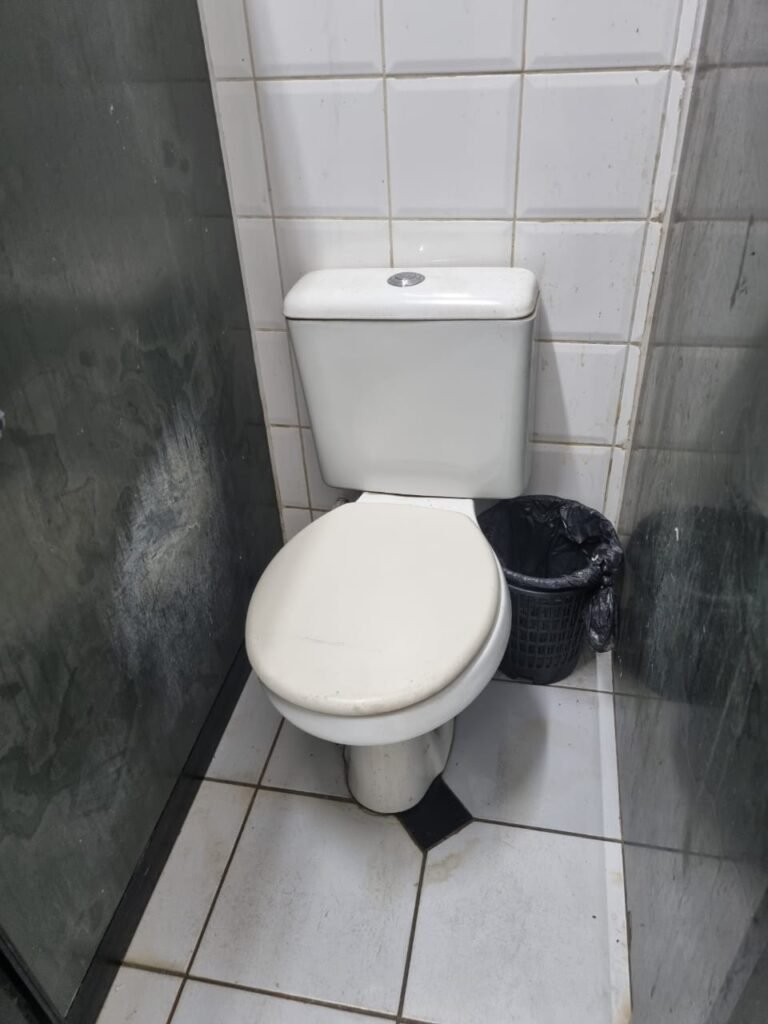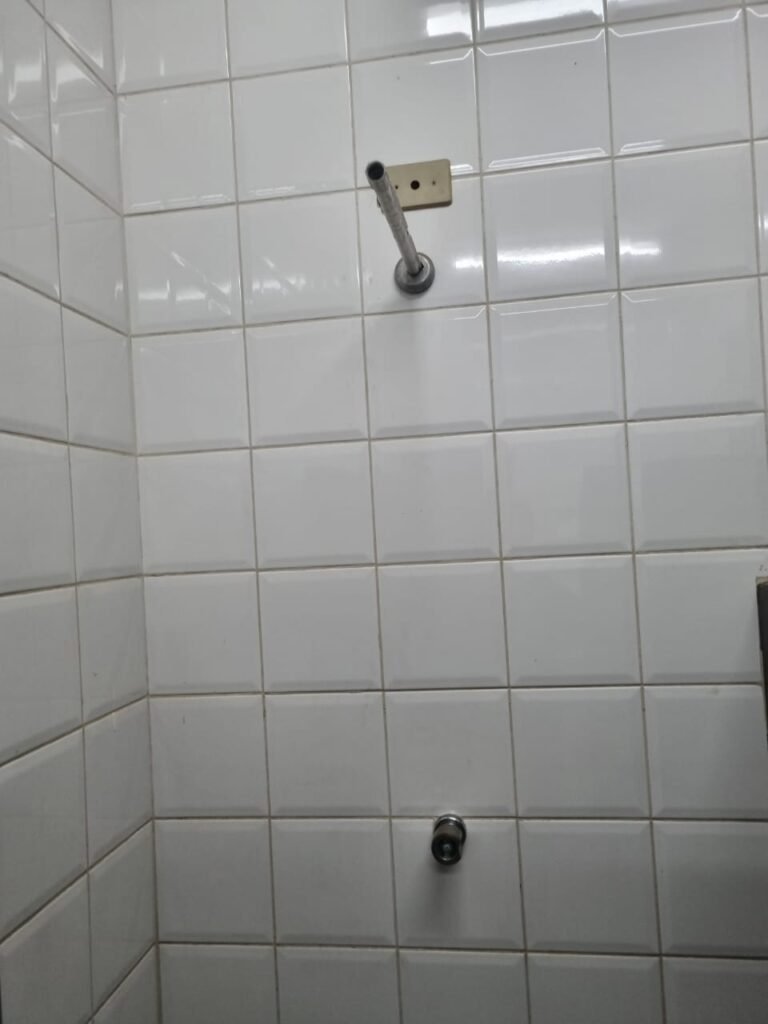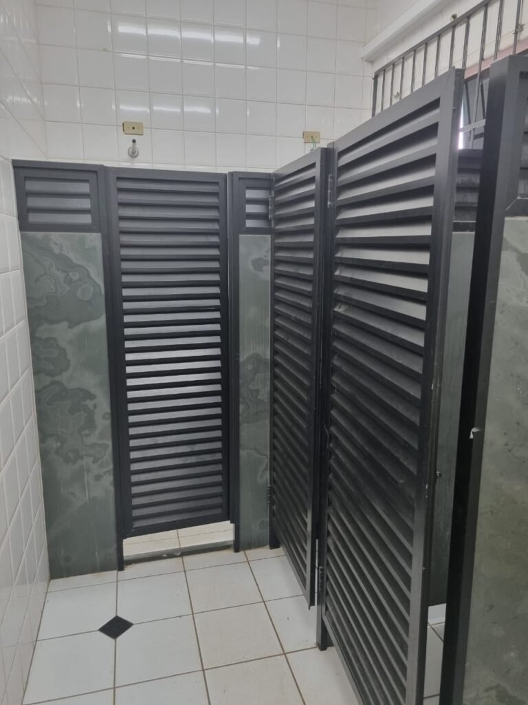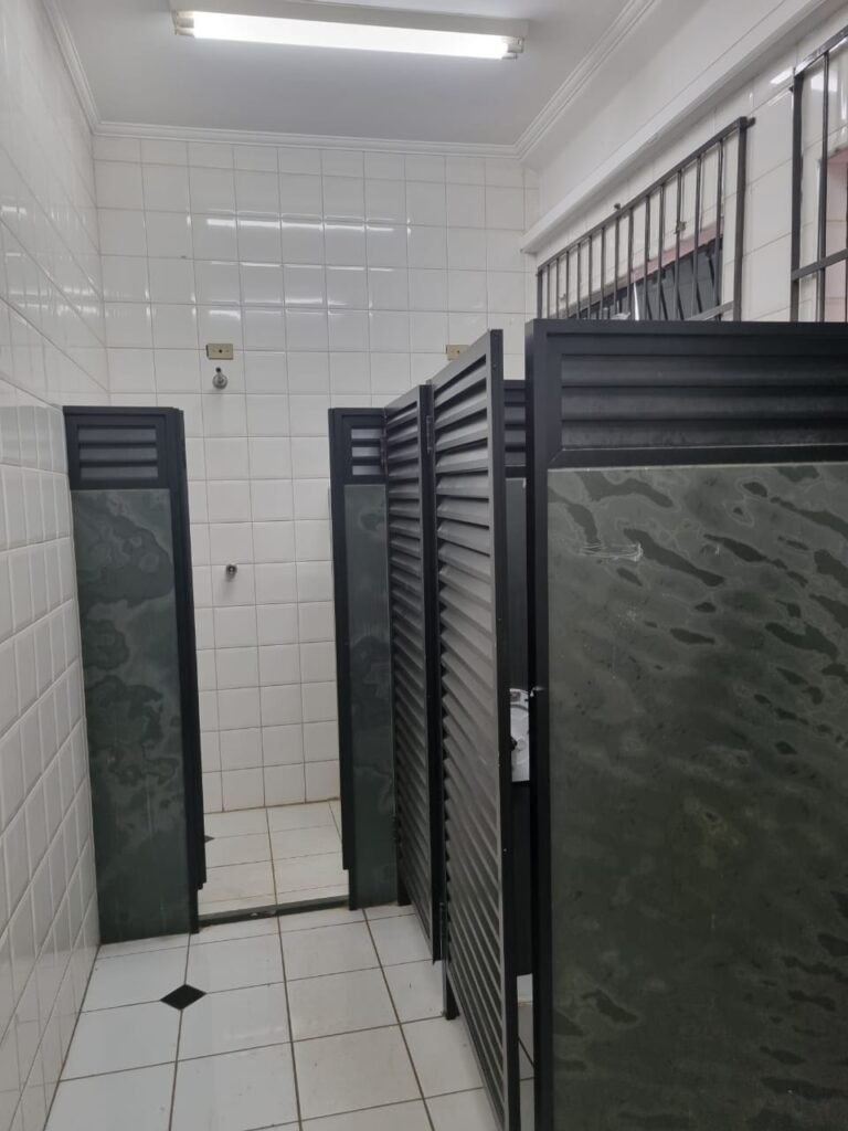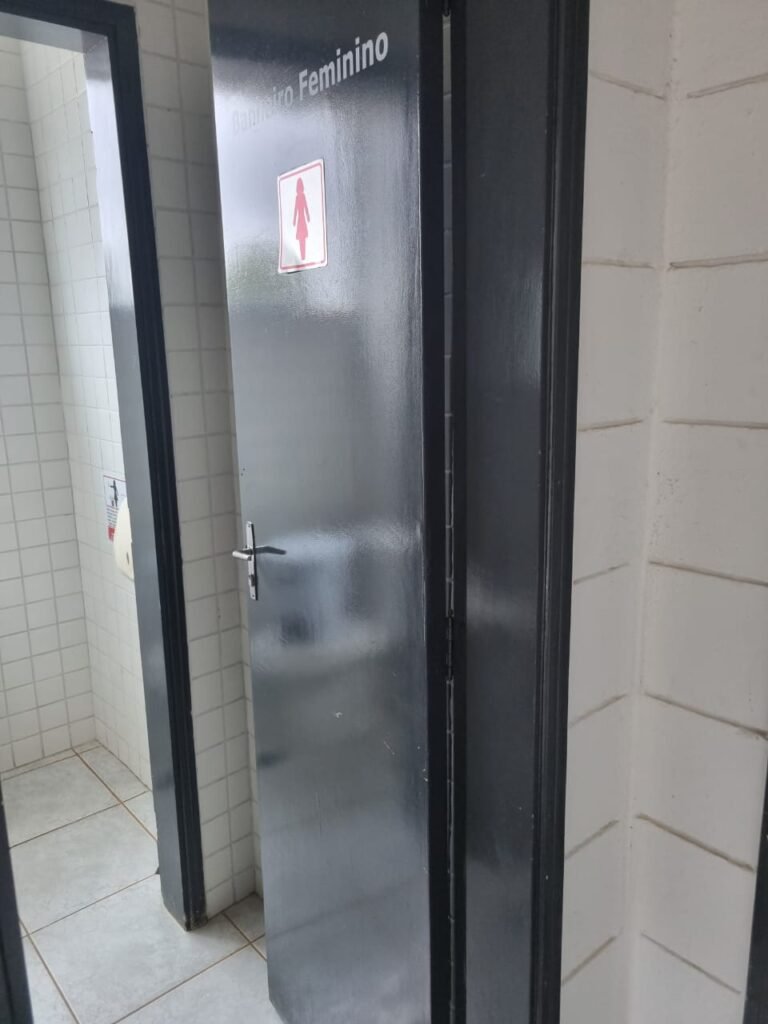 VESTIÁRIO:-Piso frio cerâmico em ordem, 02 ralos em ordem, azulejo até o teto em ordem, 02 luminárias duplas em ordem 04 lâmpadas tubulares em ordem, 01 chuveiro Lorenzetti Maxi Ducha 220v em ordem, 04 registro em ordem, porta de madeira com pintura na cor preto em ordem, 02 conjunto de vaso sanitário e caixa acoplada de cerâmica branca em ordem, 02 tampas vaso sanitário em ordem, 01 mictório de cerâmica branca em ordem, 06 divisórias mármore em ordem, vitrô sem puxadores, 04 vidros blidex liso transparente com insufilme em ordem, grade de proteção em ordem, pia mármore branco em ordem, cuba cerâmica, torneira e sifão universal em ordem, 01 interruptor em ordem, 01 tomada em ordem, teto e gola de gesso com pintura na cor branco neve em ordem, 03 portas de alumínio anodizado na cor preto em ordem.