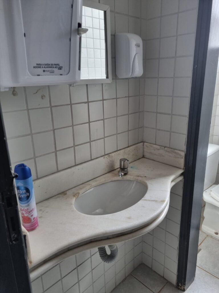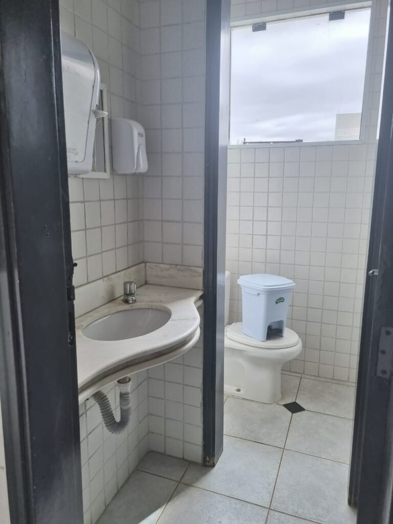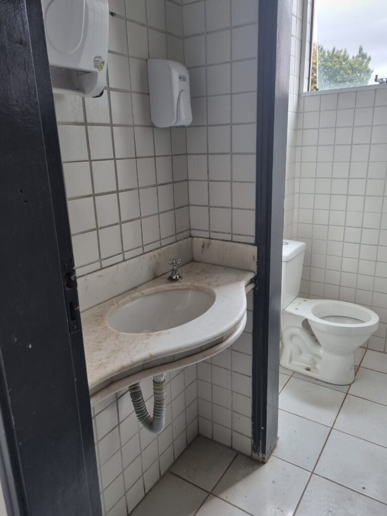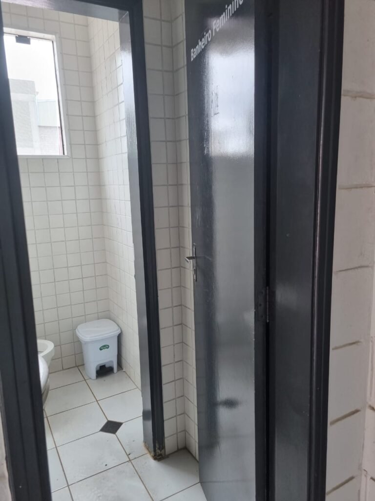 BANHEIRO FEMININO:- Piso frio cerâmico em ordem, paredes com pastilha cerâmica até o teto em ordem, porta de madeira com pintura em ordem, vitrô com puxador em ordem, vidro blindex em ordem, 02 luminárias duplas em ordem, 04 lâmpadas LED tubular em ordem, conjunto vaso sanitário e caixa acoplada de descarga cerâmica na cor branco em ordem, tampa do vaso sanitário de plástico em ordem, 02 espelhos de luz em ordem, 02 interruptores em ordem, 01 tomada em ordem, 01 ralo com tampa e desentupido, pia mármore branco em ordem, cuba cerâmica em ordem, torneira em ordem, sifão universal em ordem.