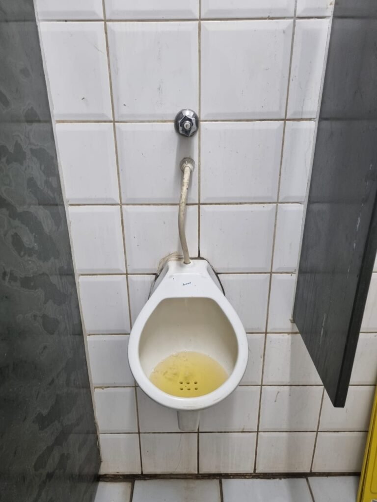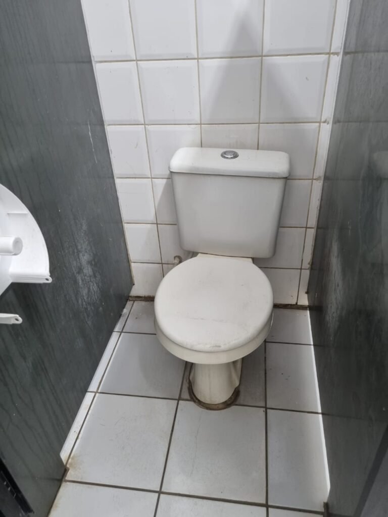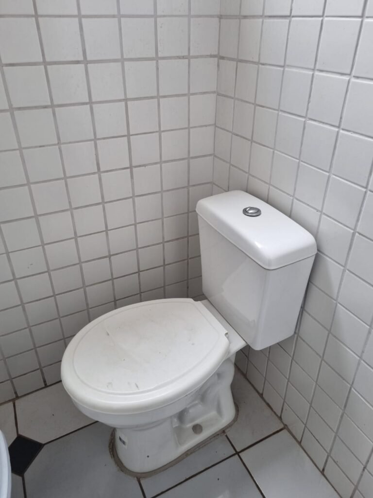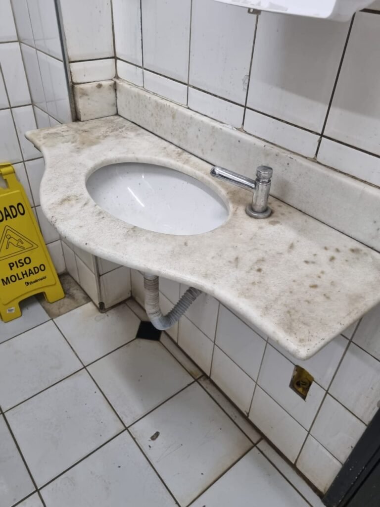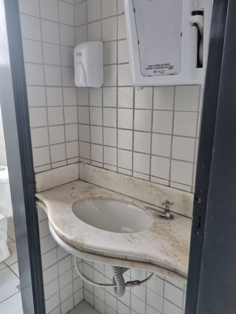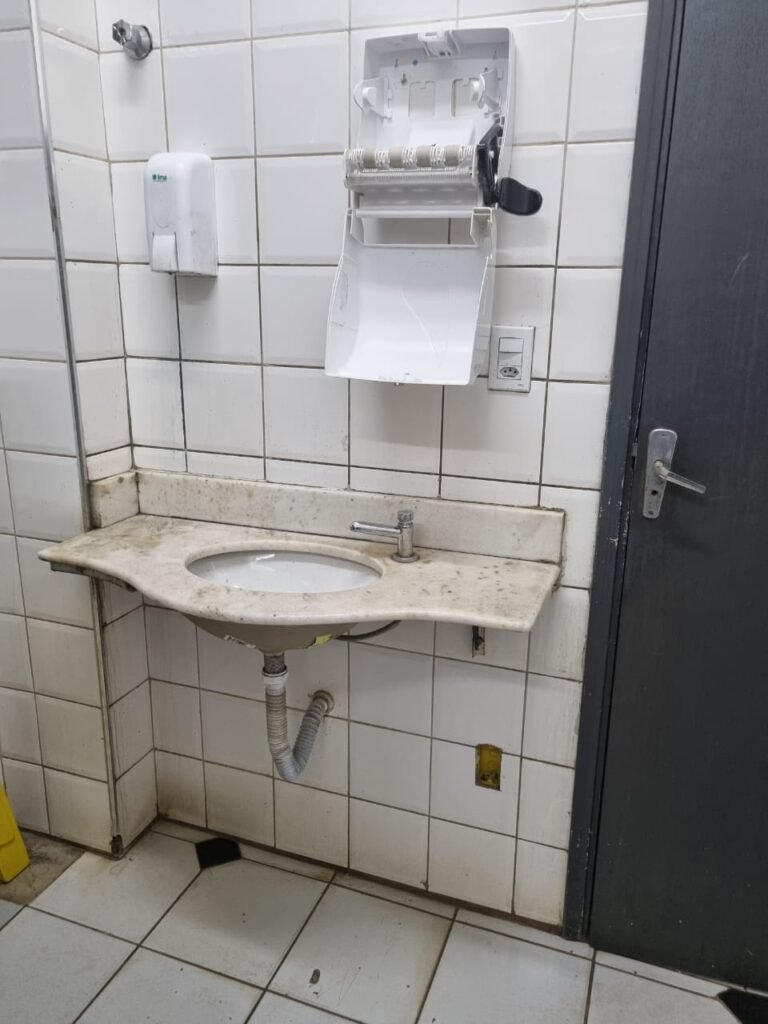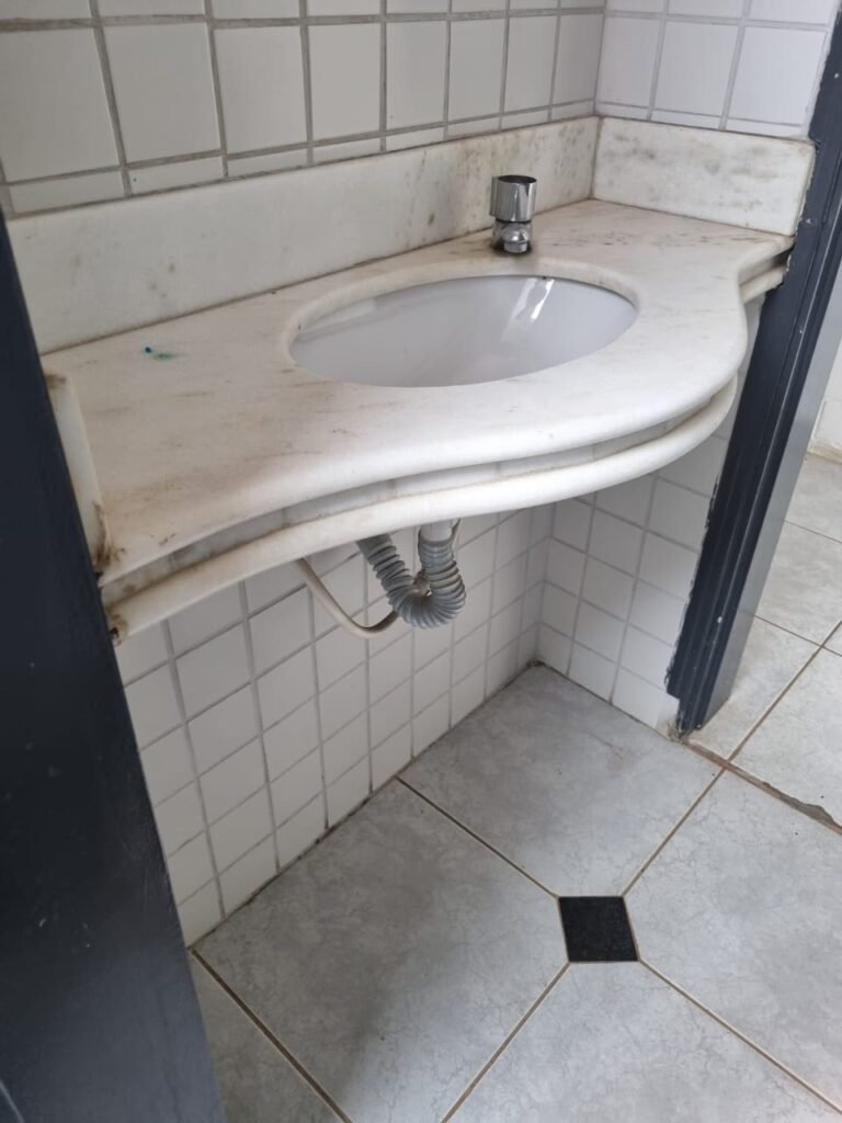 BANHEIRO MASCULINO:- Piso frio cerâmico em ordem, paredes com pastilha cerâmica até o teto em ordem, porta de madeira com pintura em ordem, vitrô sem puxador, vidro blindex em ordem, 02 luminárias duplas em ordem, 04 lâmpadas LED tubular em ordem, conjunto vaso sanitário e caixa acoplada de descarga cerâmica na cor branco em ordem, tampa do vaso sanitário de plástico em ordem, 02 espelhos de luz em ordem, 02 interruptores em ordem, 01 tomada em ordem, registro em ordem faltando tampo da canopla, 01 ralo com tampa e desentupido, pia mármore branco em ordem, cuba cerâmica em ordem, torneira faltando tampo na canopla restante em ordem, sifão universal em ordem.