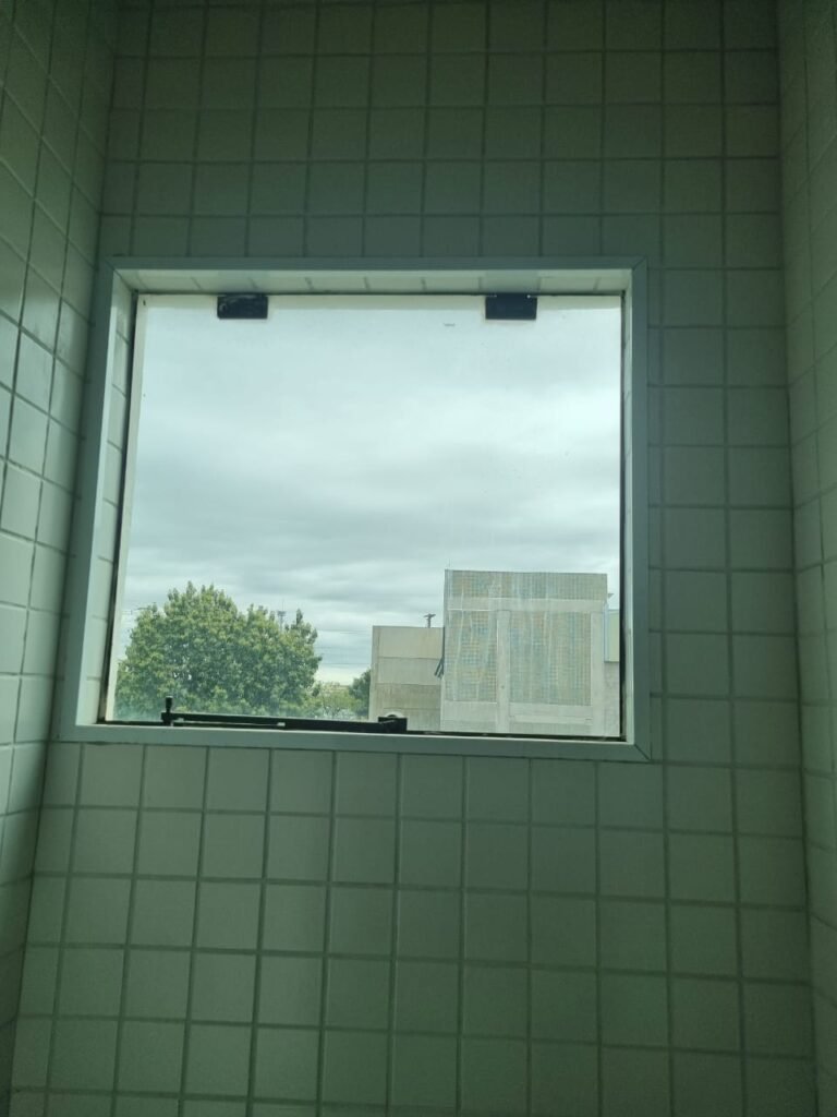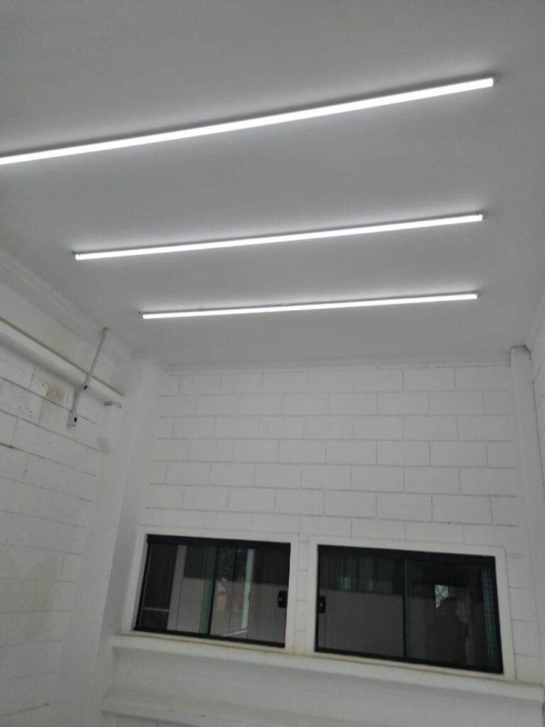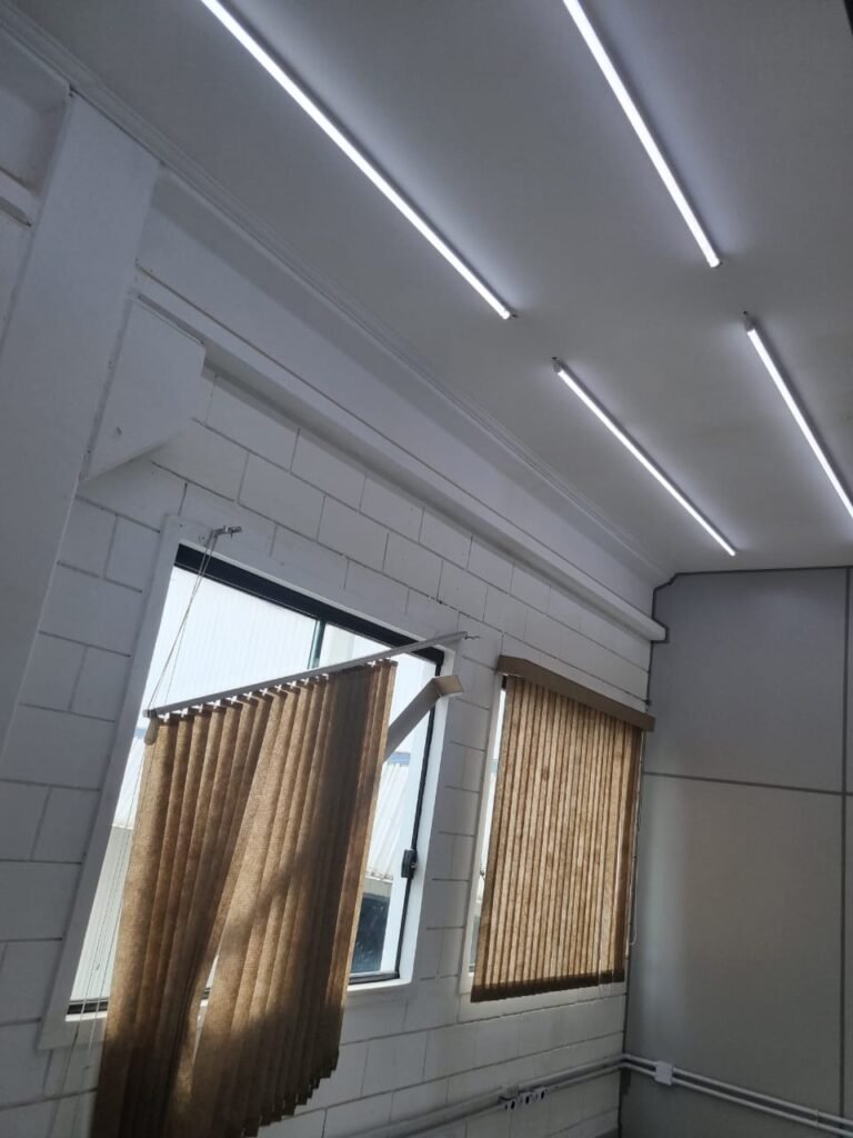 SALA ADMINISTATIVA:- Piso frio cerâmico em ordem, paredes com blocos aparente e pintura na cor branco neve em em ordem, teto e gola de gesso com pintura na cor branco neve em ordem, 01 portas de madeira com pintura na cor preto em ordem, fechadura sem chave e maçanetas em ordem, 05 Vitrô de correr com fechaduras e chaves em ordem, vidros blindex transparente em ordem, 03 persianas verticais sendo que 01 está quebrada restante em ordem, 10 lâmpadas tubulares em ordem, divisória de Duratex com 02 portas transparente em ordem, 01 luminária dupla e 08 lâmpadas LED tubulares.