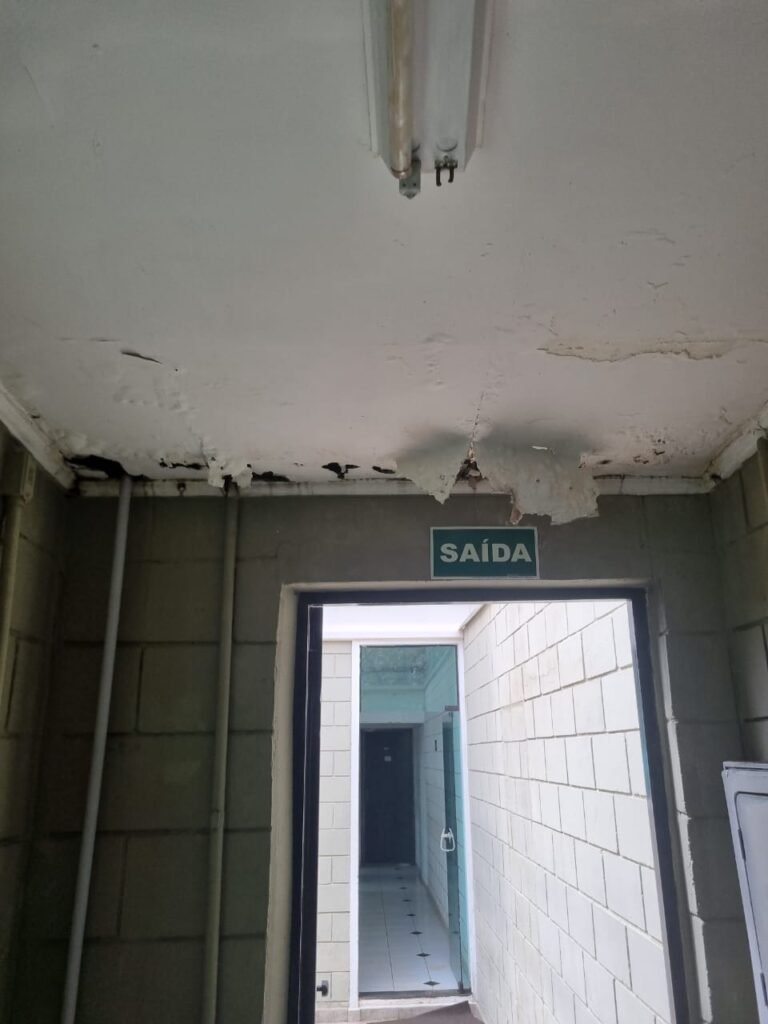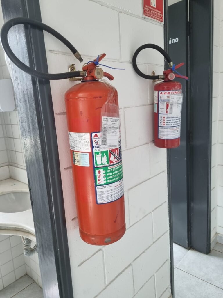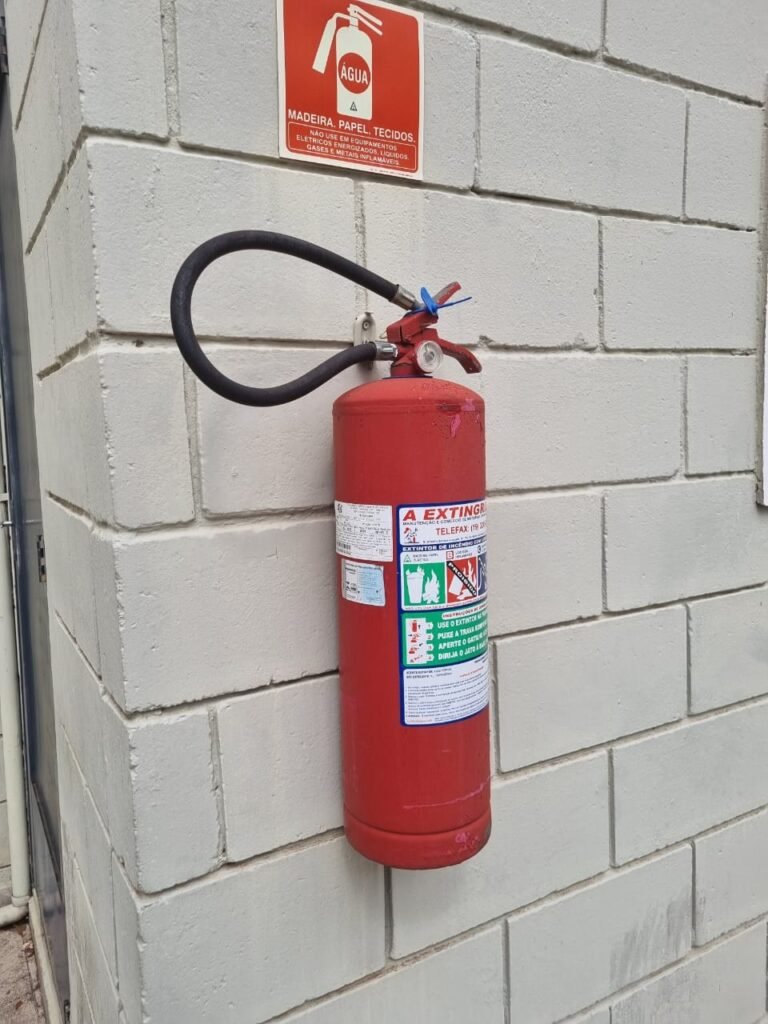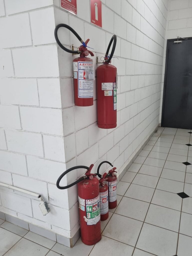 CORREDOR:- Piso frio cerâmico em ordem, paredes de bloco aparente com pintura na cor branco neve com manchas, 02 extintores: 01 de pó químico 04 KG 20-B:C com recarregado em agosto/2023, 01 água 10 litros 2-A com recarregado em agosto/2023.