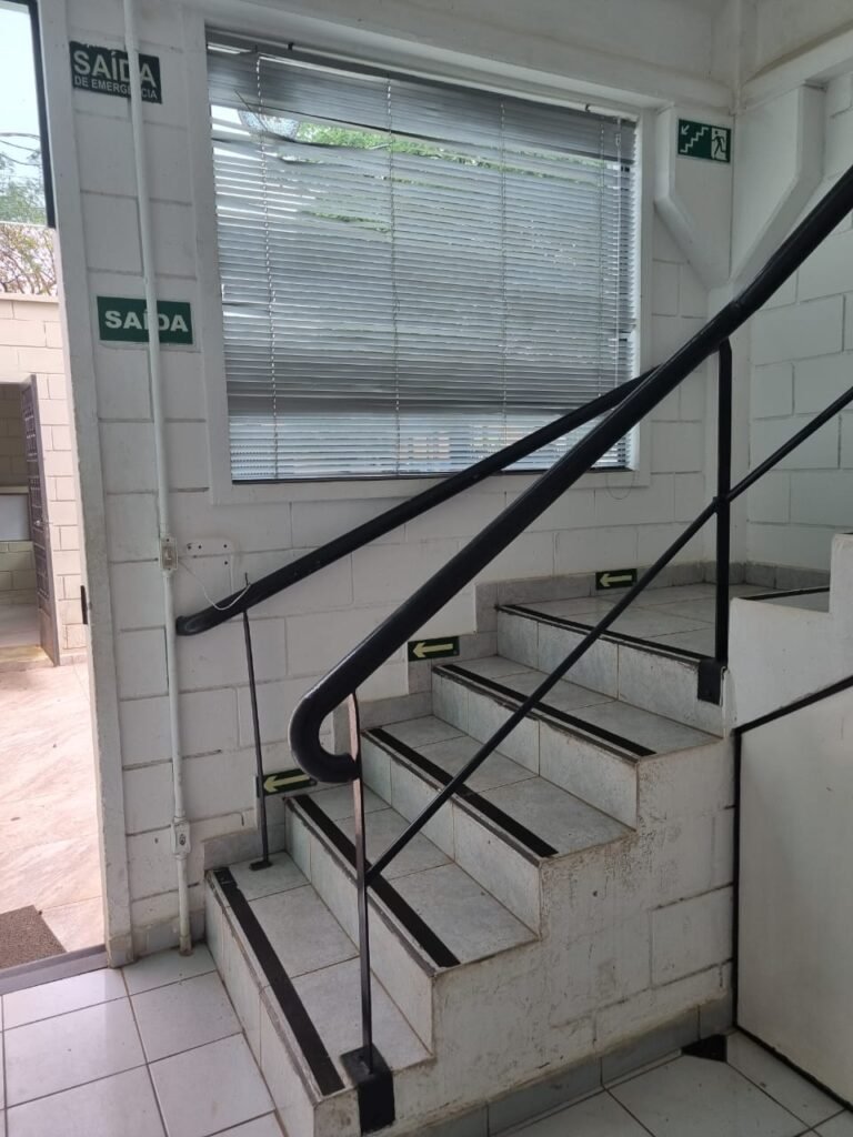 RECEPÇÃO/ESCADA:- Piso frio cerâmico em ordem, paredes de bloco aparente com pintura na cor branco neve, 02 luminárias duplas em ordem, 04 lâmpadas LED tubulares em ordem, escada de alvenaria revestida com piso frio cerâmico em ordem, corrimão e guarda-corpo de ferro tubular com pintura na cor preto, vitrô com vidro blindex em ordem, persiana horizontal em ordem, porta vidro blindex em ordem, maçanetas em ordem, fechadura e chave em ordem. COMODO: embaixo da escada com divisória e porta de Duratex em ordem, maçanetas em ordem.