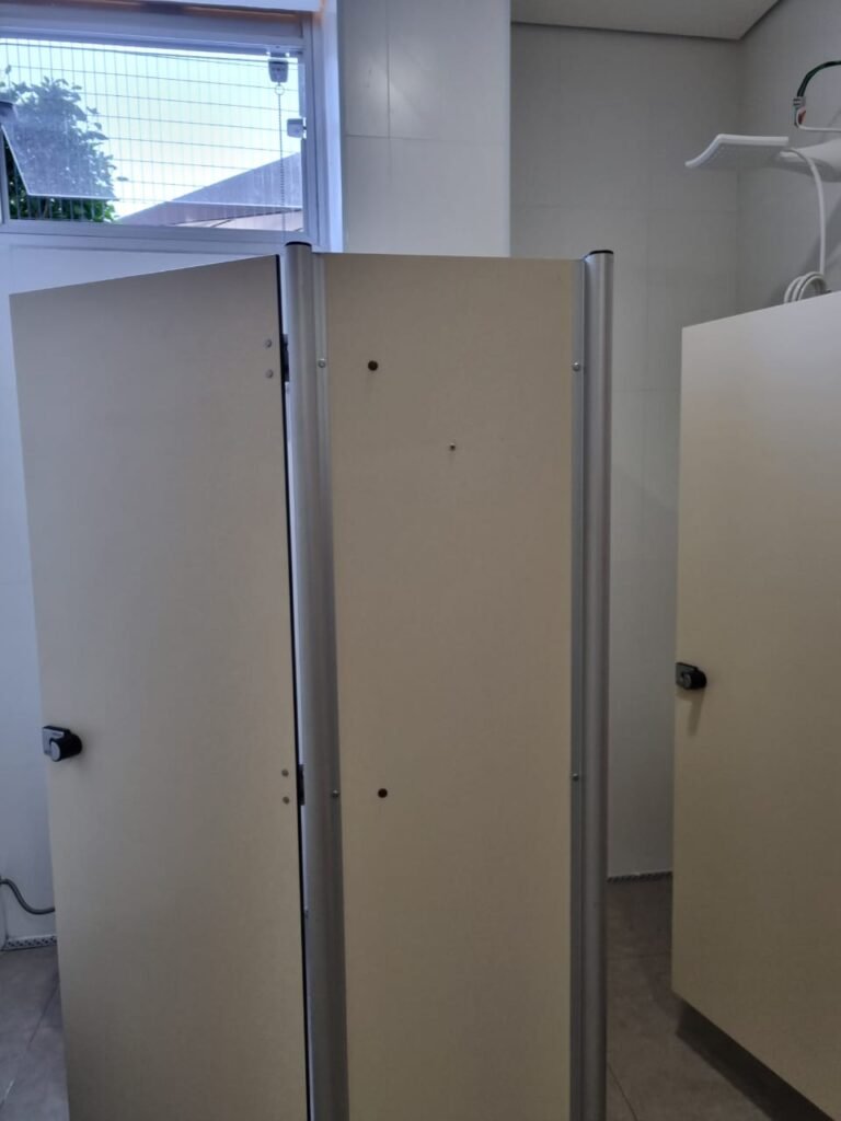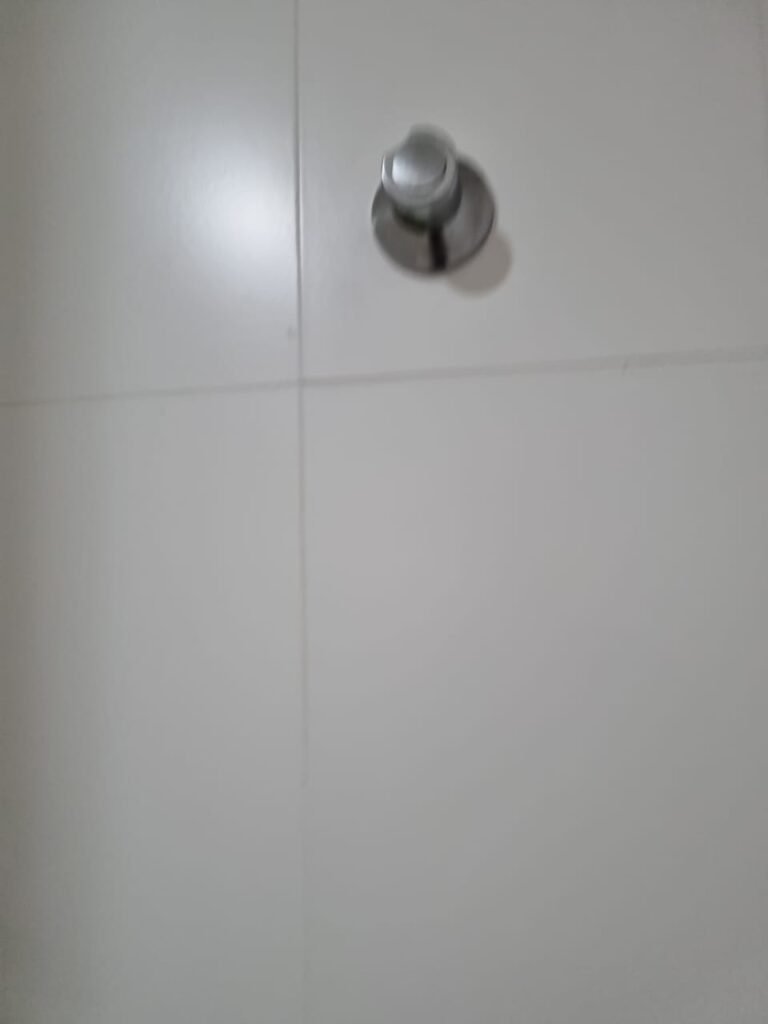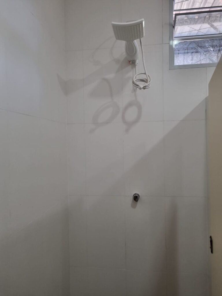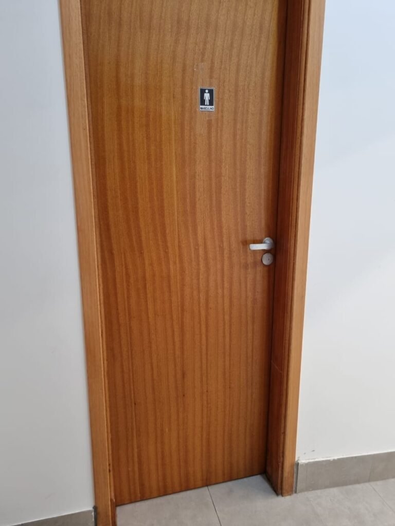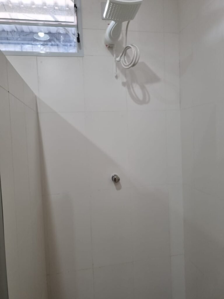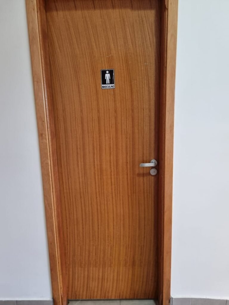 W.C MASCULINO:- Porta de madeira envernizada em ordem, maçanetas em ordem, fechadura e chave em ordem, piso porcelanato em ordem, azulejo até o teto, 01 mictório Deca cerâmica branca em ordem, descarga em ordem, pia mármore em ordem, 02 cubas cerâmica em ordem, 02 torneiras Celite, 02 sifão universal sanfonado em ordem, 02 divisórias com portas em ordem, maçanetas em ordem, 01 conjunto vaso sanitário e caixa acoplada descarga em ordem, tampa plástico em ordem, 01 chuveiro Lorenzetti Loren shower em ordem, 01 ralo tipo grelha em ordem.