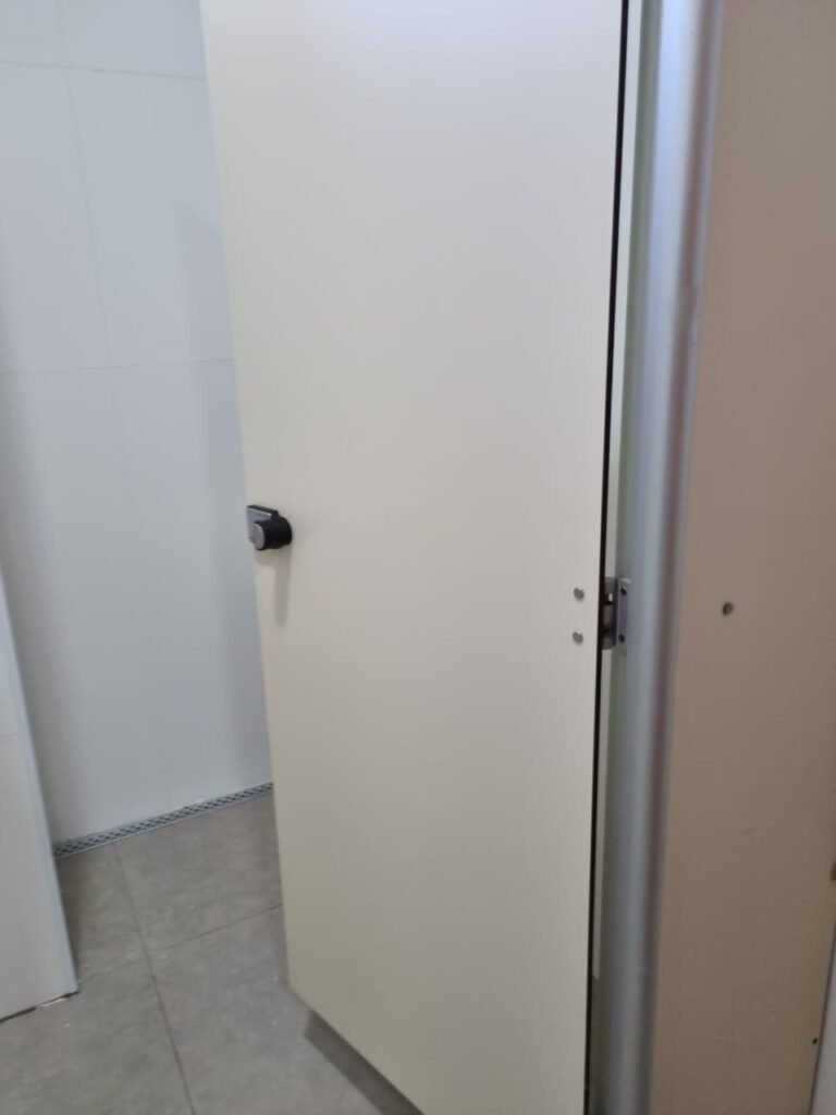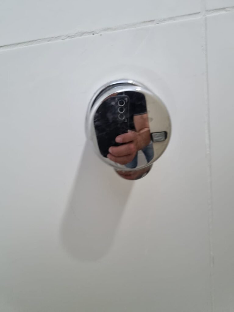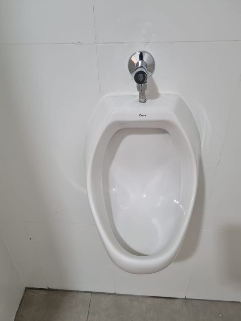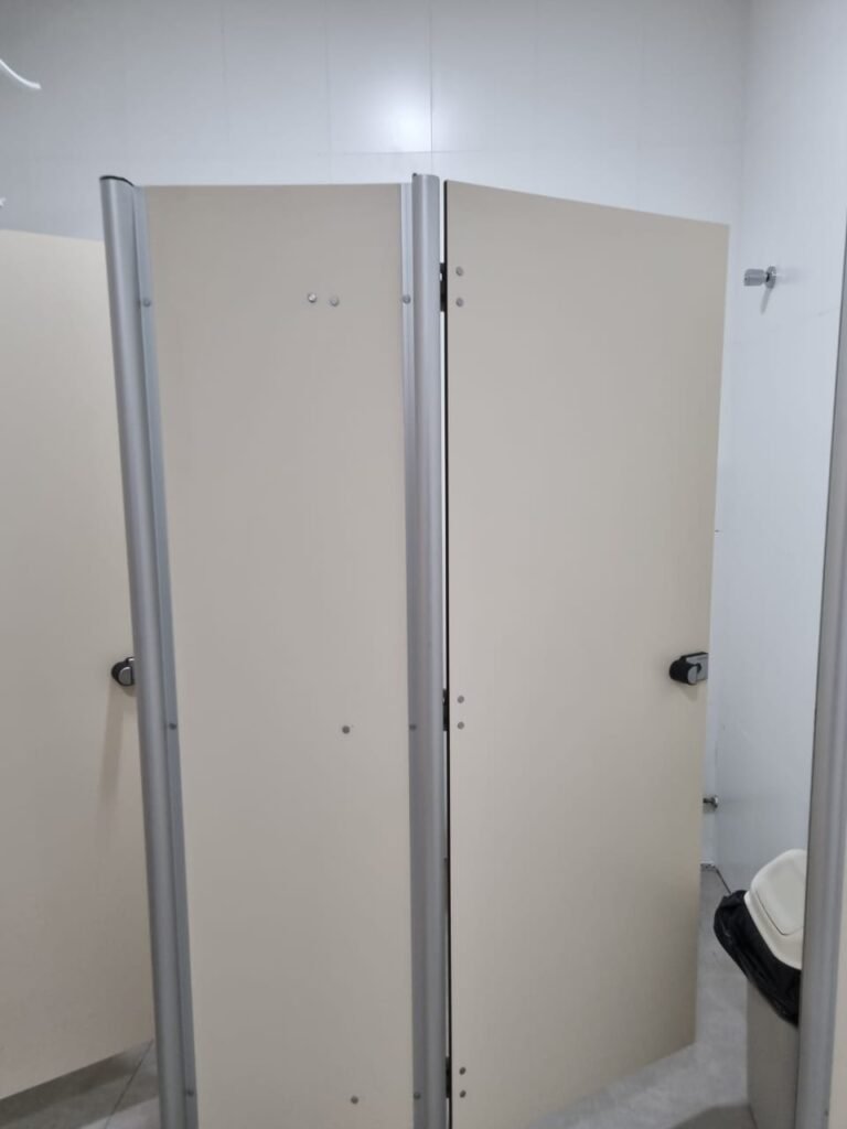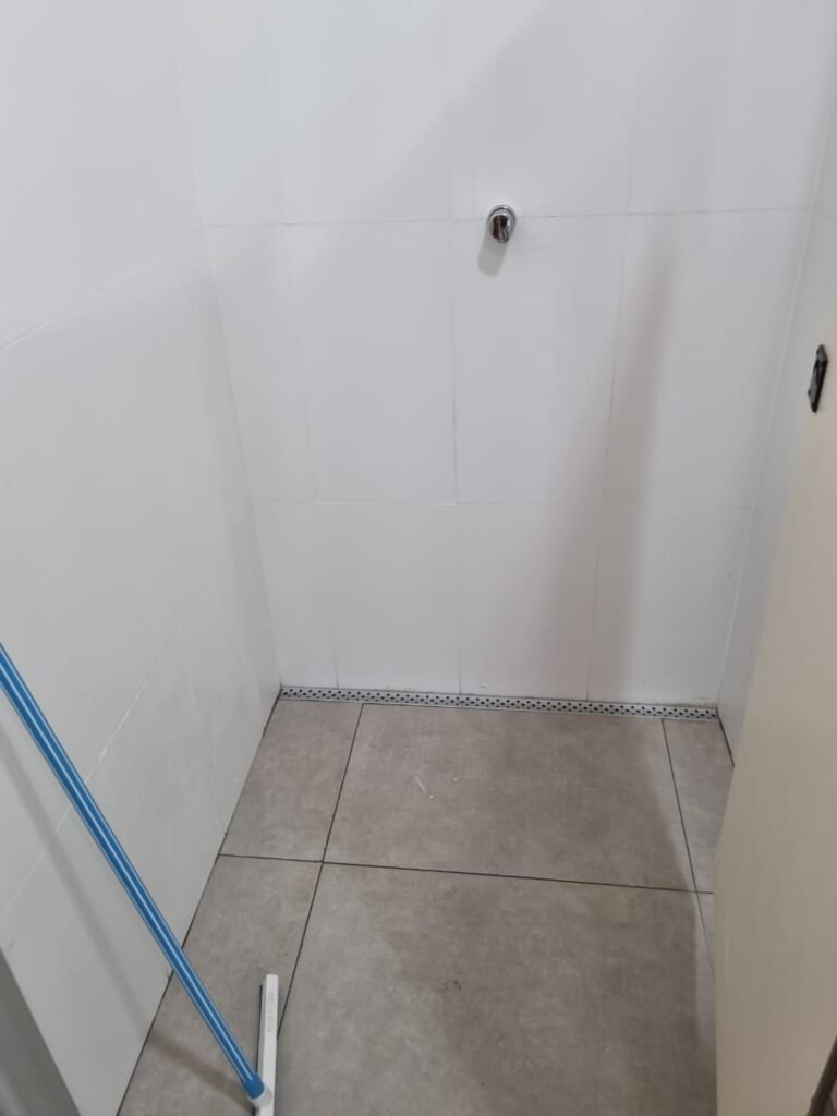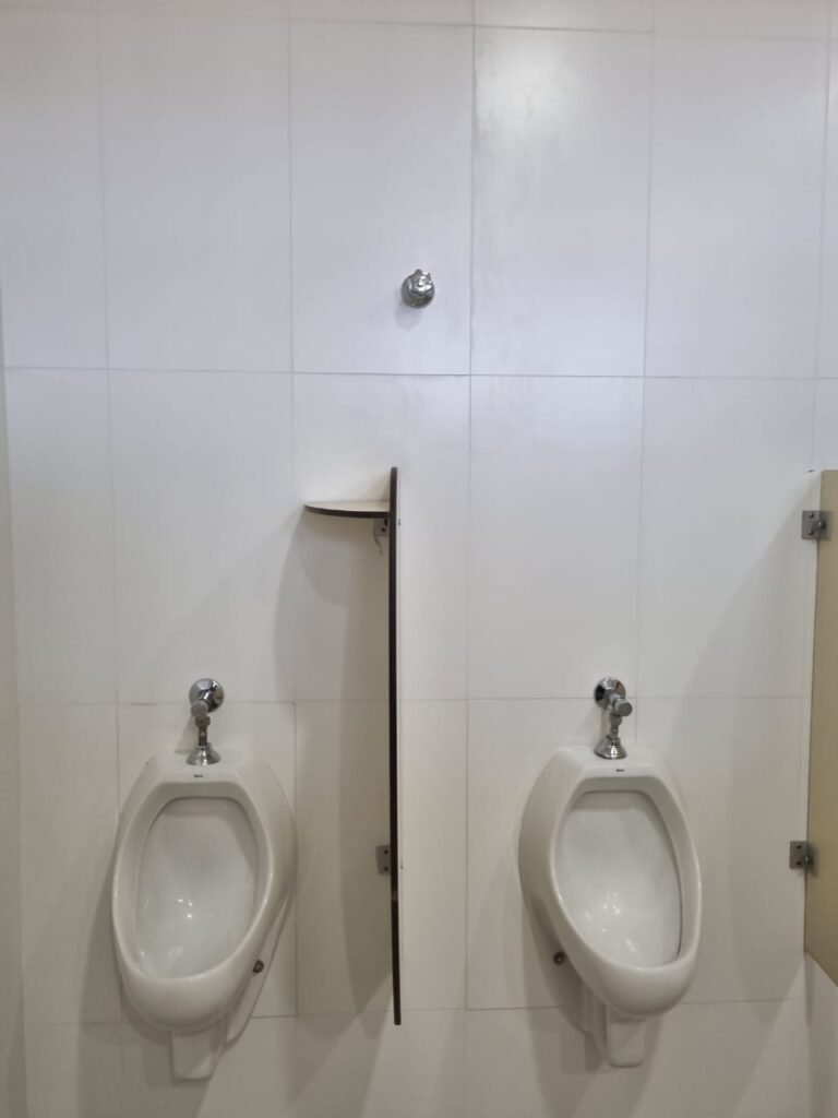 W.C MASCULINO:- Porta de madeira envernizada em ordem, maçanetas em ordem, fechadura e chave em ordem, piso porcelanato em ordem, azulejo até o teto, 01 mictório Deca cerâmica branca em ordem, descarga em ordem, pia mármore em ordem, 02 cubas cerâmica em ordem, 02 torneiras Celite, 02 sifão universal sanfonado em ordem, 02 divisórias com portas em ordem, maçanetas em ordem, 01 conjunto vaso sanitário e caixa acoplada descarga em ordem, tampa plástico em ordem, 01 chuveiro Lorenzetti Loren shower em ordem, 01 ralo tipo grelha em ordem.